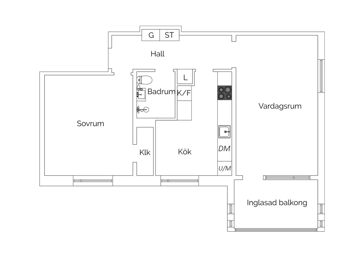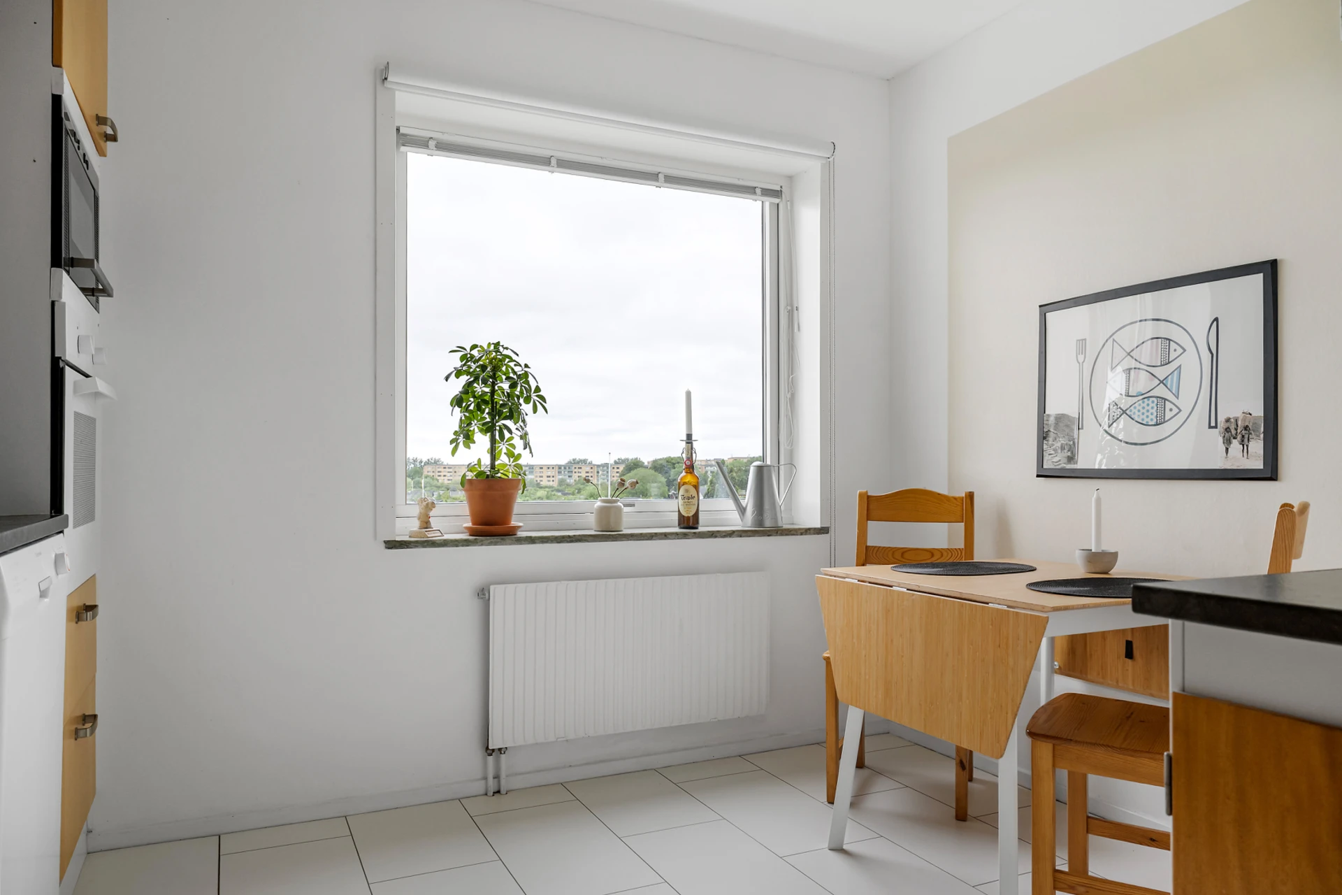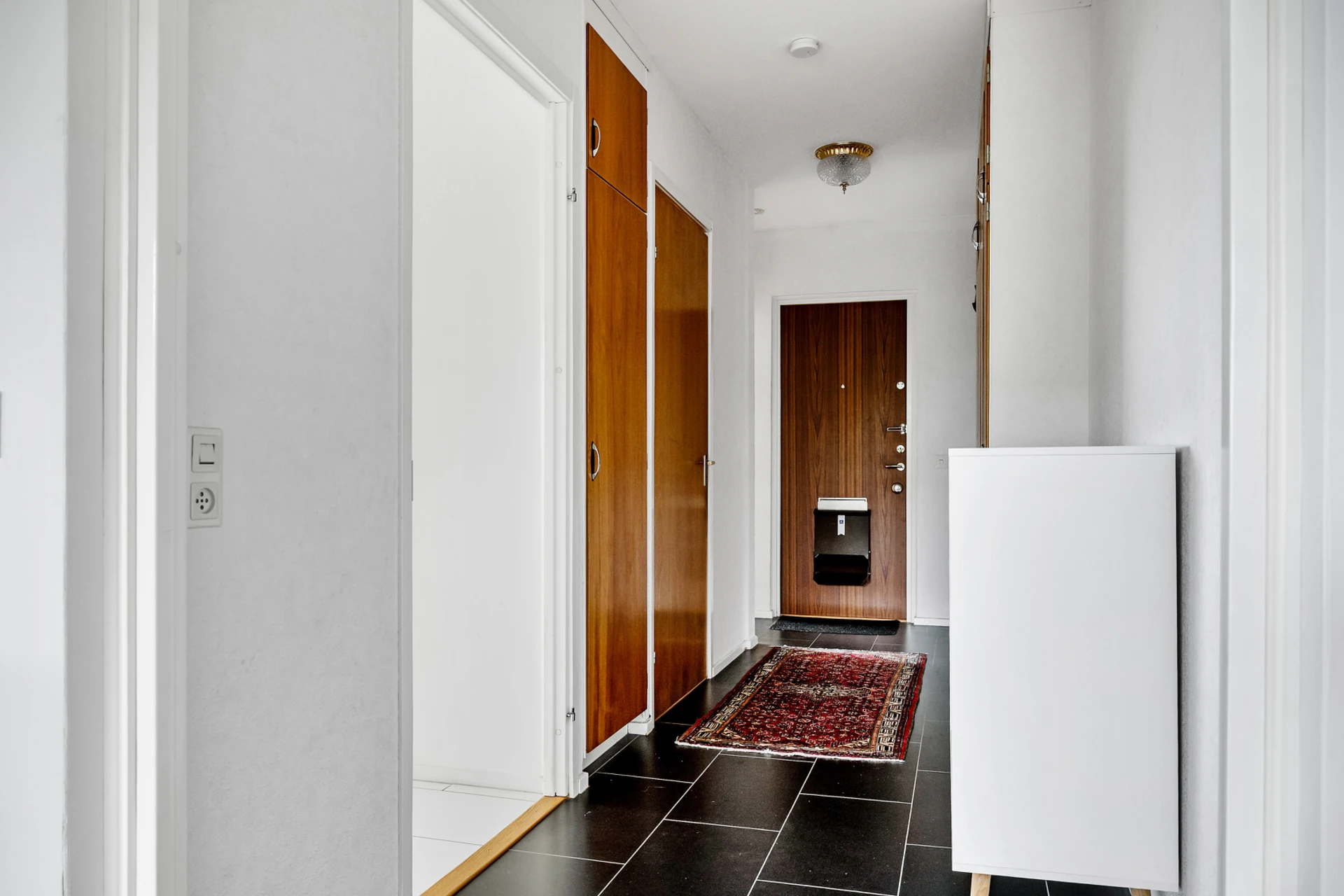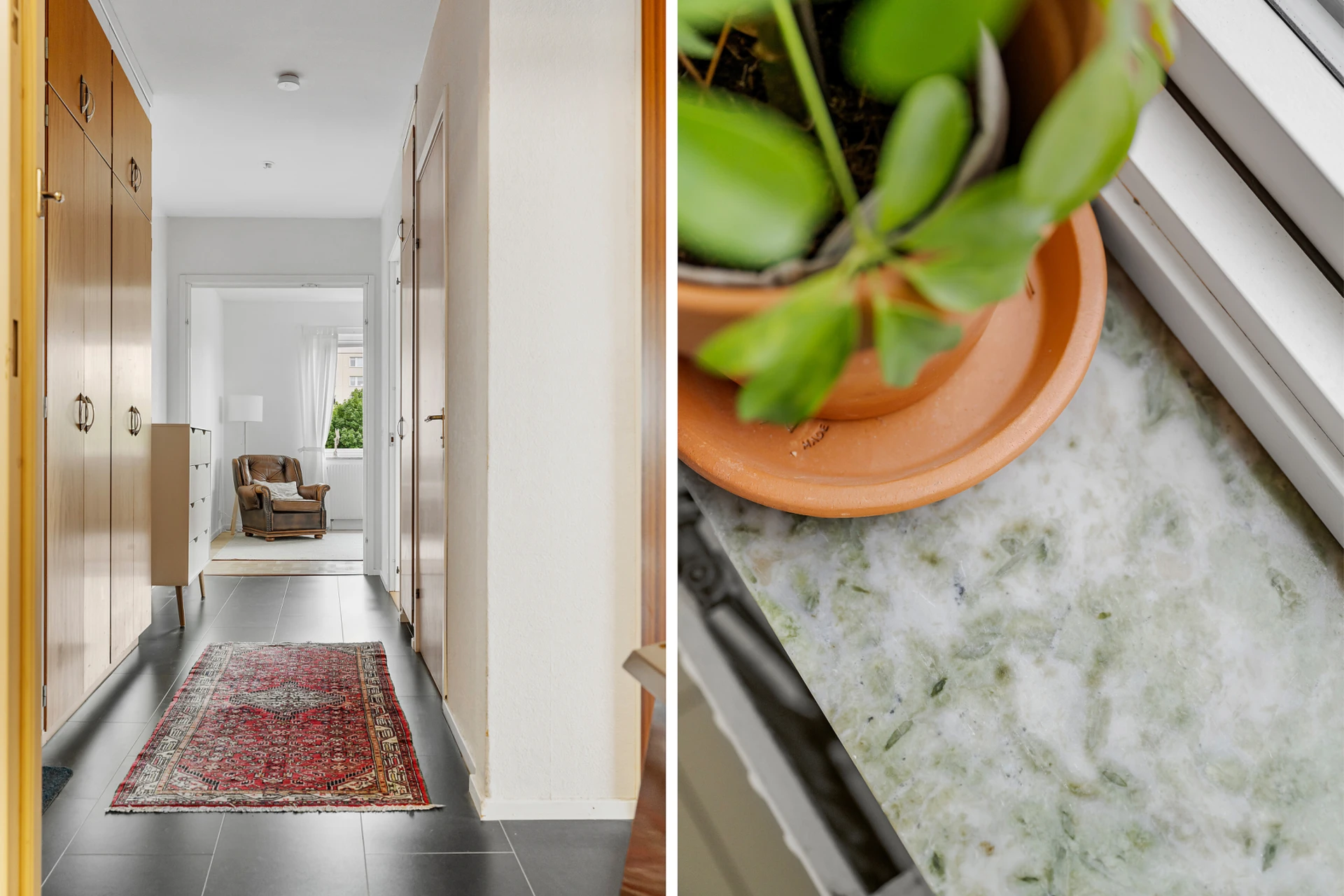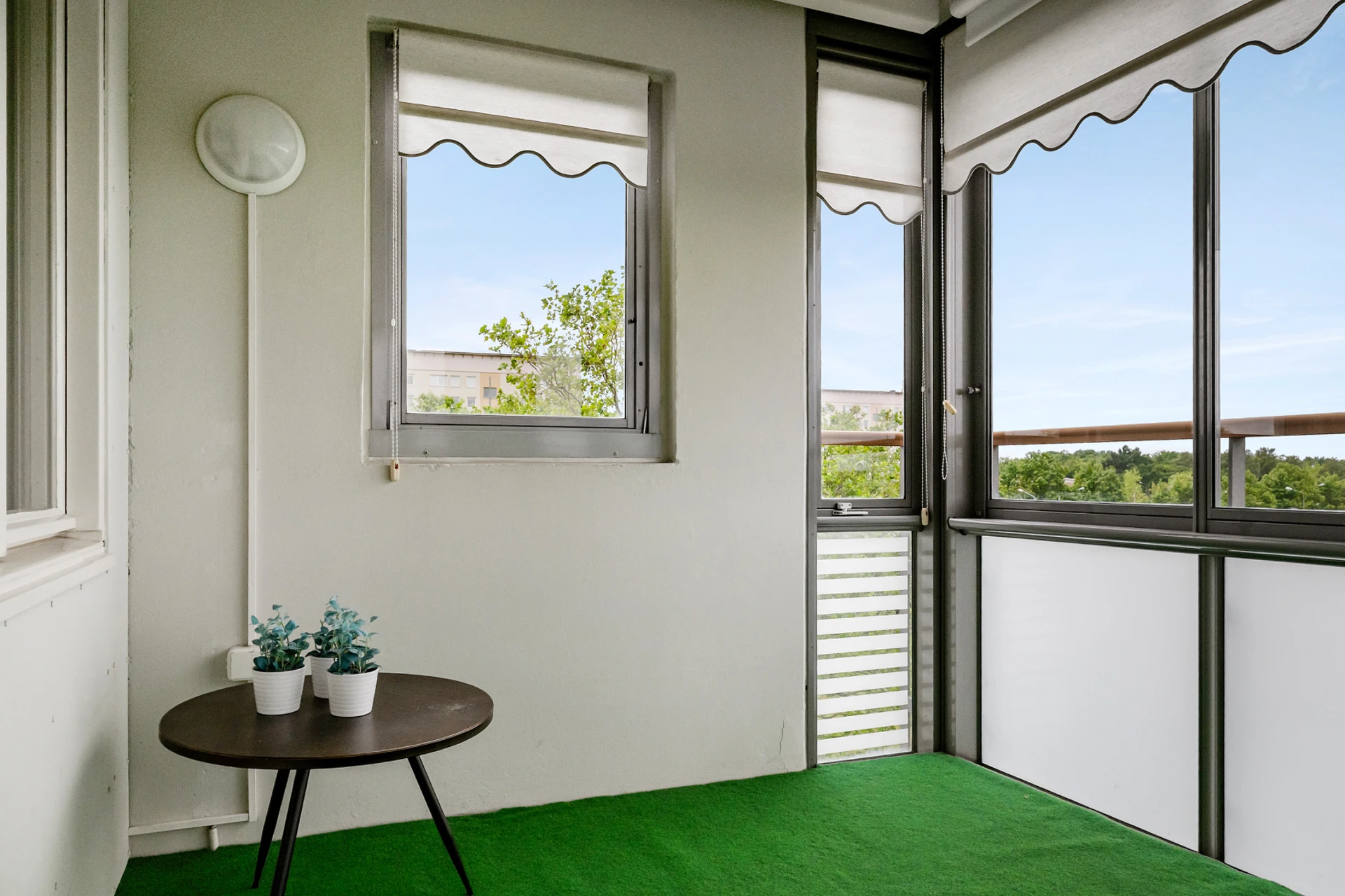 Vi tar hissen från markplan upp till fjärde våningen och välkomnas av denna välplanerade hörntvåa på grönskande läge. Här möts vi av de ljusa ytskikten som på ett vackert sätt samspelar med de tilltagna fönsterpartierna och som skapar en alltigenom inbjudande atmosfär. Vardagsrummet är luftigt med plats för både soffgrupp samt matgrupp och härifrån når vi också den generösa inglasade balkongen i härligt västerläge. Tack vare inglasningen blir balkongen som ett extra rum under stora delar av året och här avnjuts gärna mysiga kvällar med nära och kära samtidigt som vi njuter av den fantastiska utsikten över lummig gård och de pittoreska stugorna på Ärtholmens sommarstad. Oavsett från vilket rum vi blickar ut från är utsikten luftig samt fri och frihetskänslan är total. Köket är fullt utrustat med matplats, vi har fina golv i original och förvaring tar klädkammaren och garderoberna hand om.