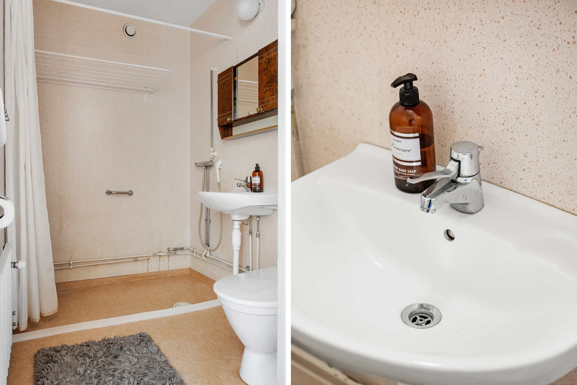 Beige våtrumsmatta och våtrumstapet. WC, handfat, spegelskåp och dusch.