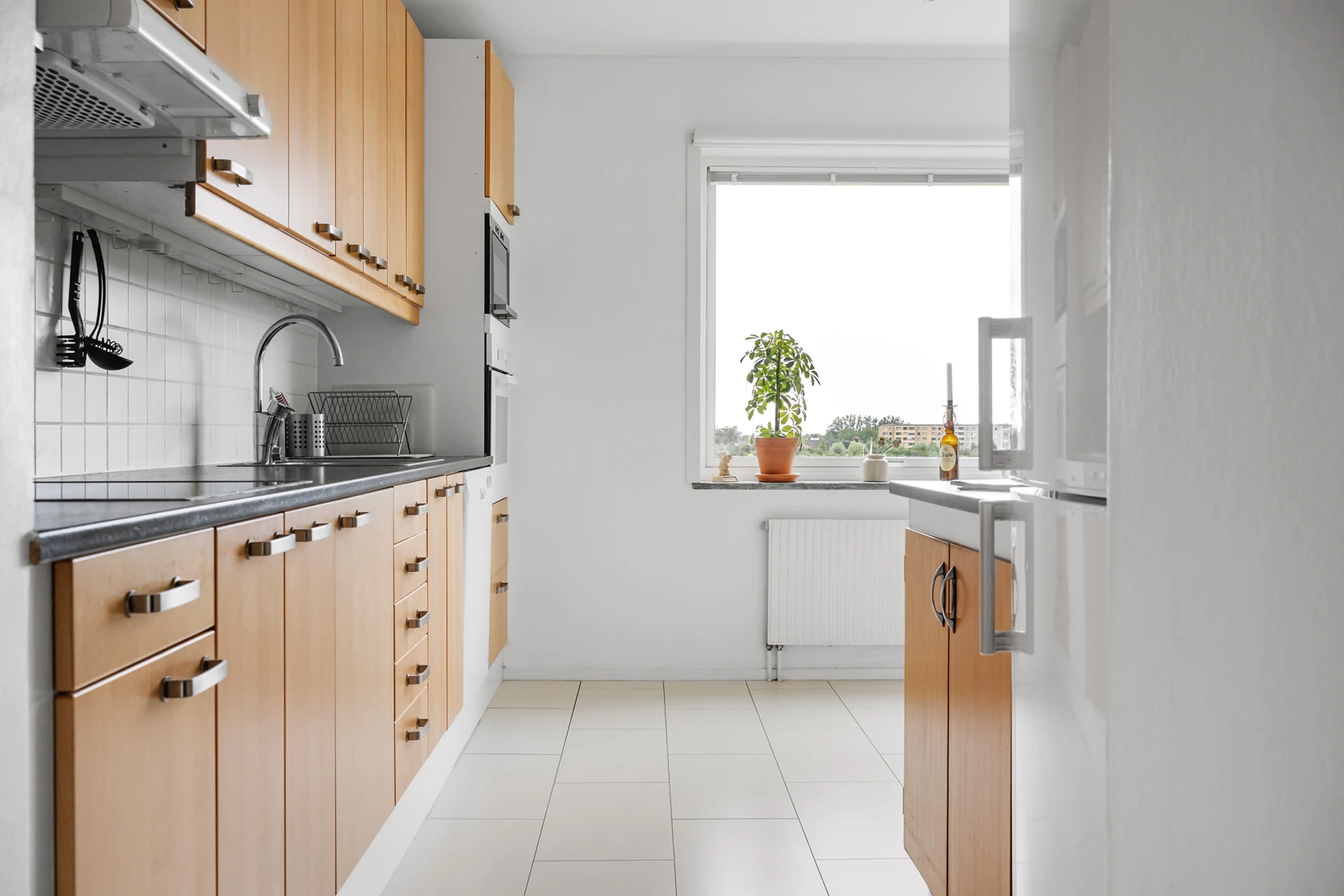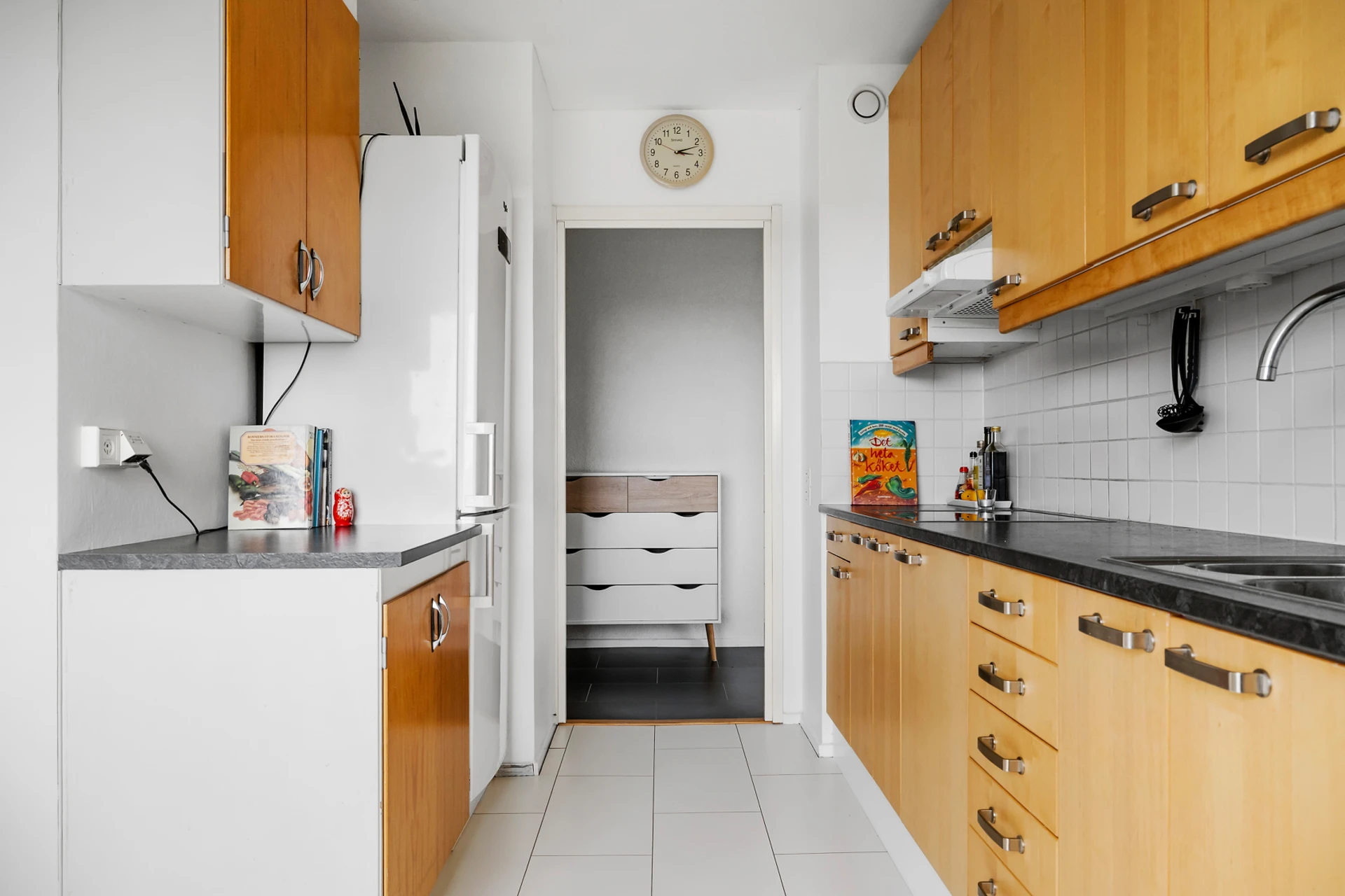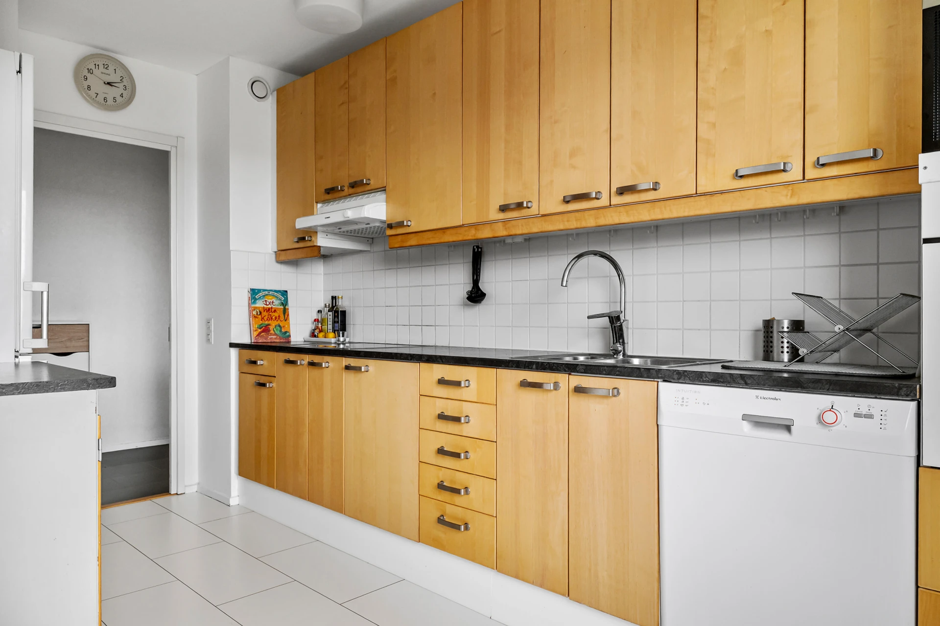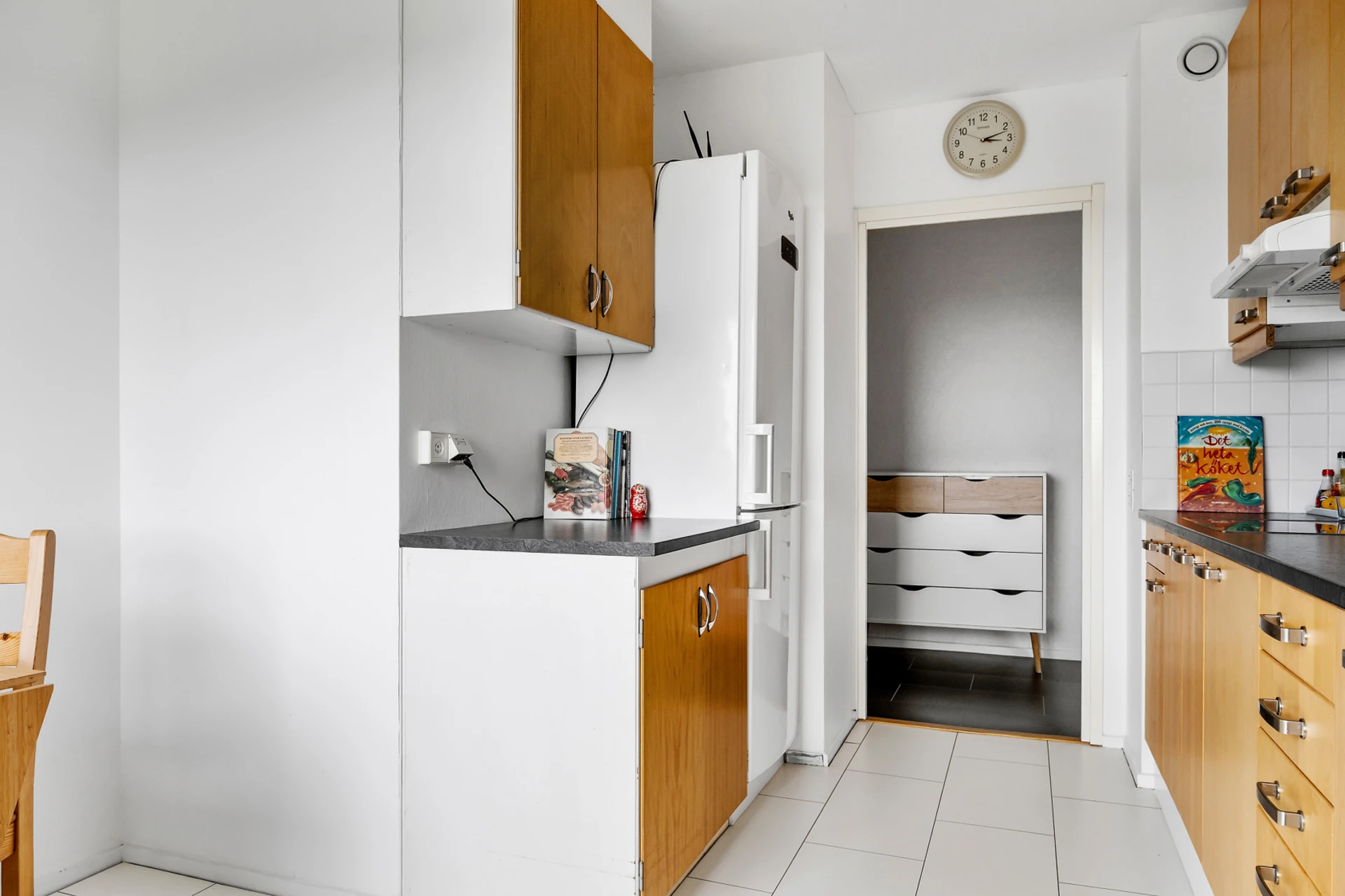 Ljus klinker och vita väggar. Köksinredning i bok och original i teak samt ljust kakel ovan arbetsbänk i laminat, vid originalinredningen är det arbetsbänk i sten. Kyl/frys, keramisk spishäll, fläkt, diskmaskin och inbyggd ugn samt mikrovågsugn.