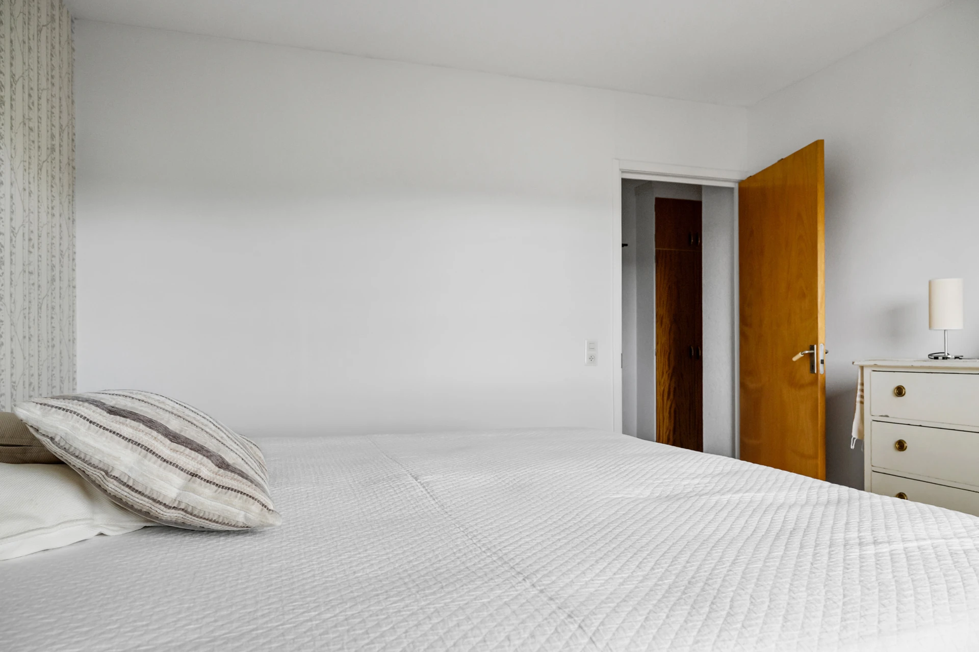 Parkettgolv i original och vita väggar samt mönstrad tapet. Klädkammare.