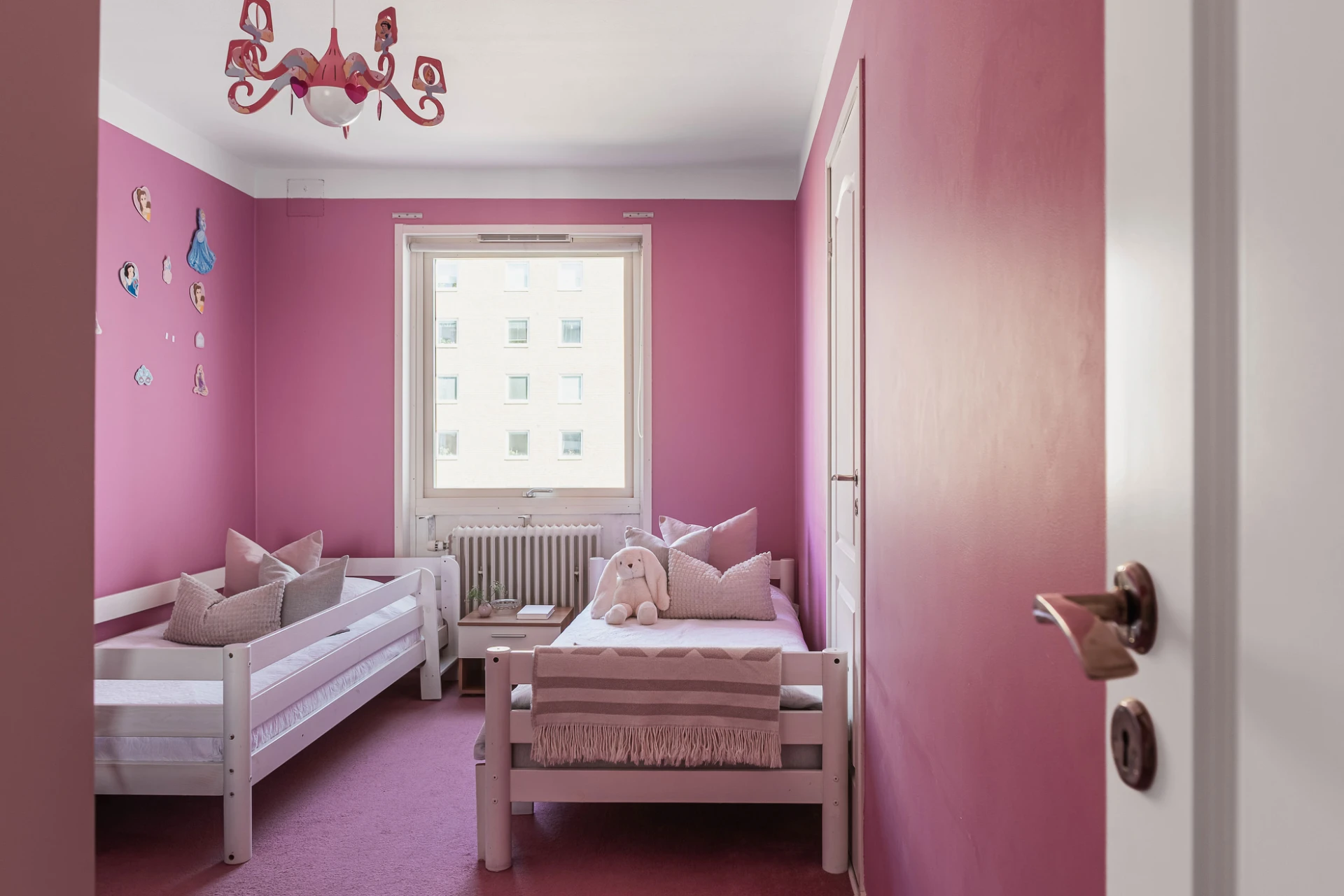 Laminatgolv och ljusa väggar samt en ljus mönstrad fondvägg. Utgång till inglasad balkong i sydväst.