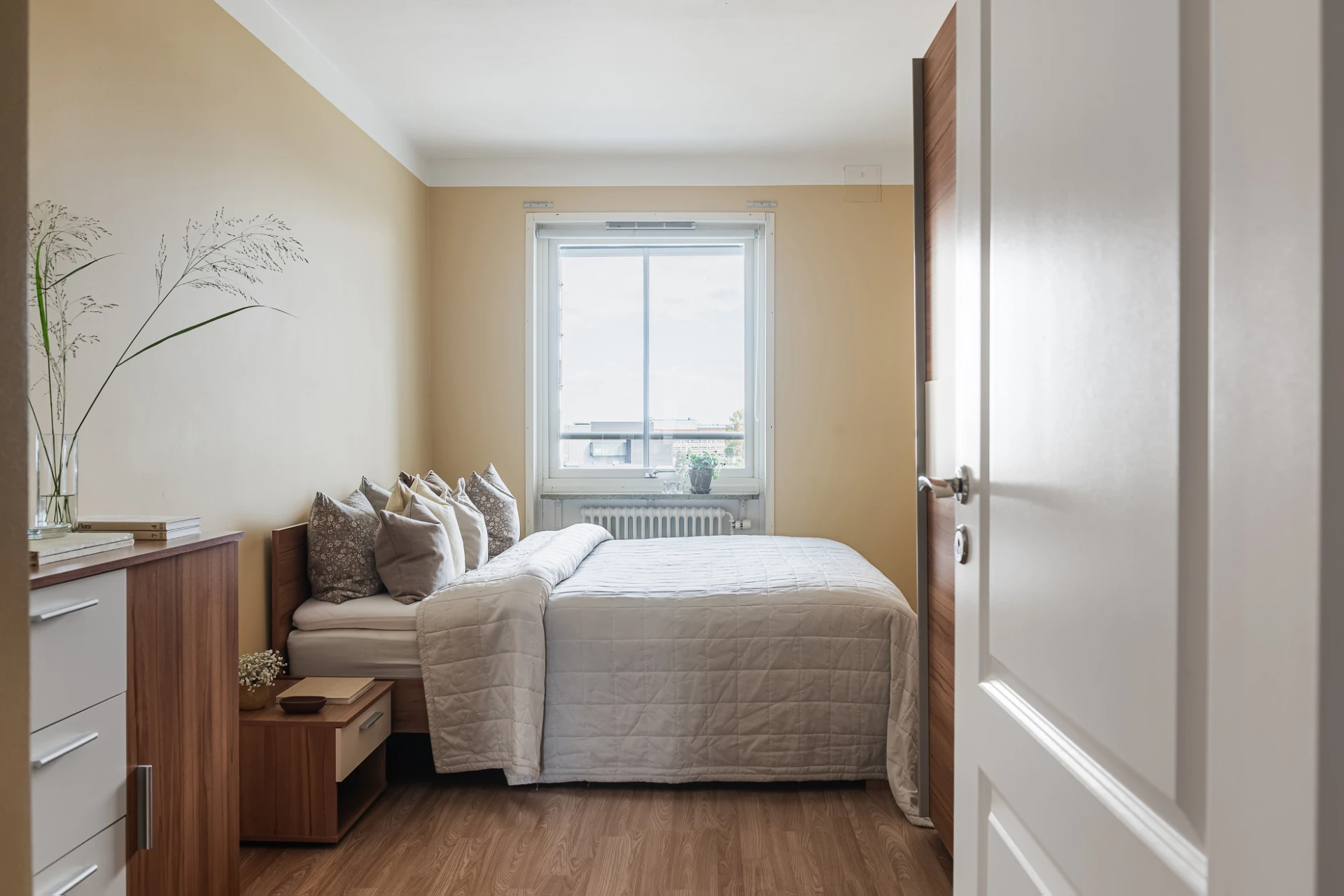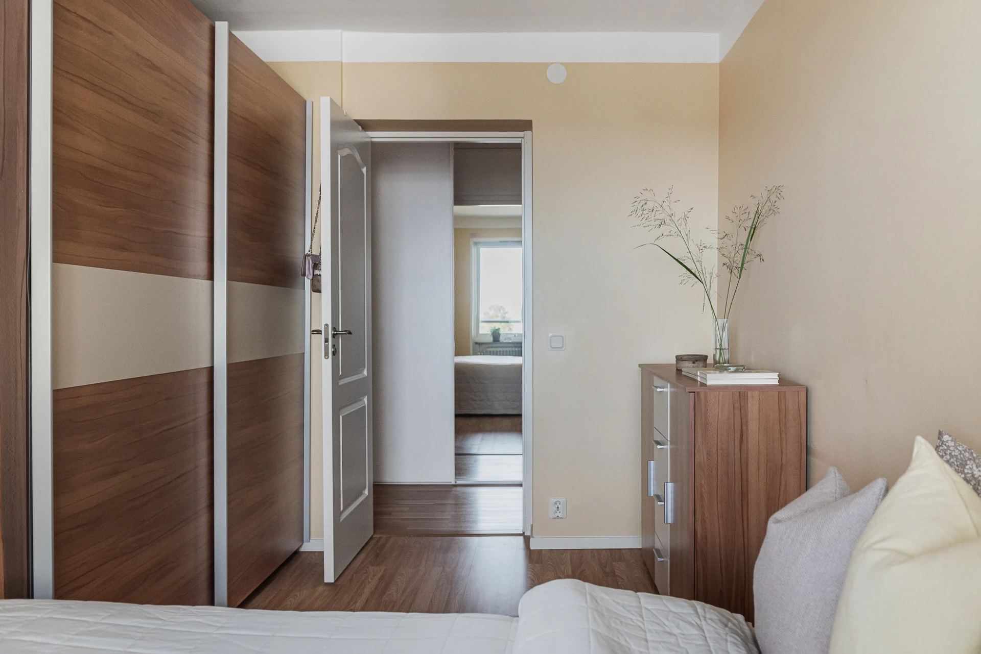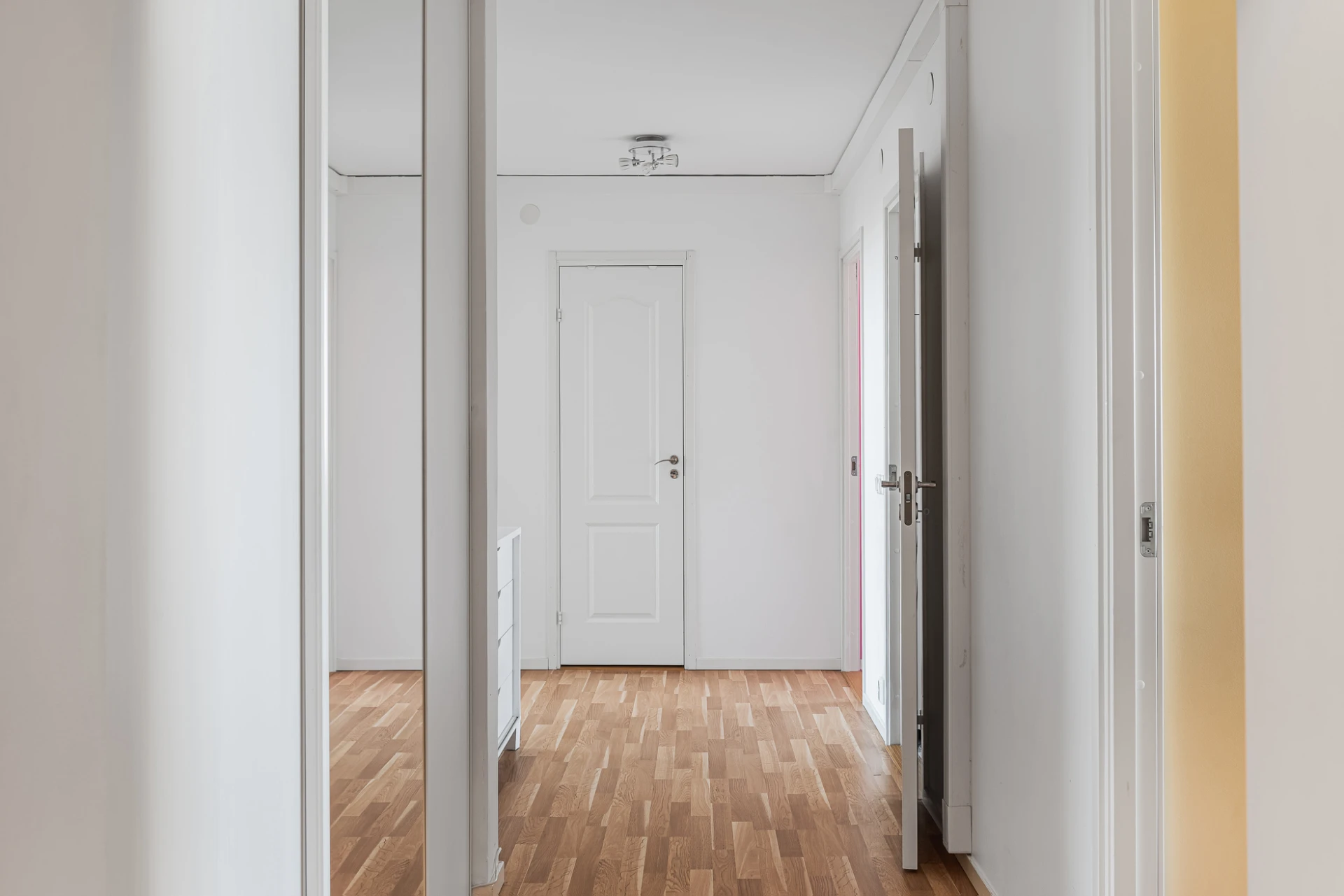 Laminatgolv och vita väggar samt skjutdörrsgarderob.