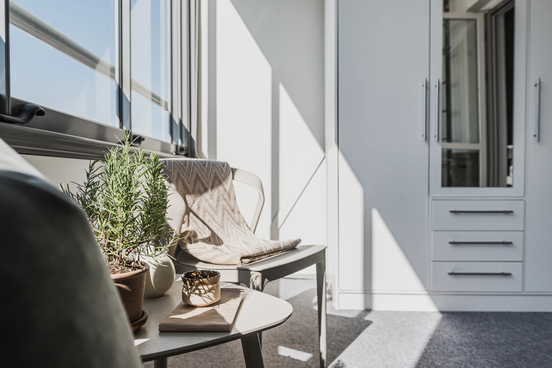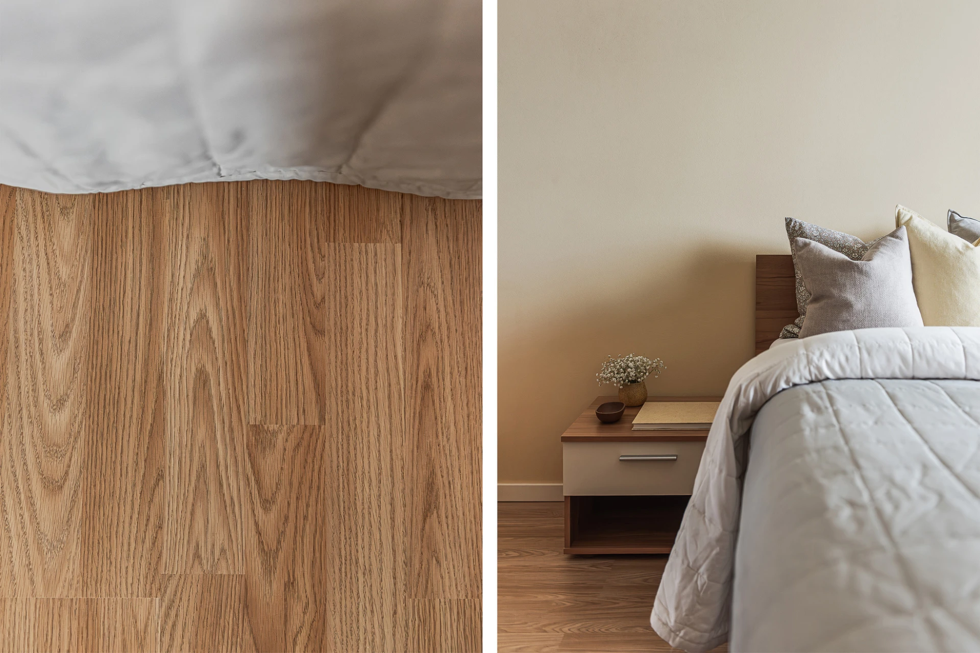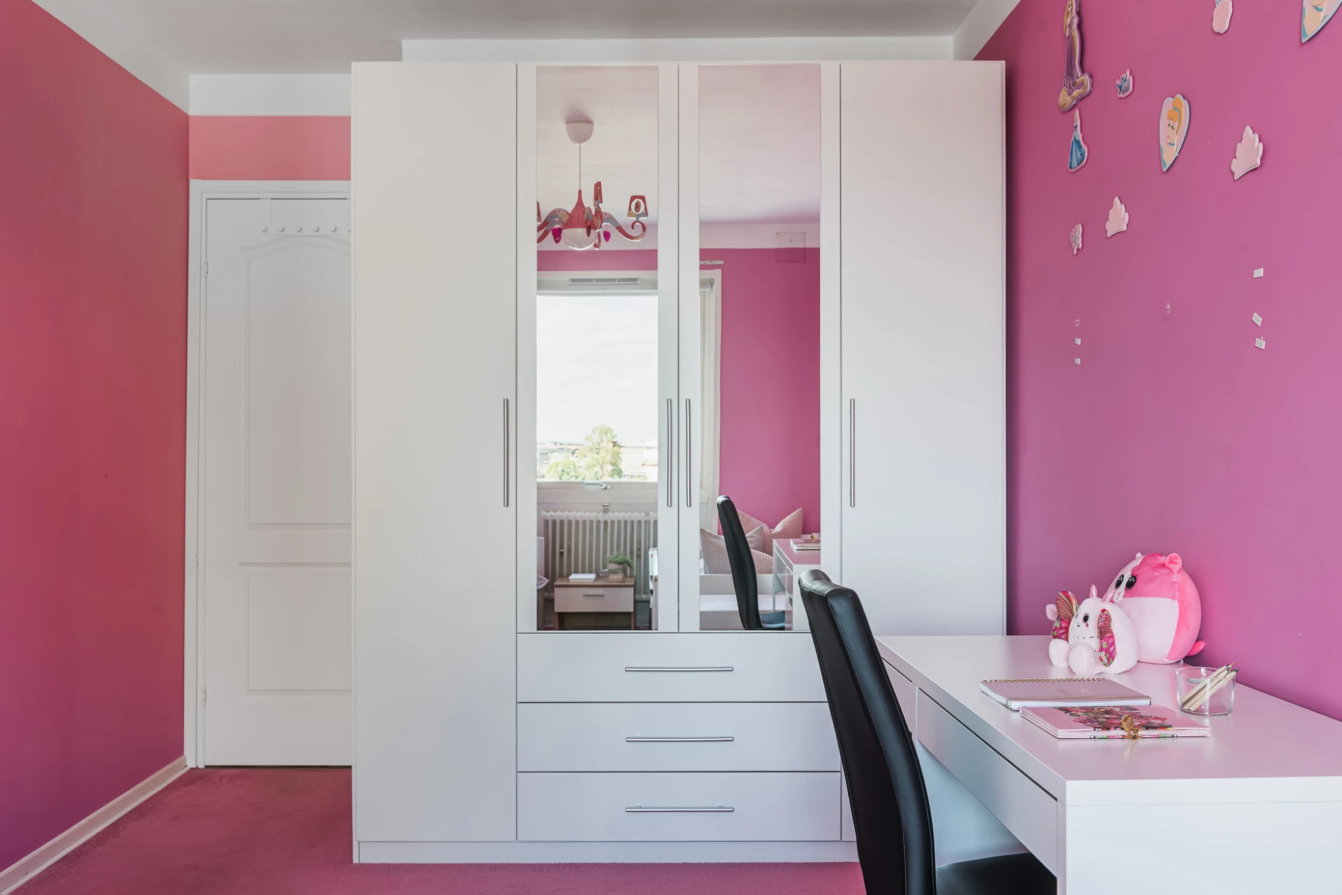 Laminatgolv och vita väggar samt skjutdörrsgarderob.