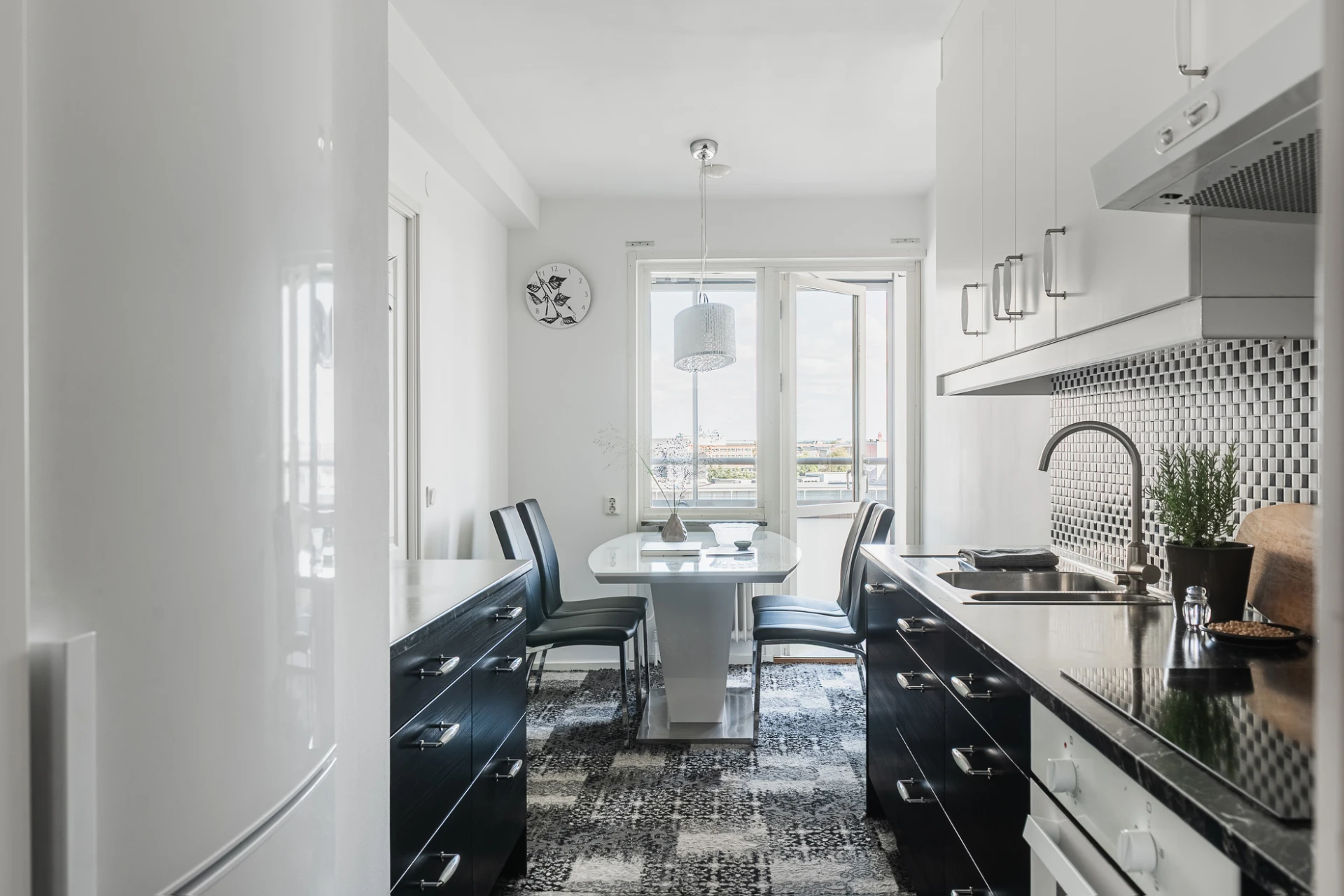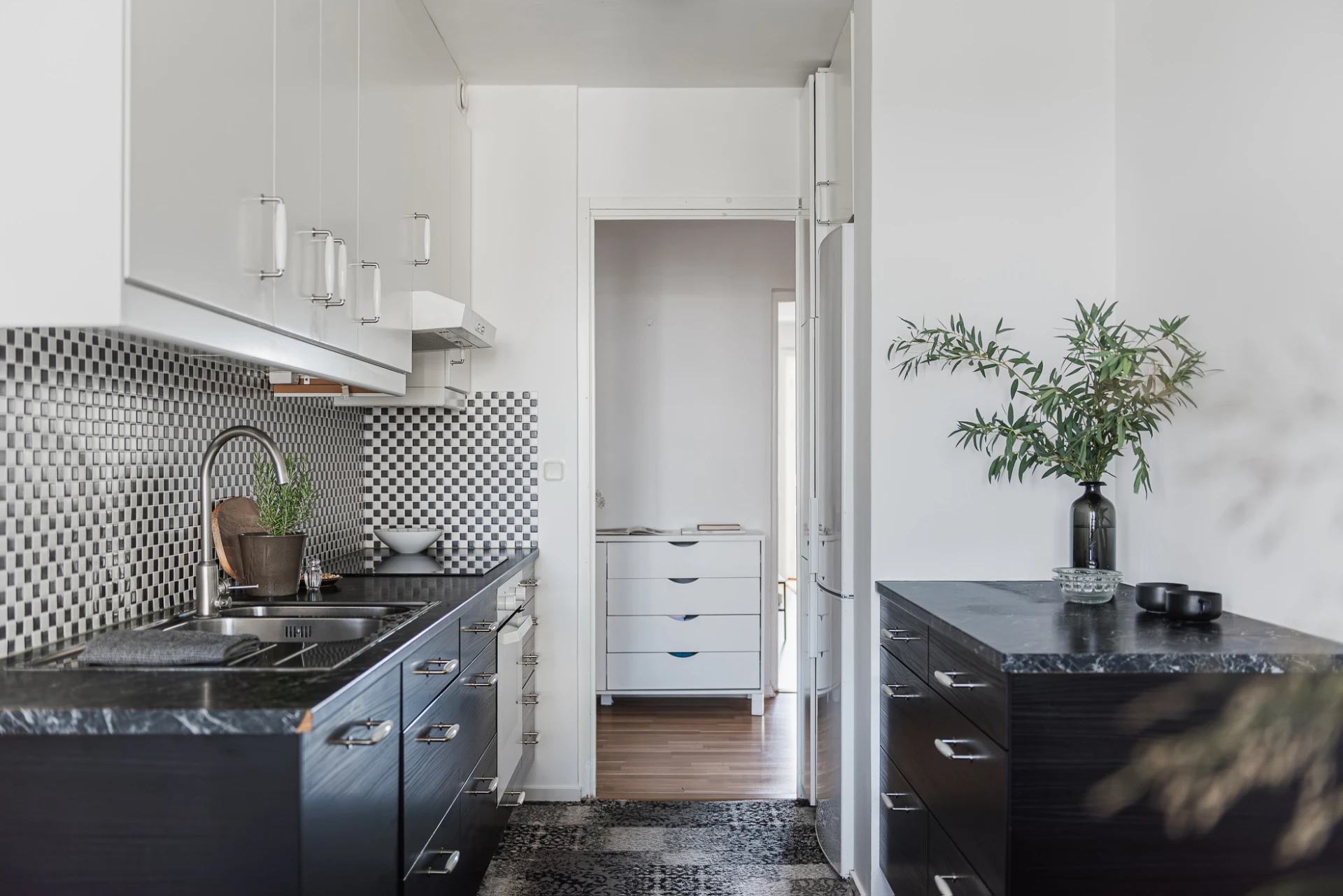 Mönstrat laminatgolv och vita väggar. Vit och svart köksinredning samt mosaik ovan arbetsbänk i laminat. Köket är utrustat med kyl, frys, inbyggd ugn, keramisk glashäll, fläkt och integrerad diskmaskin. Utgång till inglasad balkong i nordost.