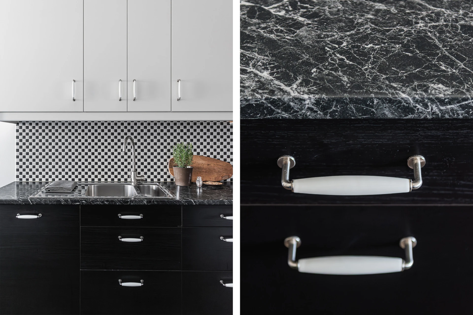 2017 rustades köket upp med nya väggskåp intill kyl och frys. Kökshyllorna är även målade och luckorna har fått nya beslag.