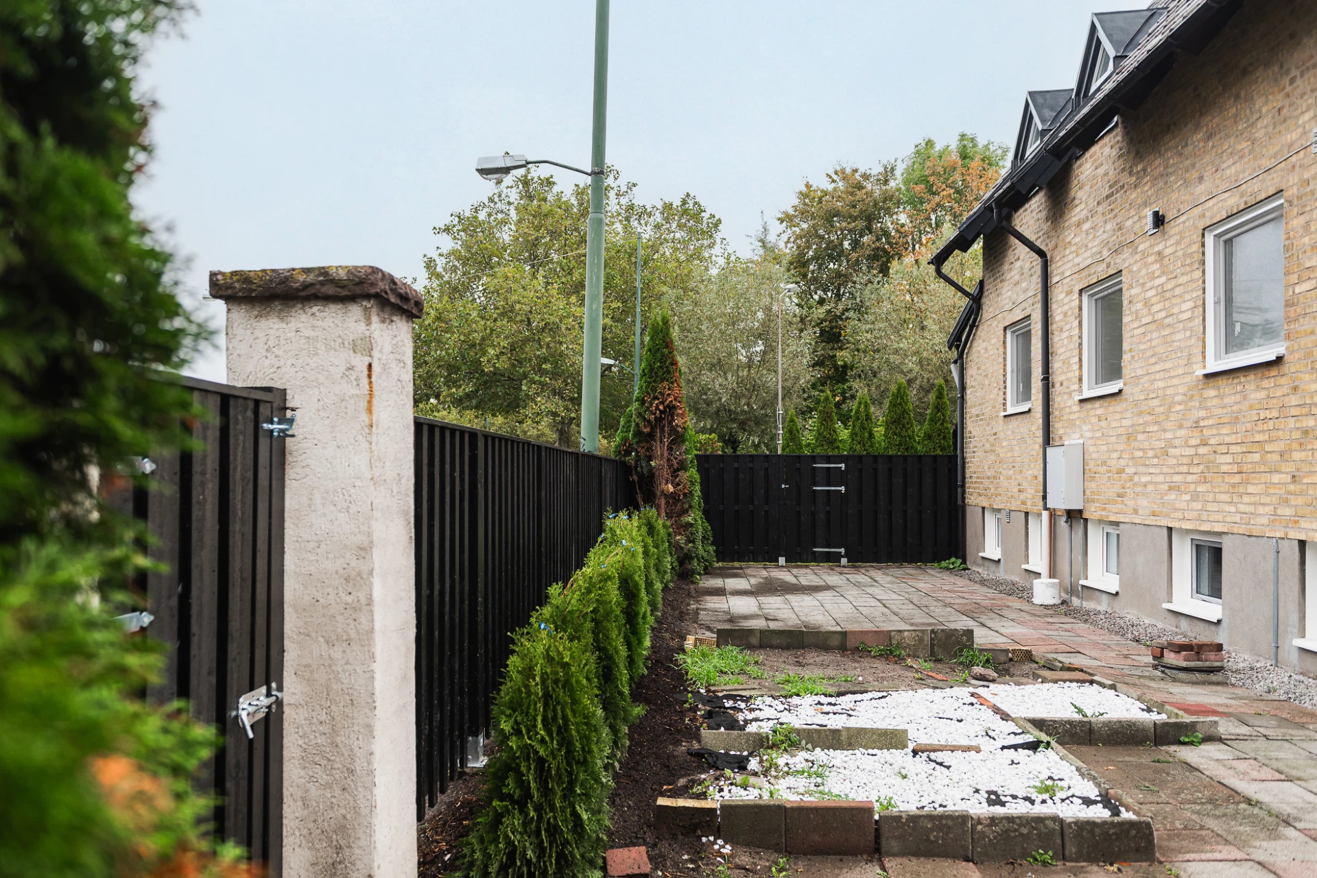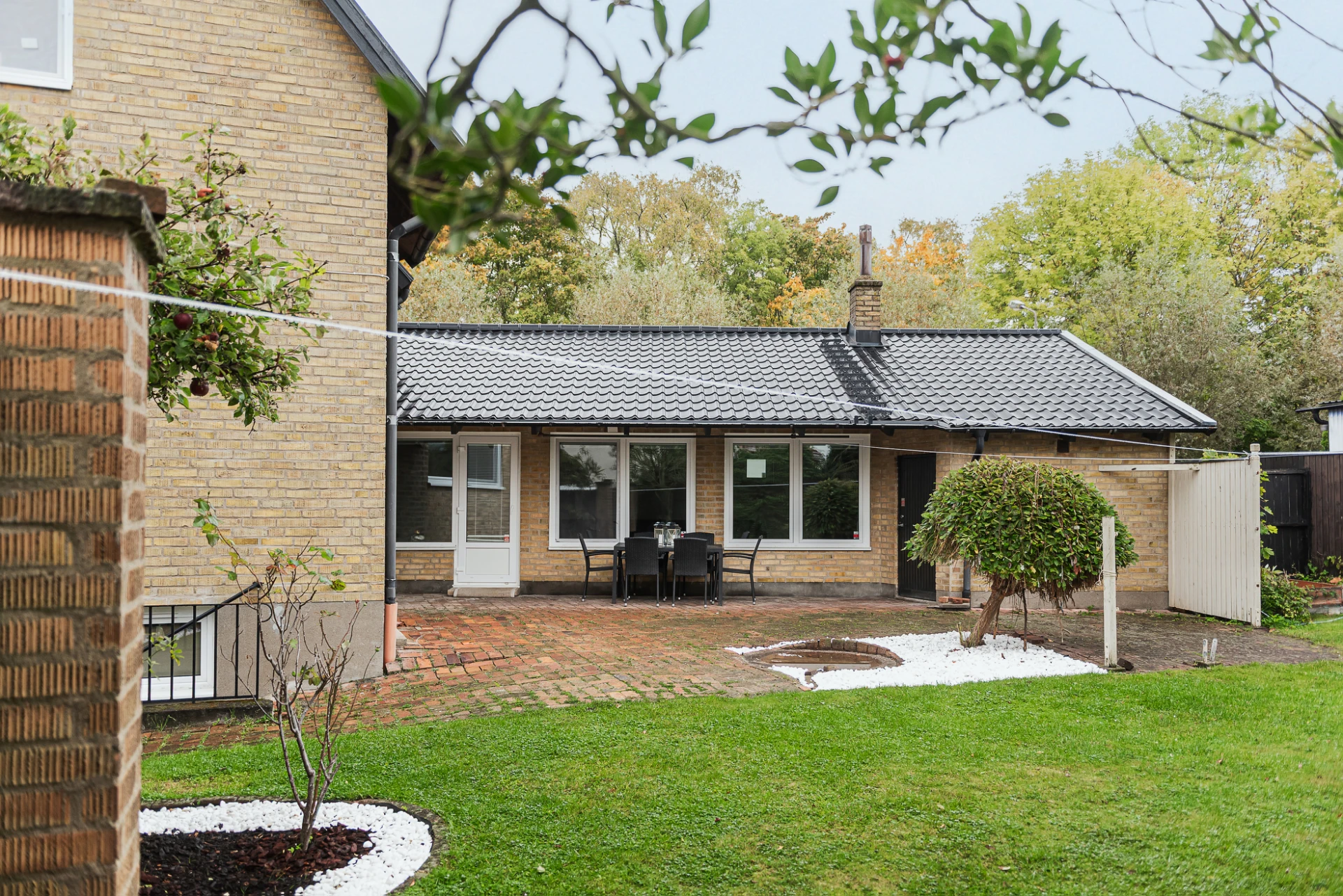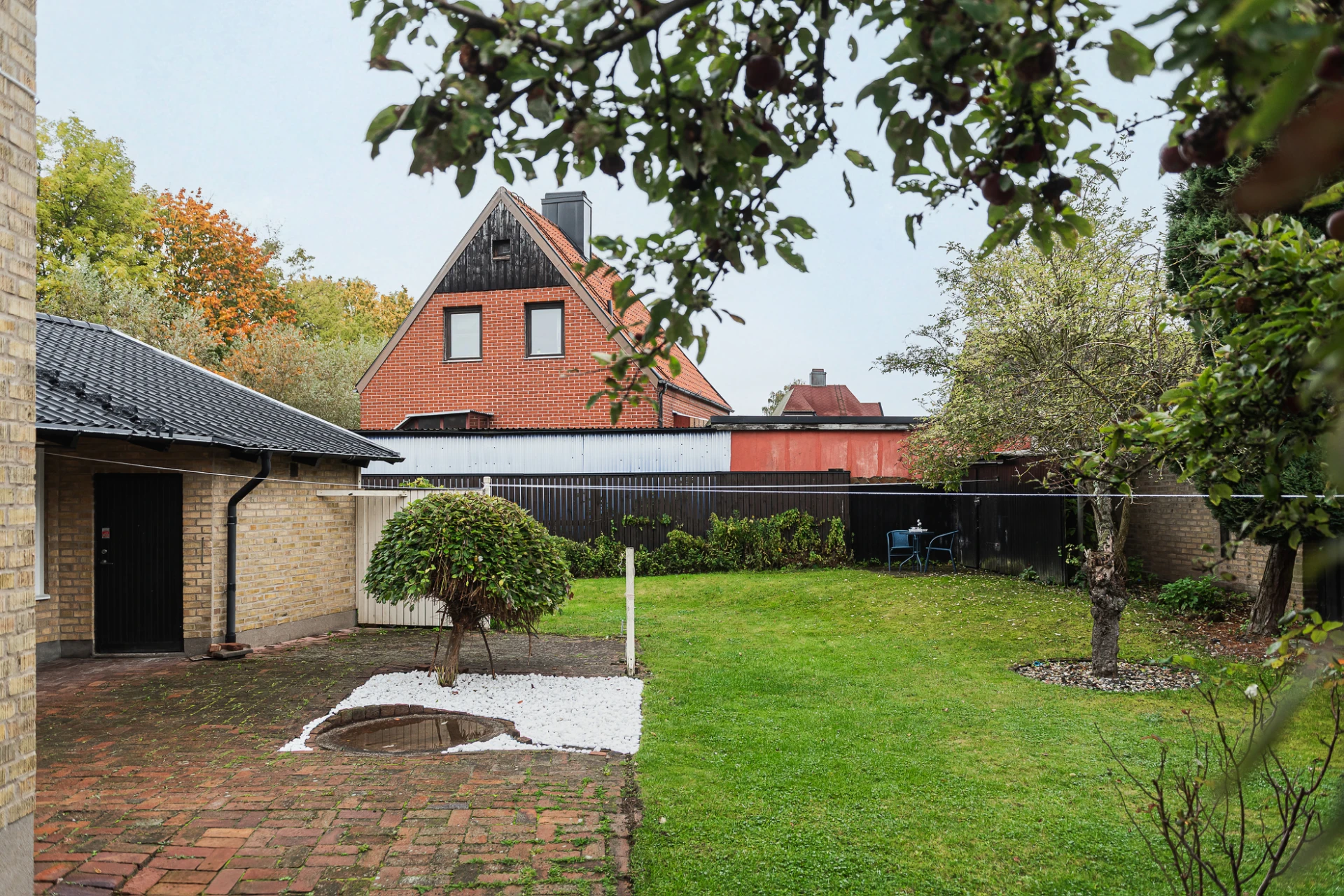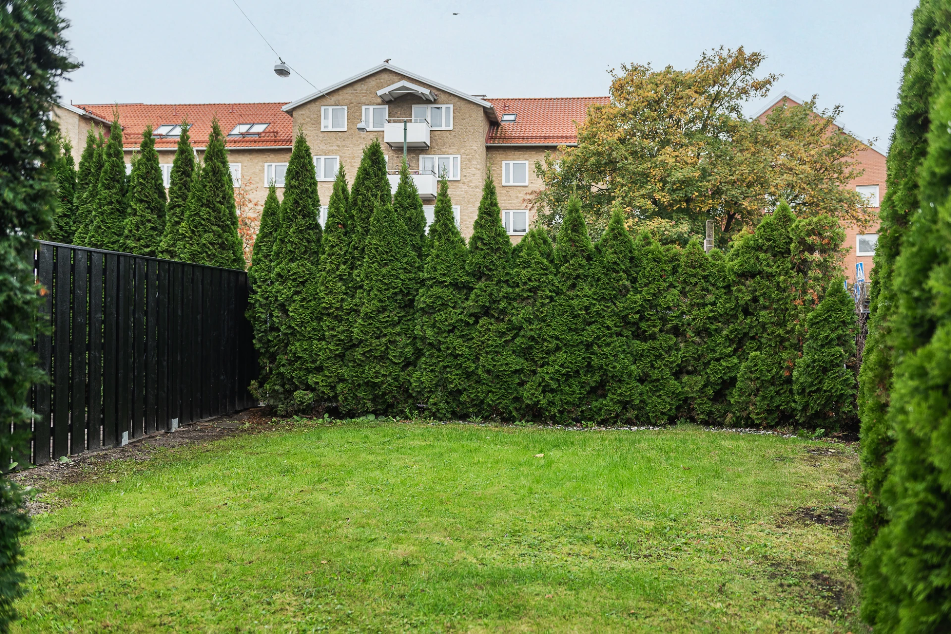 Hörntomt som löper runt huset och med gräsmatta samt stenlagd uteplats i soligt söder.