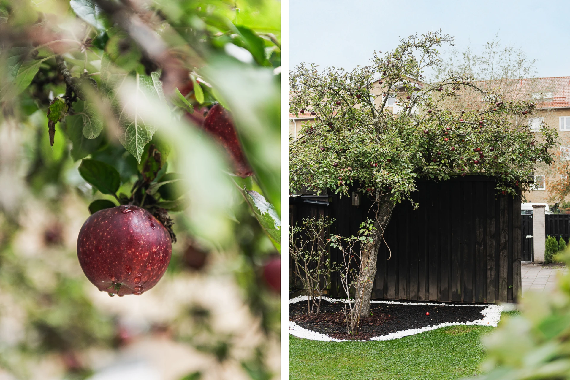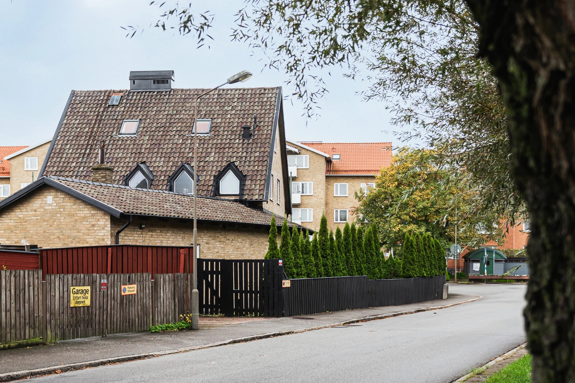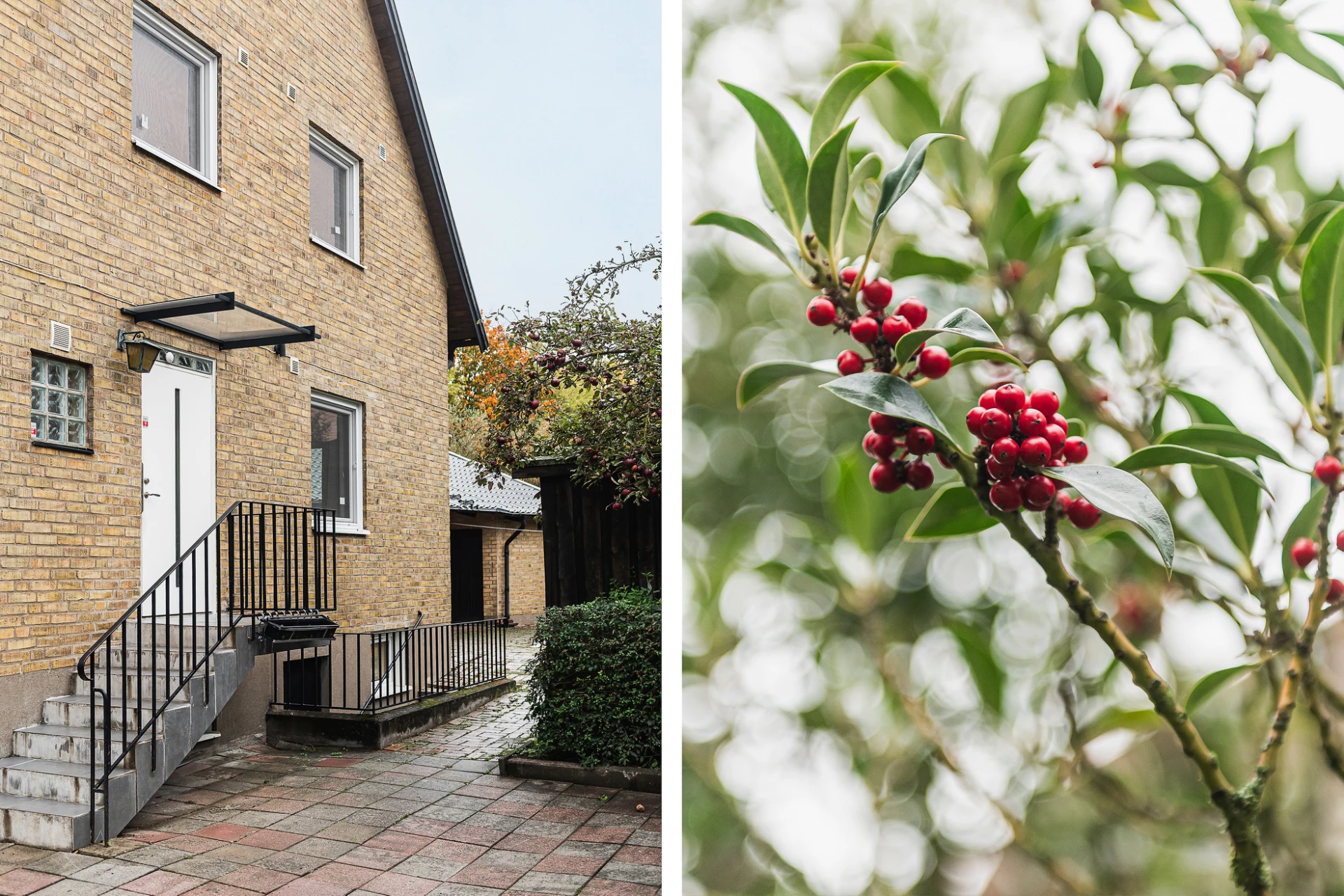 Hörntomt som löper runt huset och med gräsmatta samt stenlagd uteplats i soligt söder.