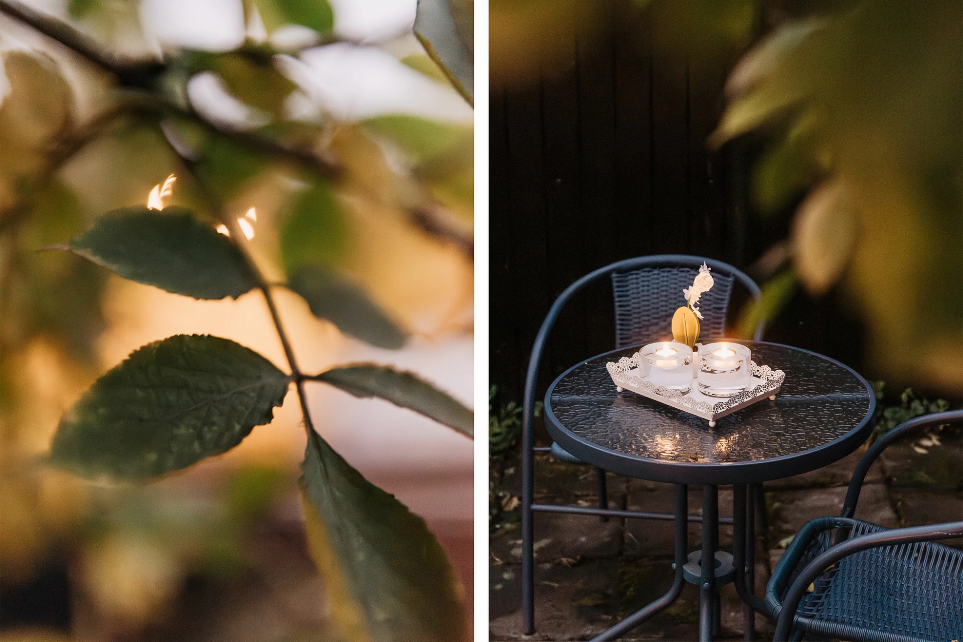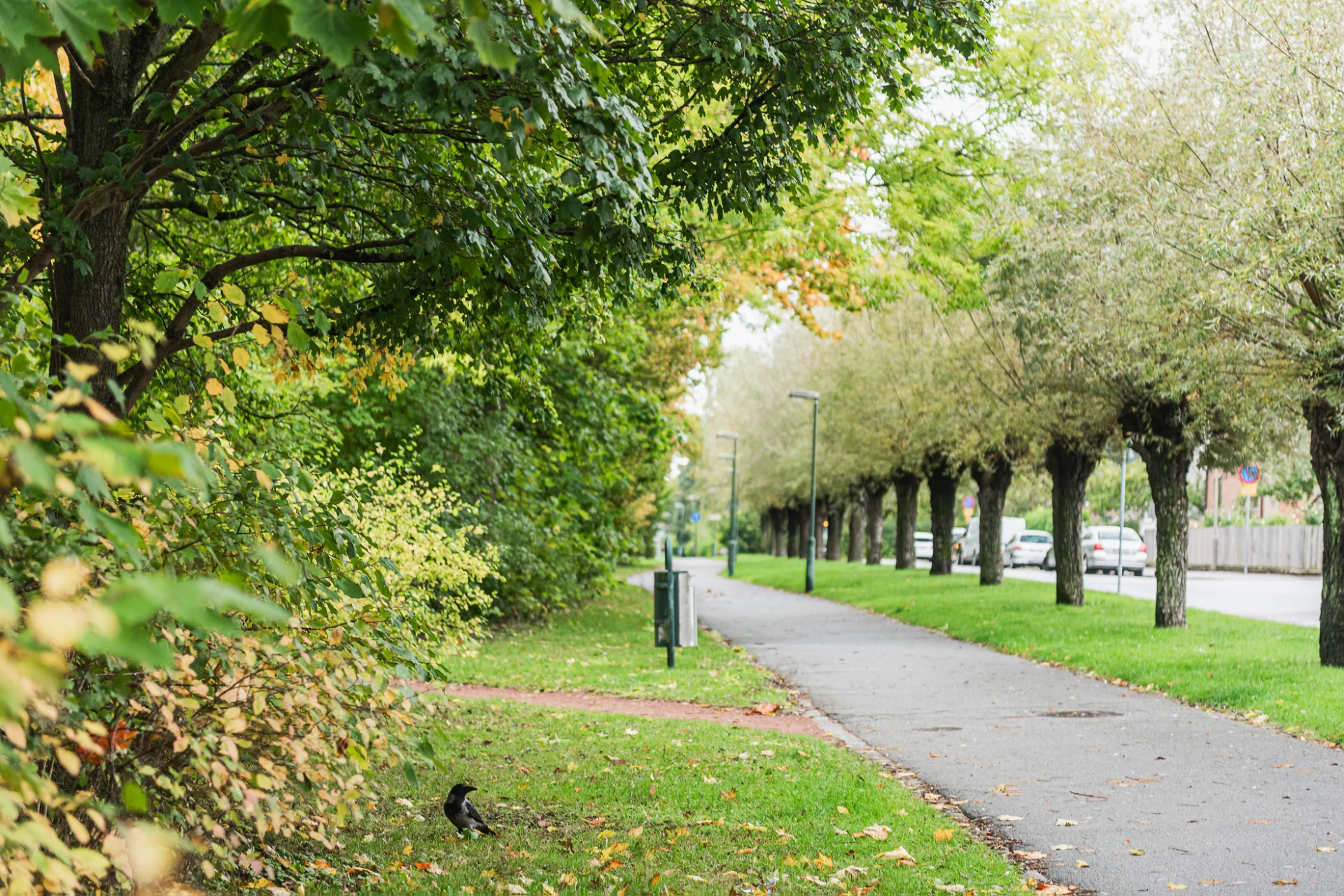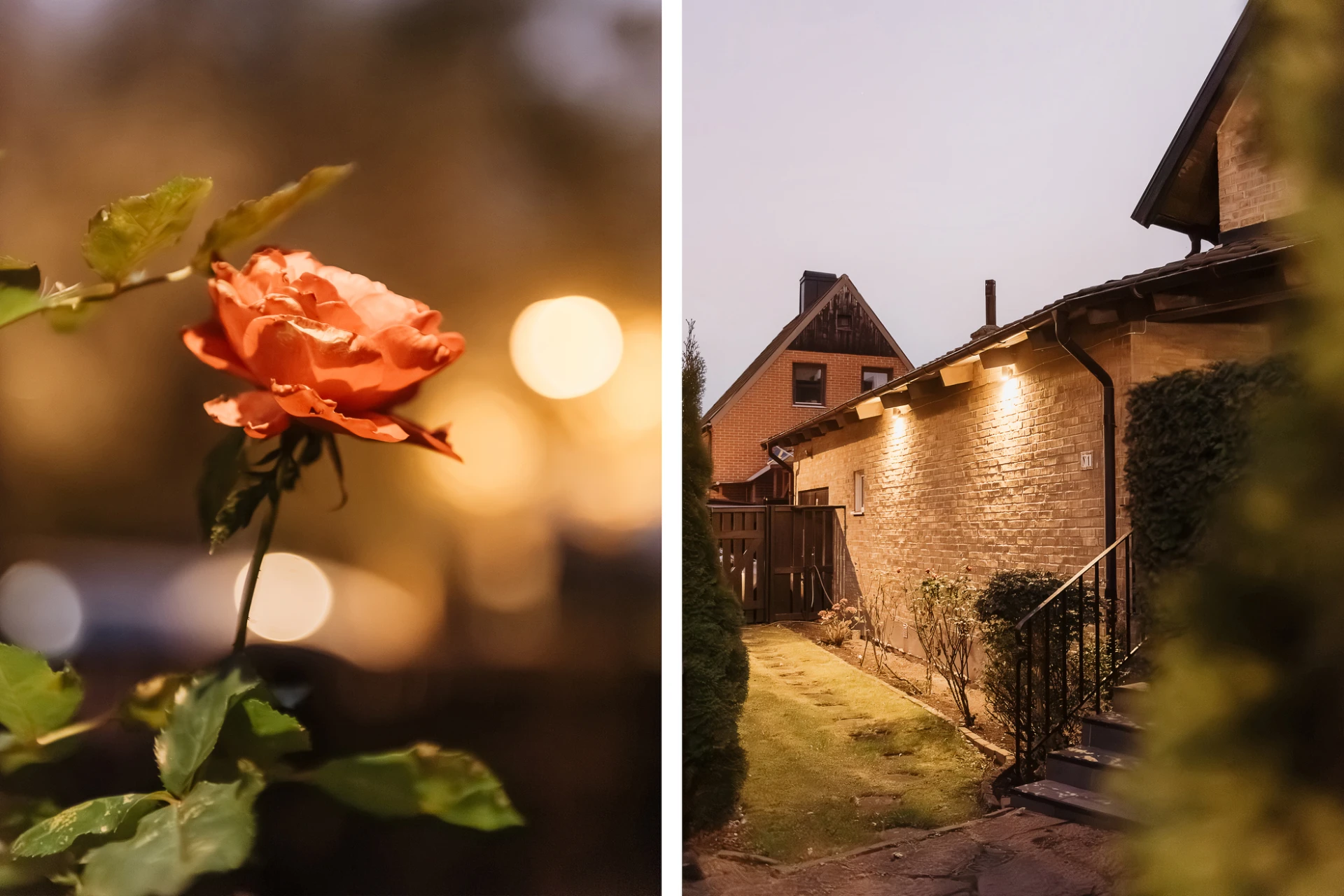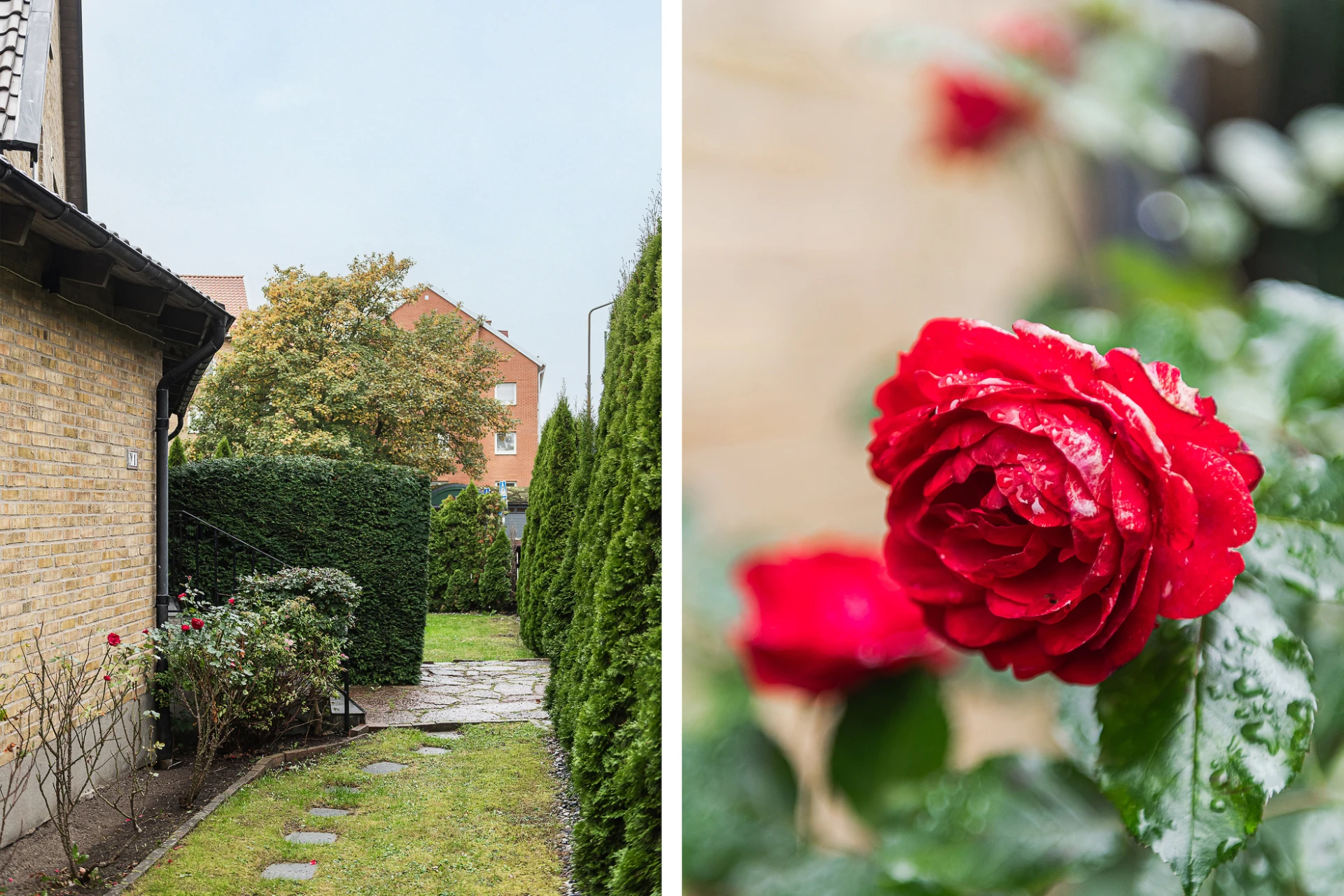 Hörntomt som löper runt huset och med gräsmatta samt stenlagd uteplats i soligt söder.