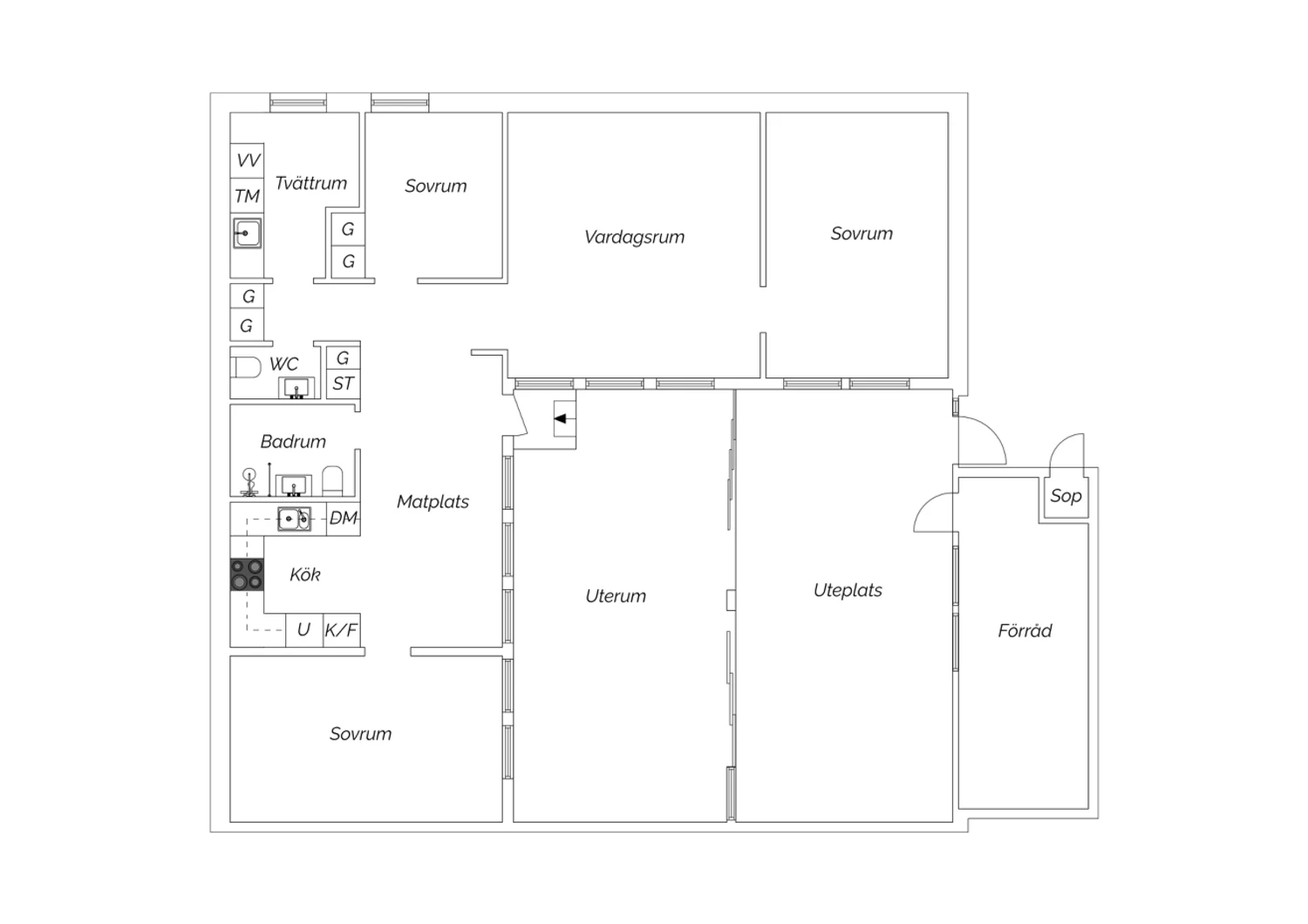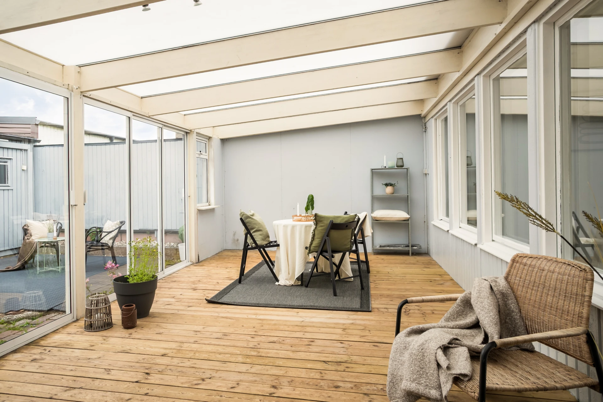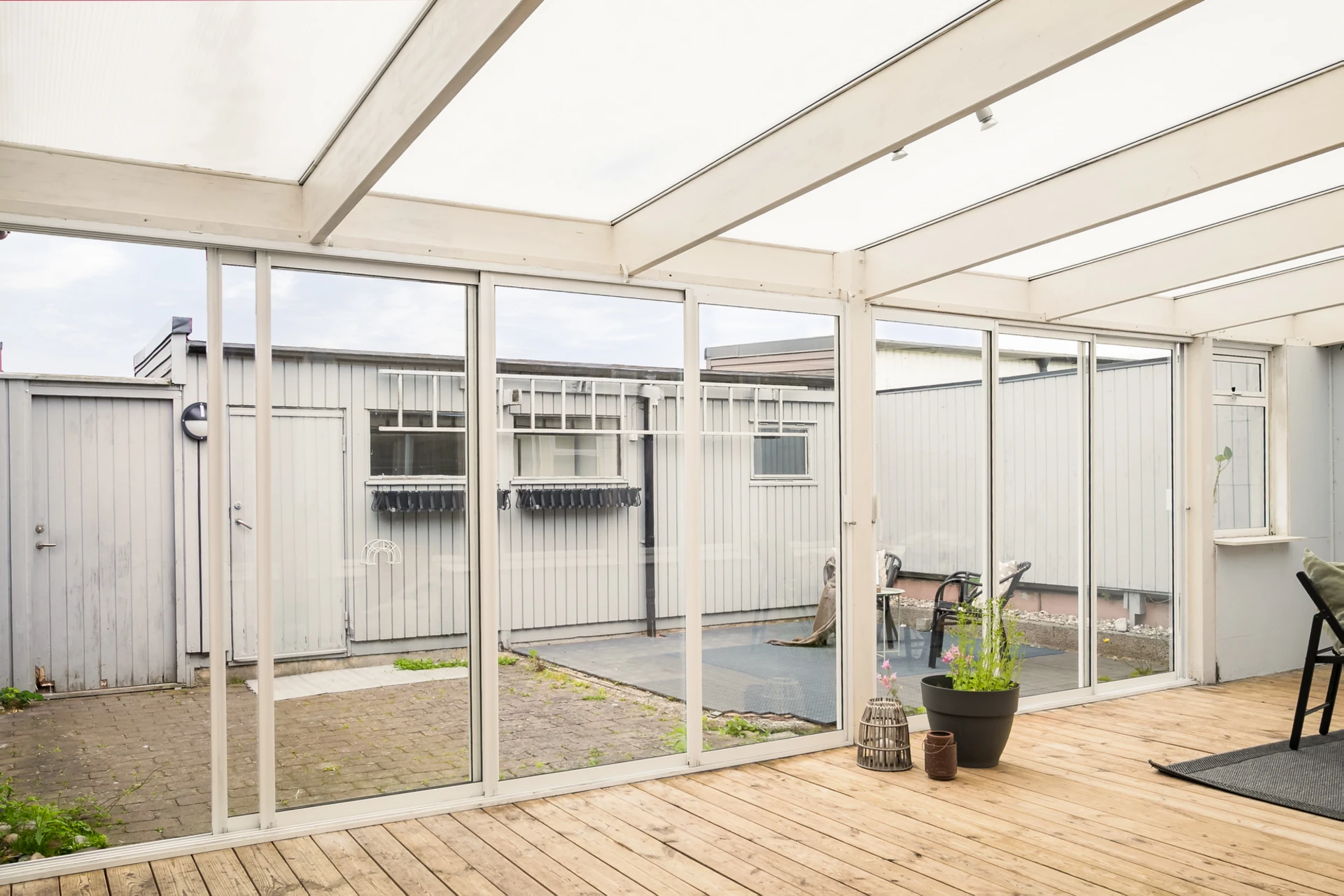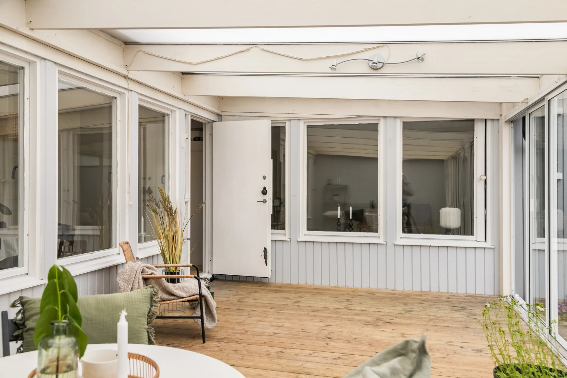 Beskrivning uteplats: Inhägnad, stenlagd uteplats i väster med förråd i anslutning samt ett stort uterum med trädäck och skjutdörrspartier.