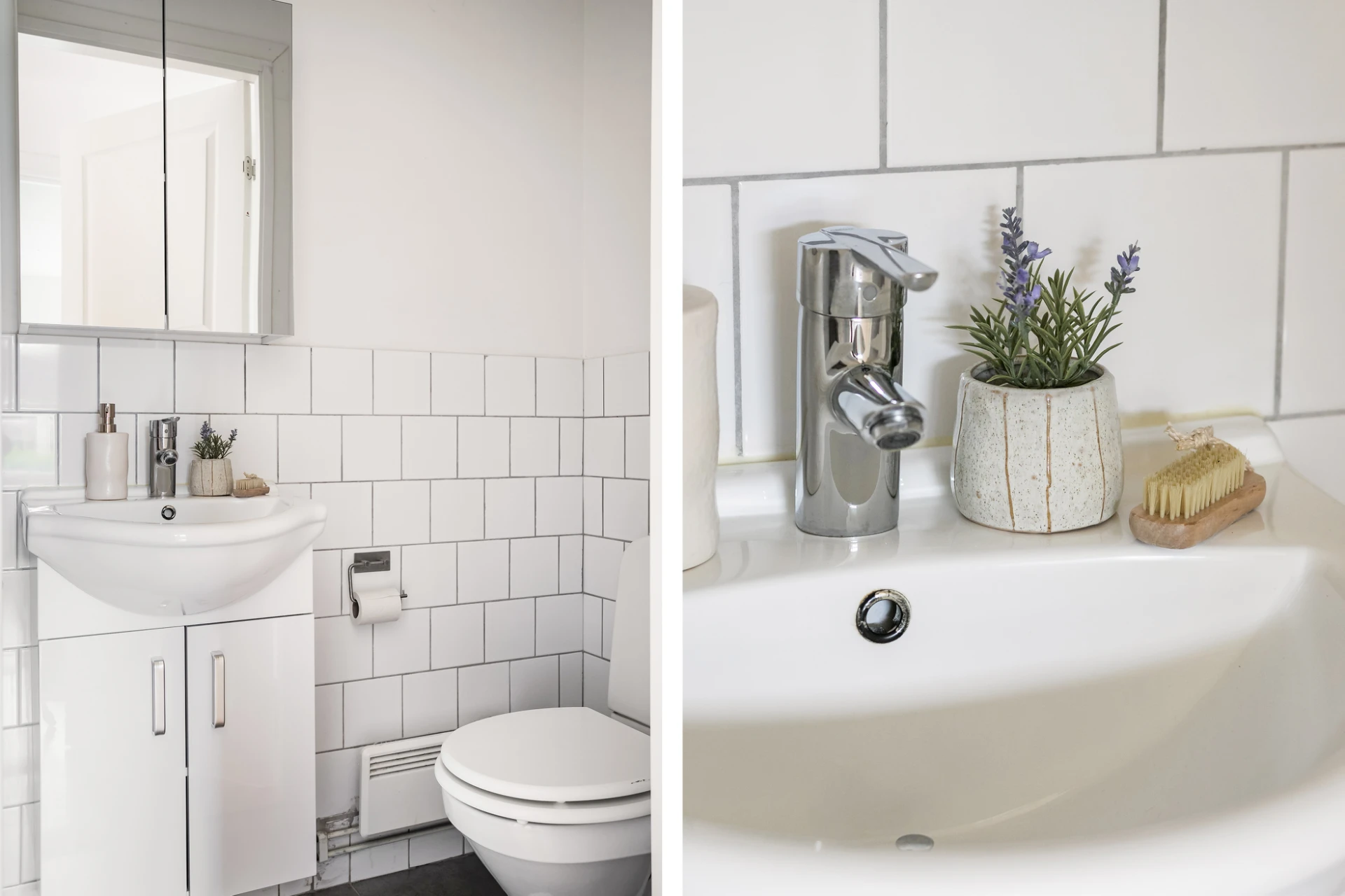 Grå klinker och vitt kakel på halvvägg, ovan målat i vitt. WC, handfat med kommod och spegelskåp.