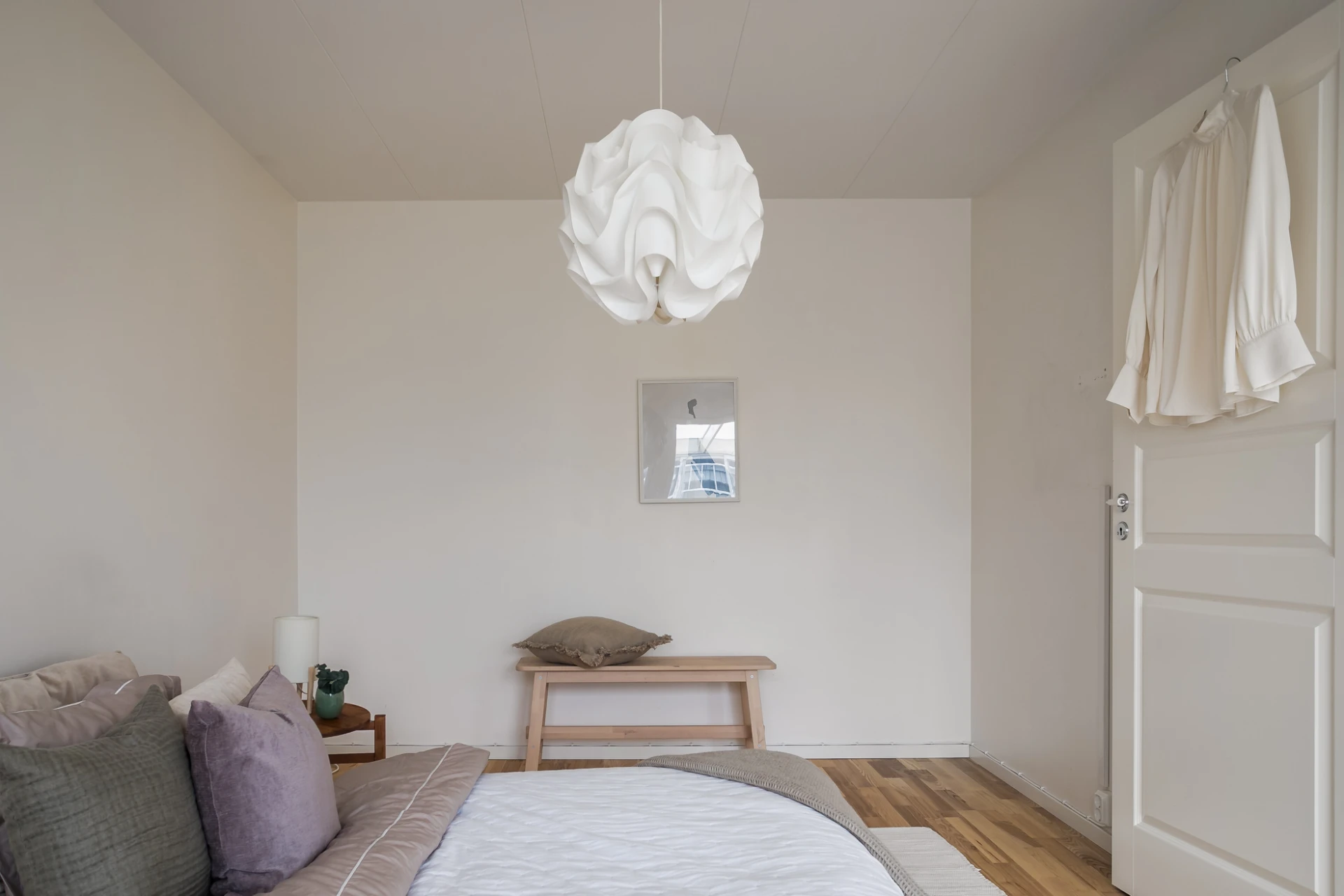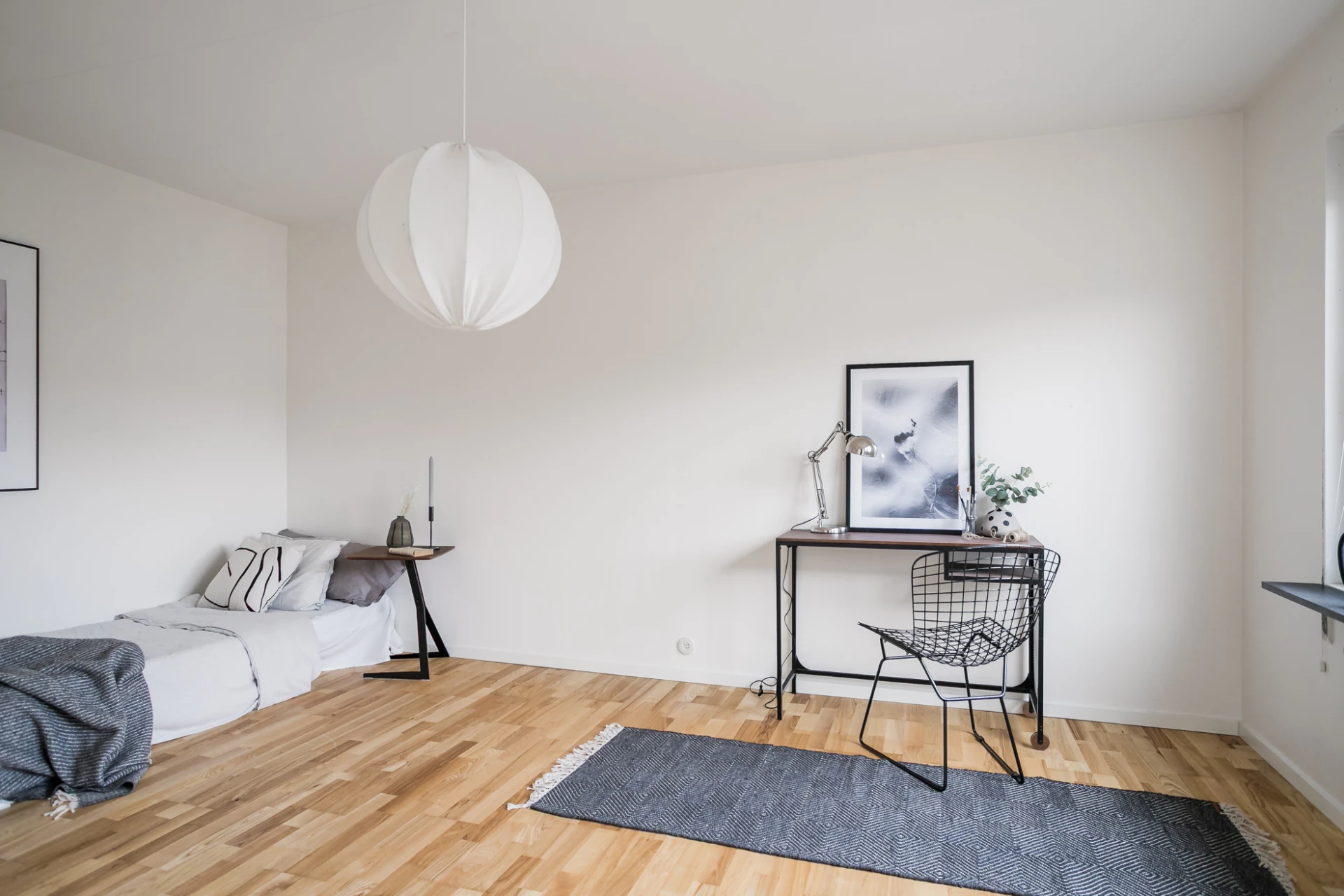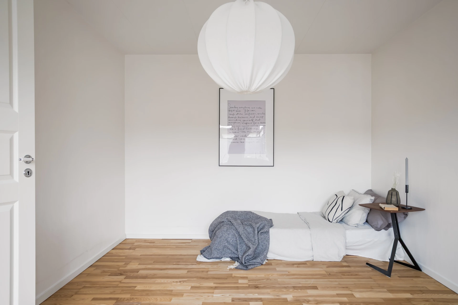 Parkettgolv och vita väggar. Ett av sovrummen har garderober.