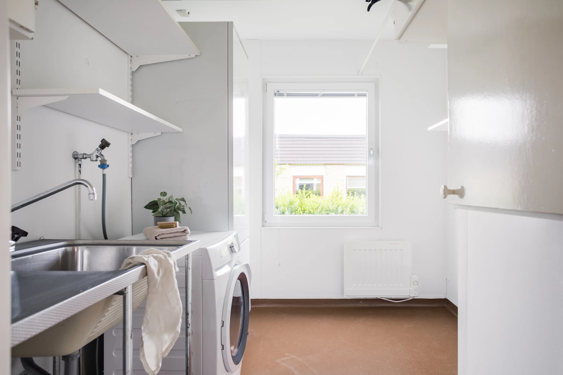 Plastmatta och vita väggar. Vask, tvättmaskin och varmvattenberedare.