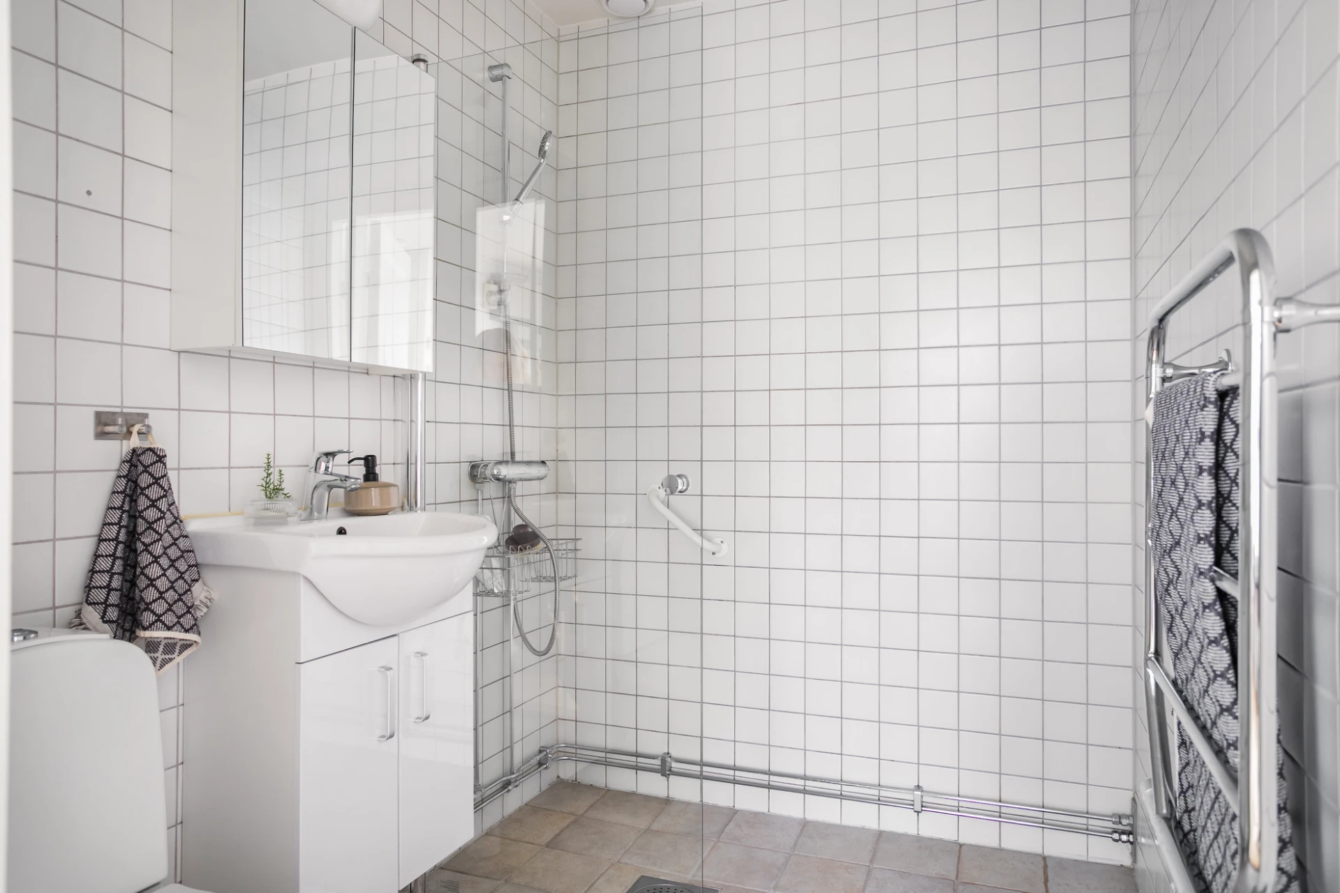 Beige klinker och vitt kakel. WC, handfat med kommod, spegelskåp, handdukstork och dusch med duschvägg i glas.