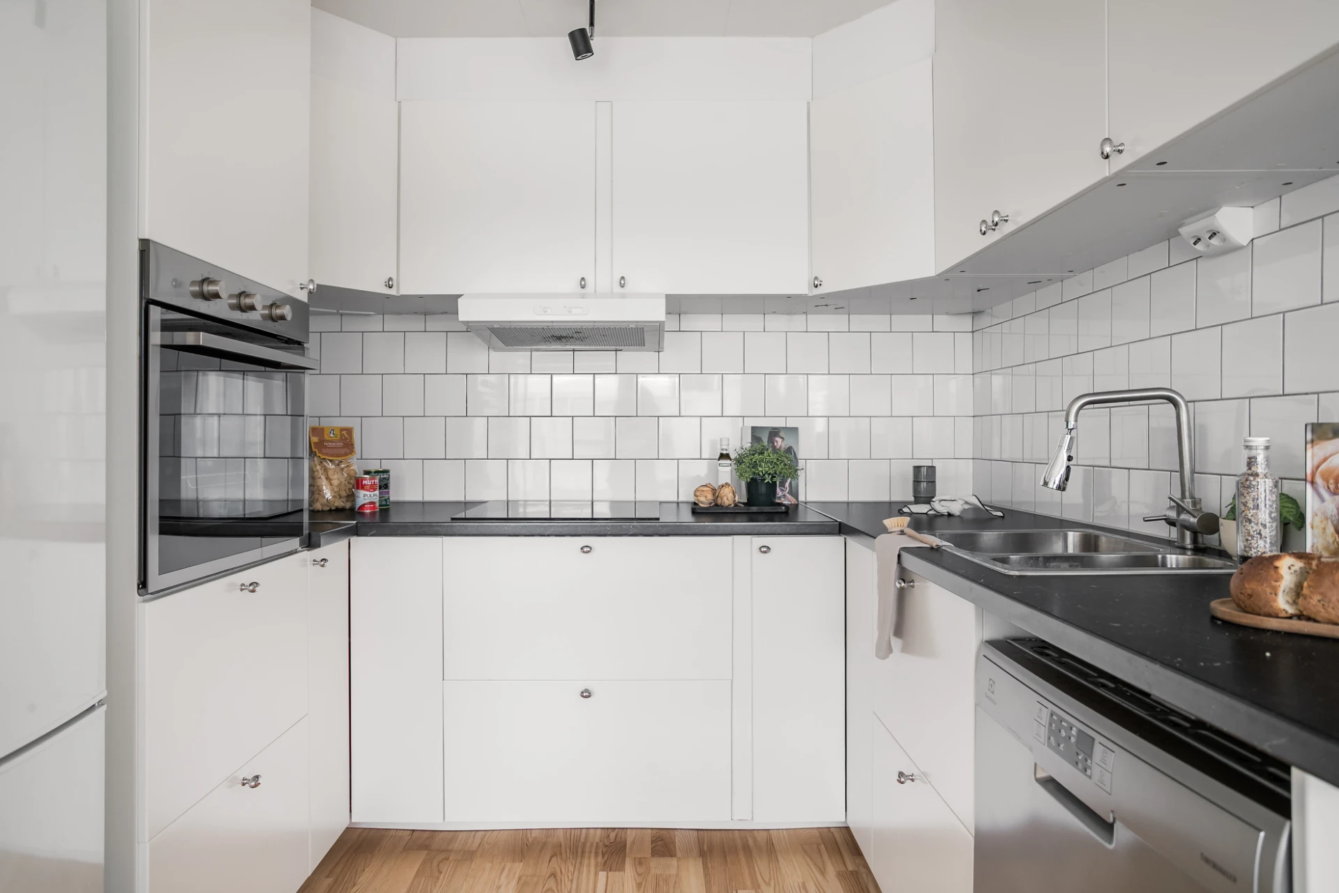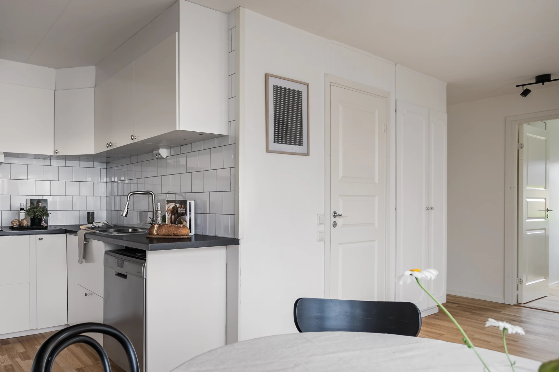 Parkettgolv och vita väggar. Vit köksinredning och vitt kakel ovan arbetsbänk i mörk laminat. Kyl/frys, inbyggd ugn, keramisk spishäll, fläkt och diskmaskin. I anslutning finns garderober och städskåp.