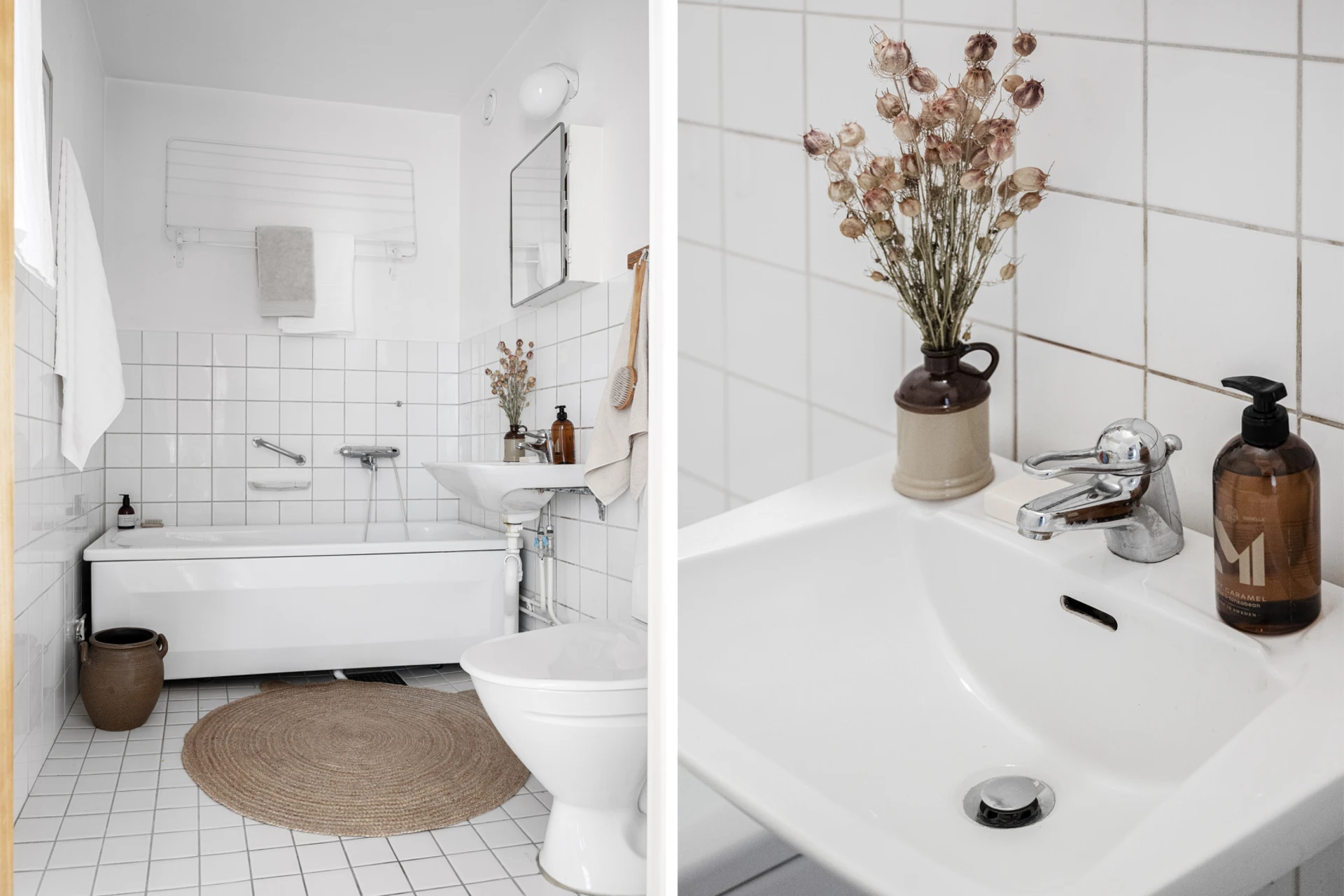 Halvkaklat och målat i vitt . Badrummet är utrustat med WC, handfat, dusch, spegel, handdukstork och badkar.
