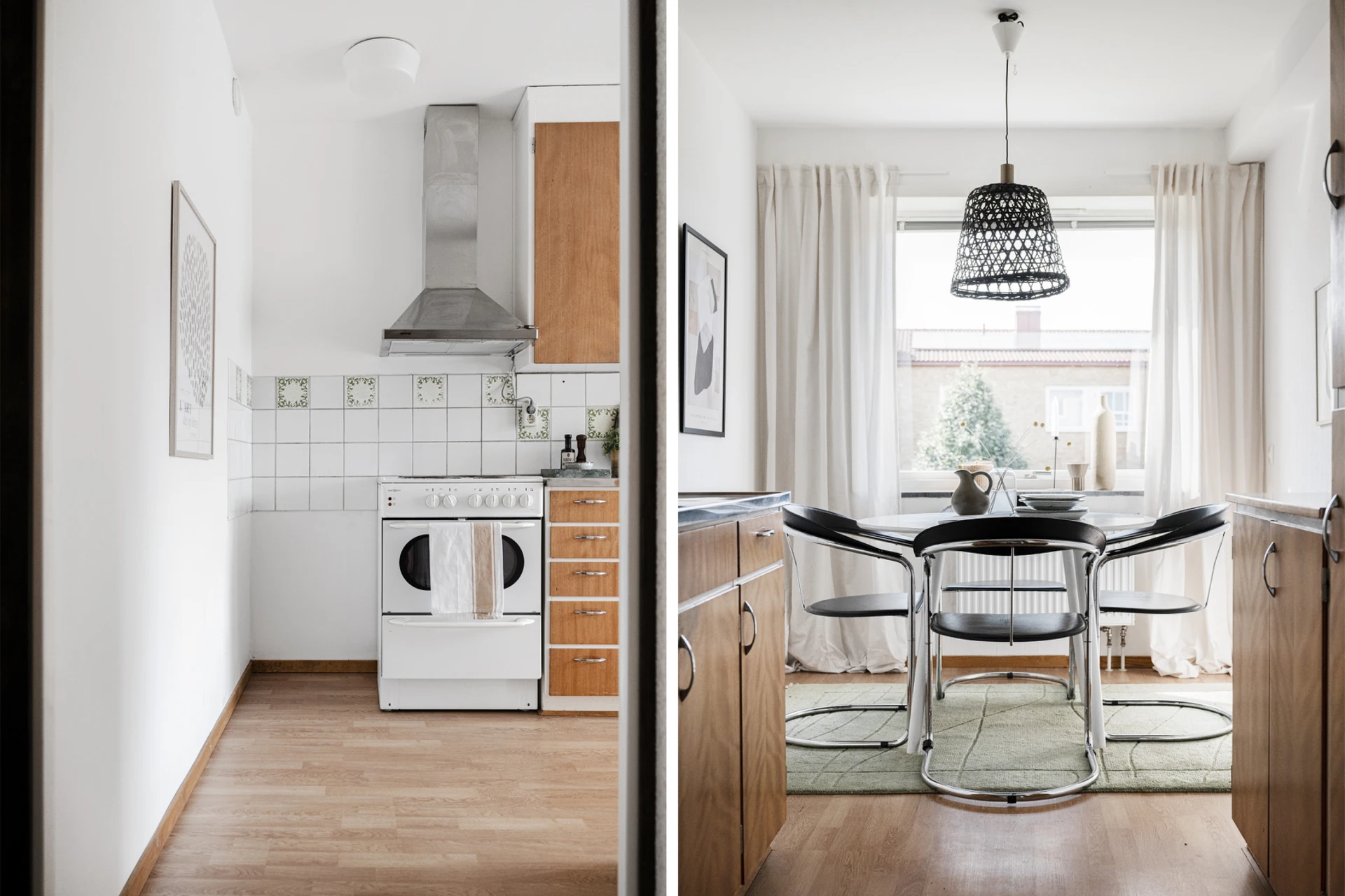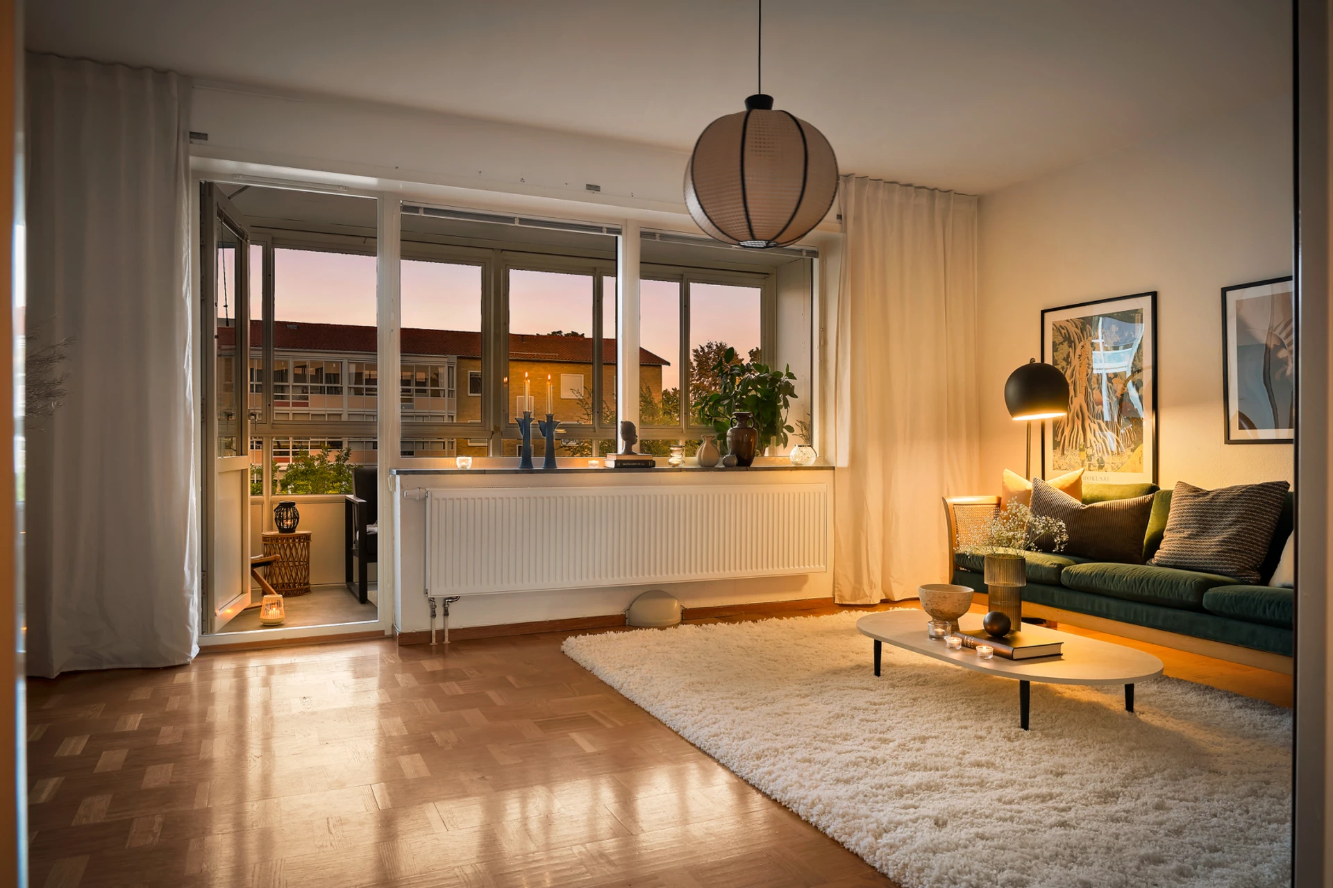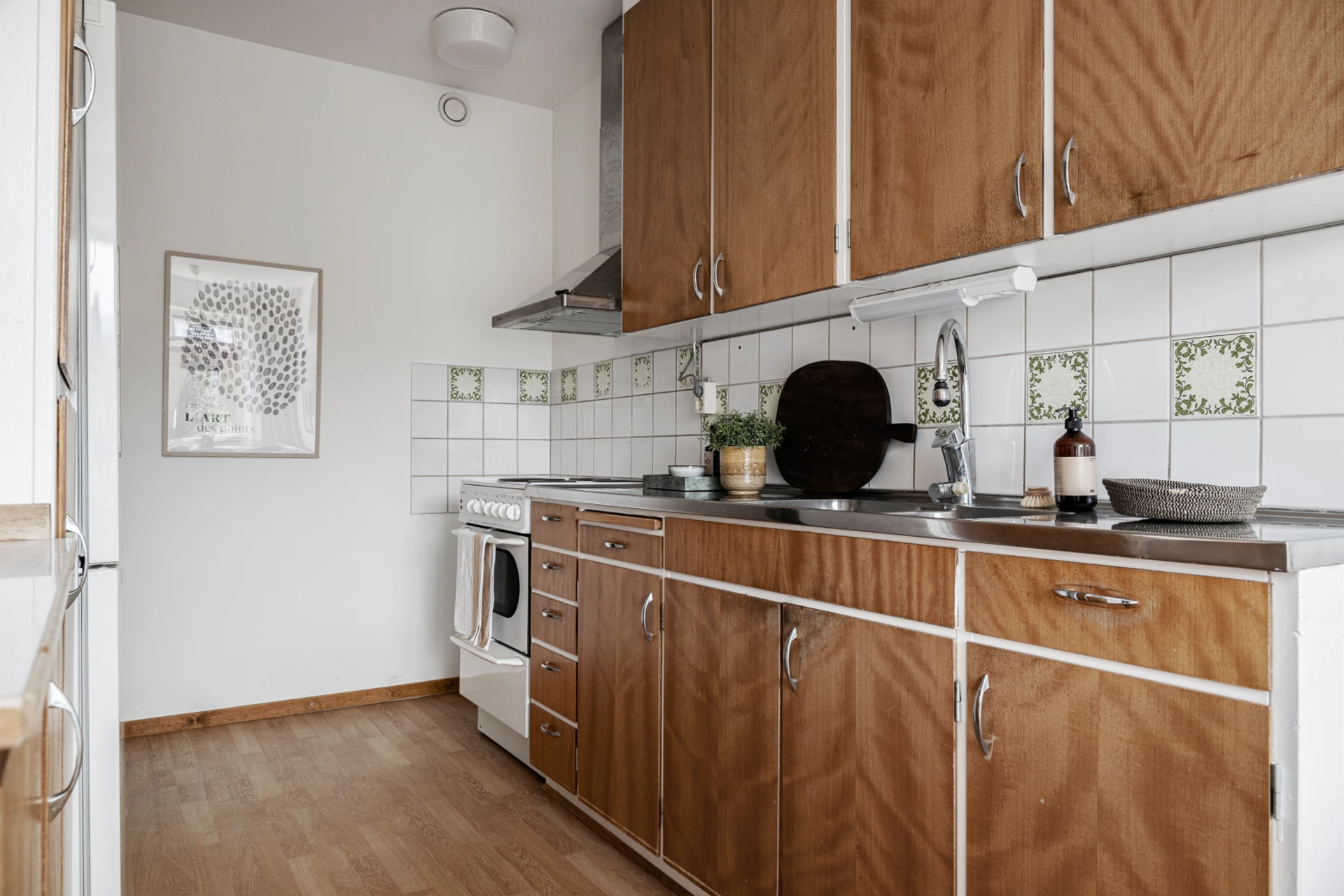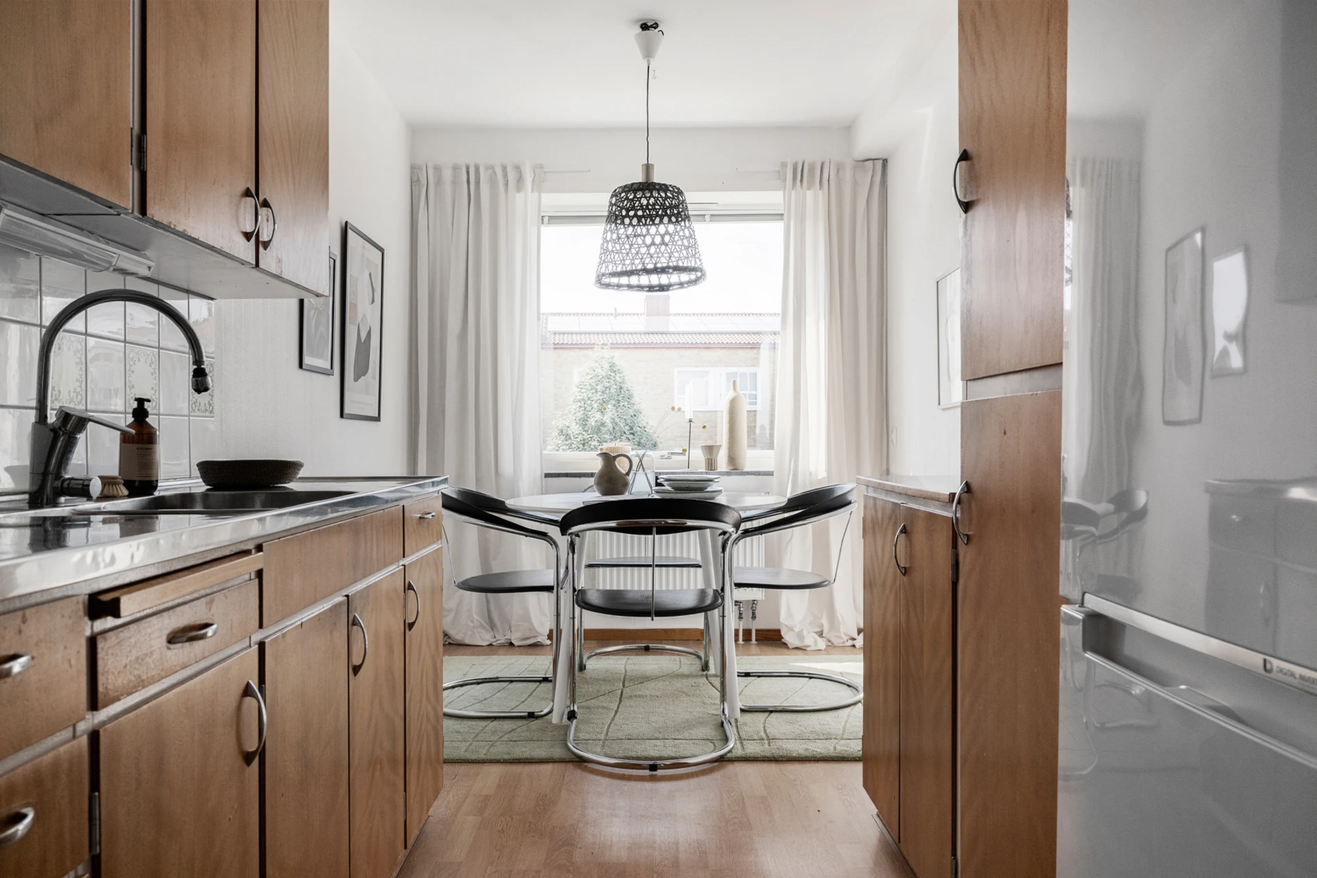 Bostaden har ett charmigt originalkök som bjuder på gott om arbetsyta och förvaring. Här kan du njuta av den tidstypiska känslan som den är eller uppdatera efter egna önskemål. De två sovrummen är väl tilltagna, vardagsrummet har härligt ljusinsläpp och utgång till den stora, inglasade balkongen i österläge där morgonkaffet kan avnjutas året runt. Gott om förvaring gör vardagen enkel, och det faktum att bostaden ligger på våning två av tre ger både insynsskydd och en härlig utsikt över innergården.