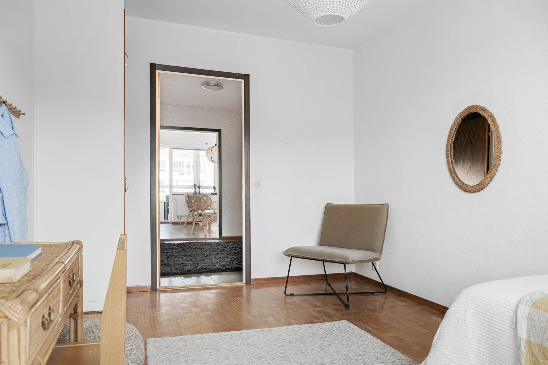 Parkettgolv och ljusa väggar. Utgång till balkong.