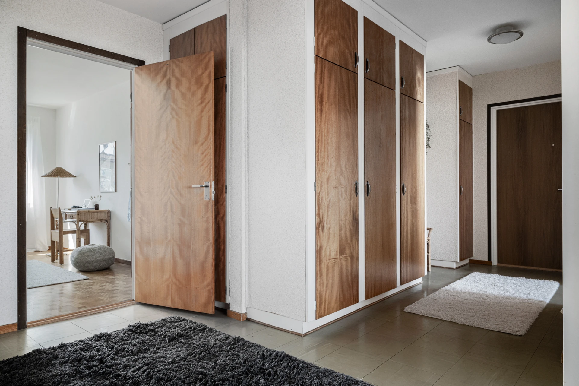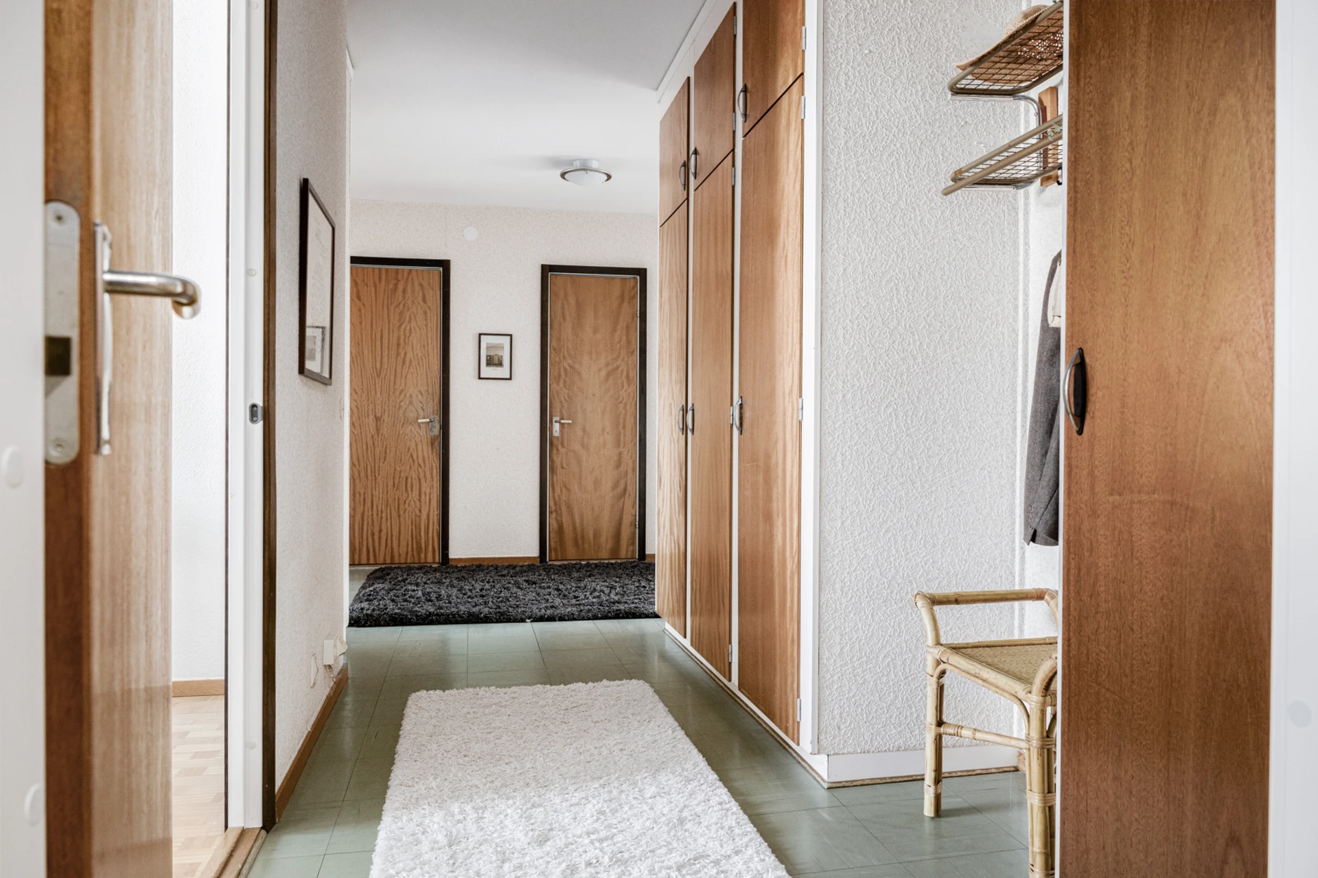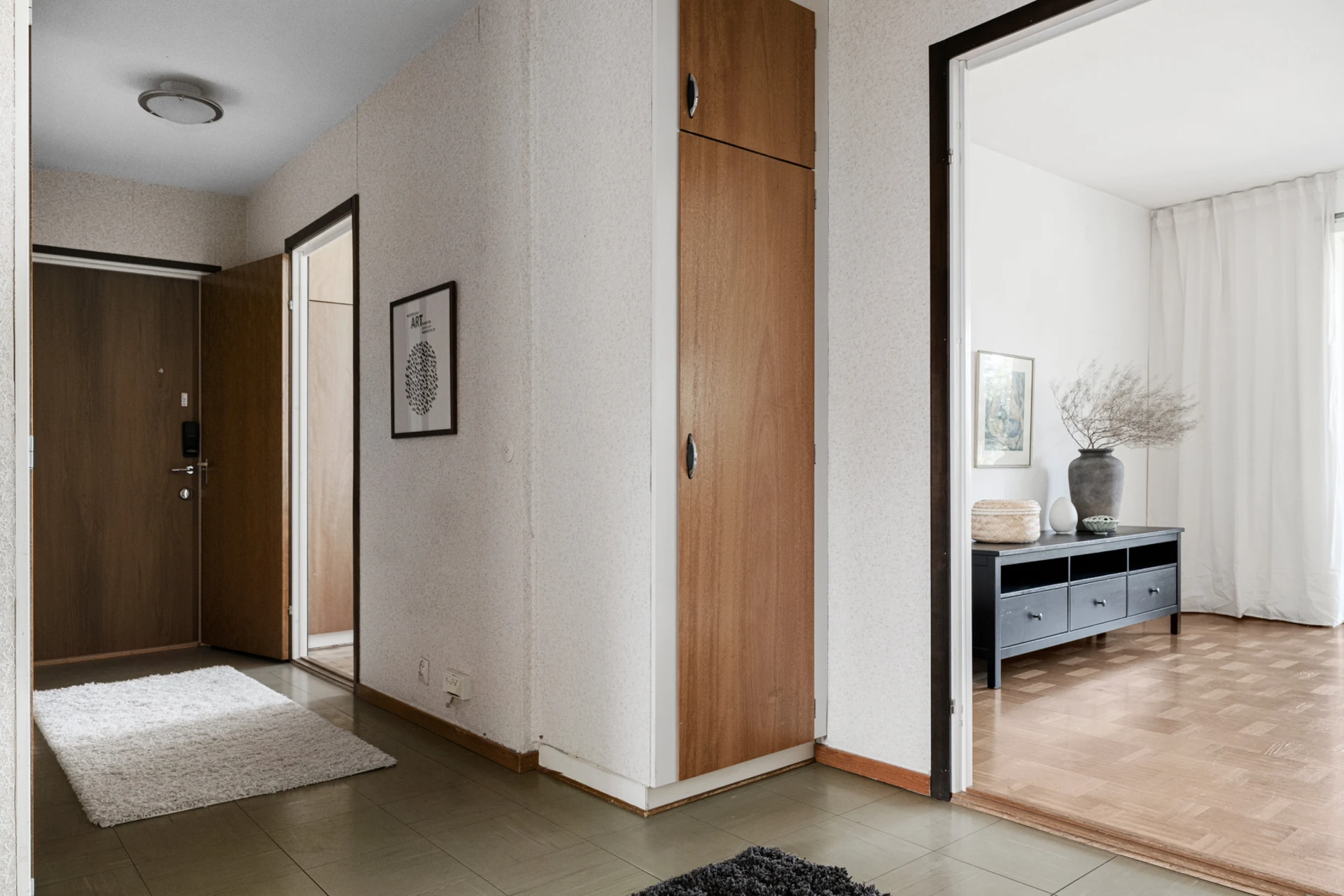 Ljust golv och ljusa väggar. Förvaring i sex stycken garderober. Säkerhetsdörr är installerad.