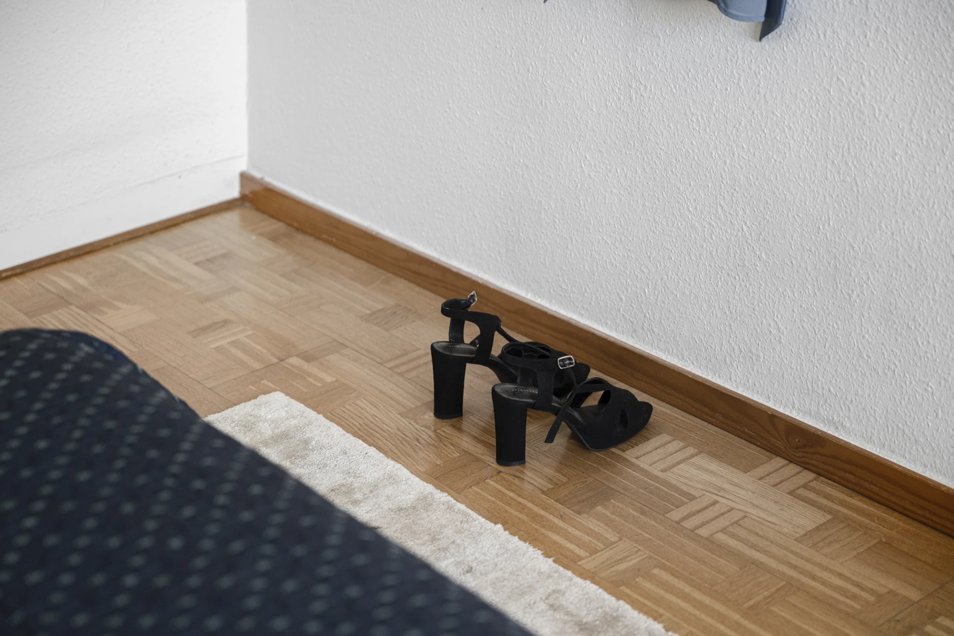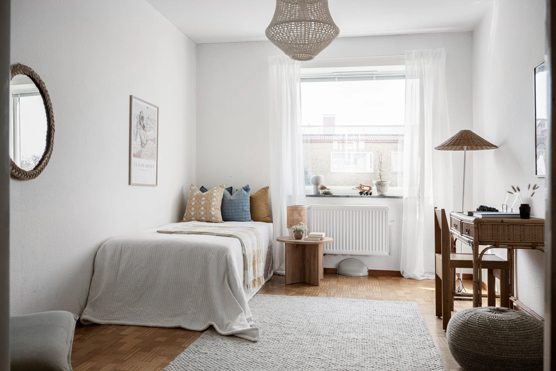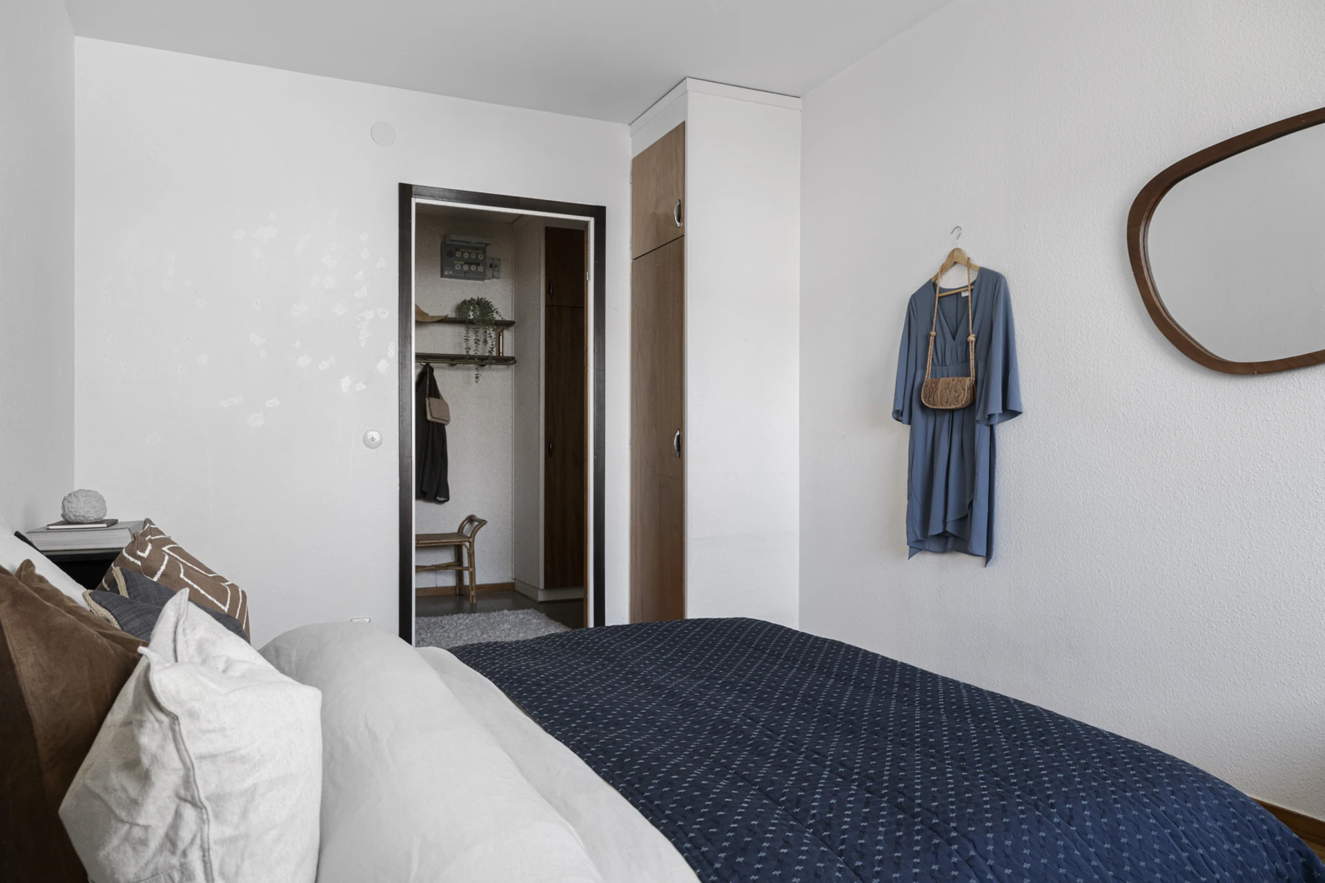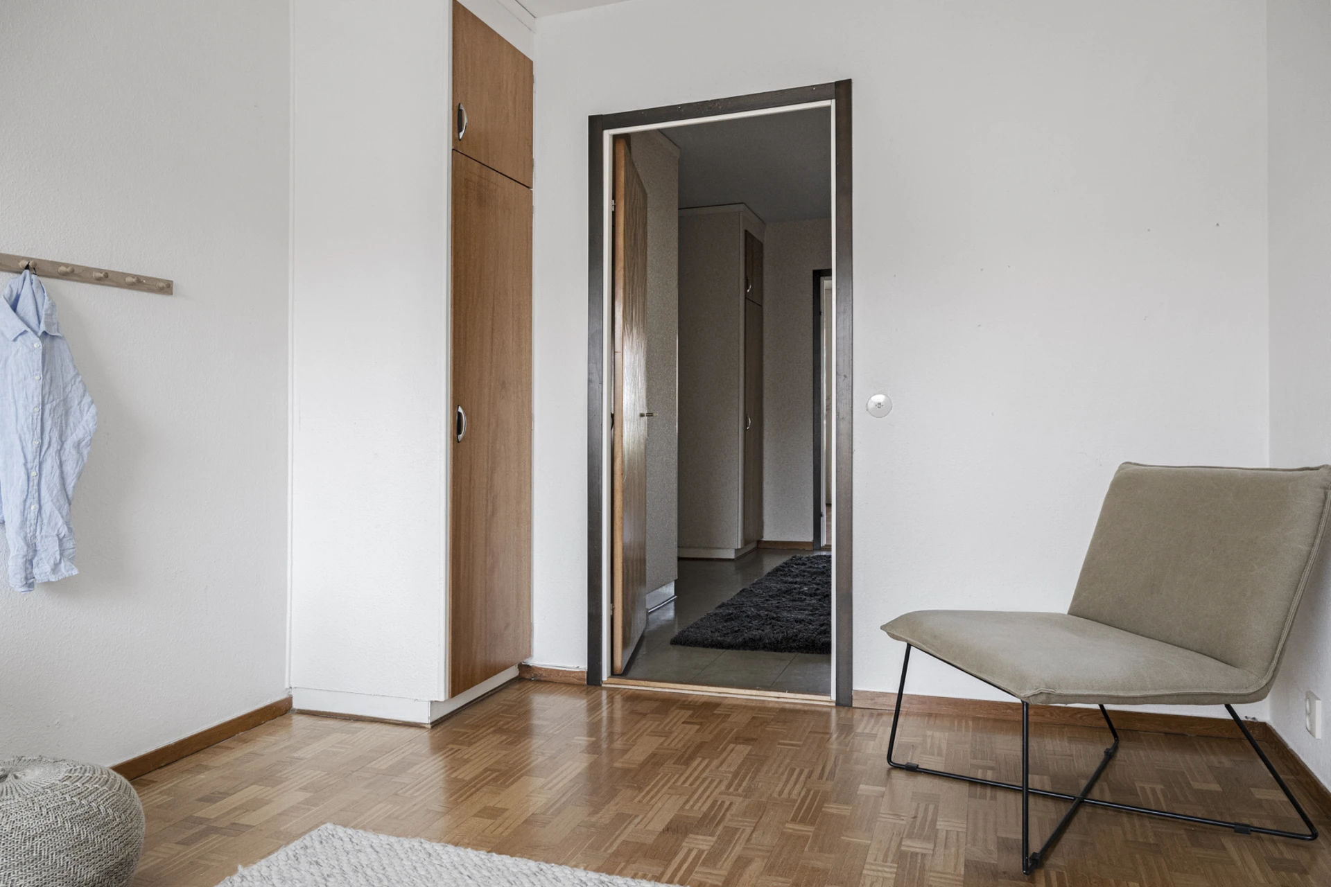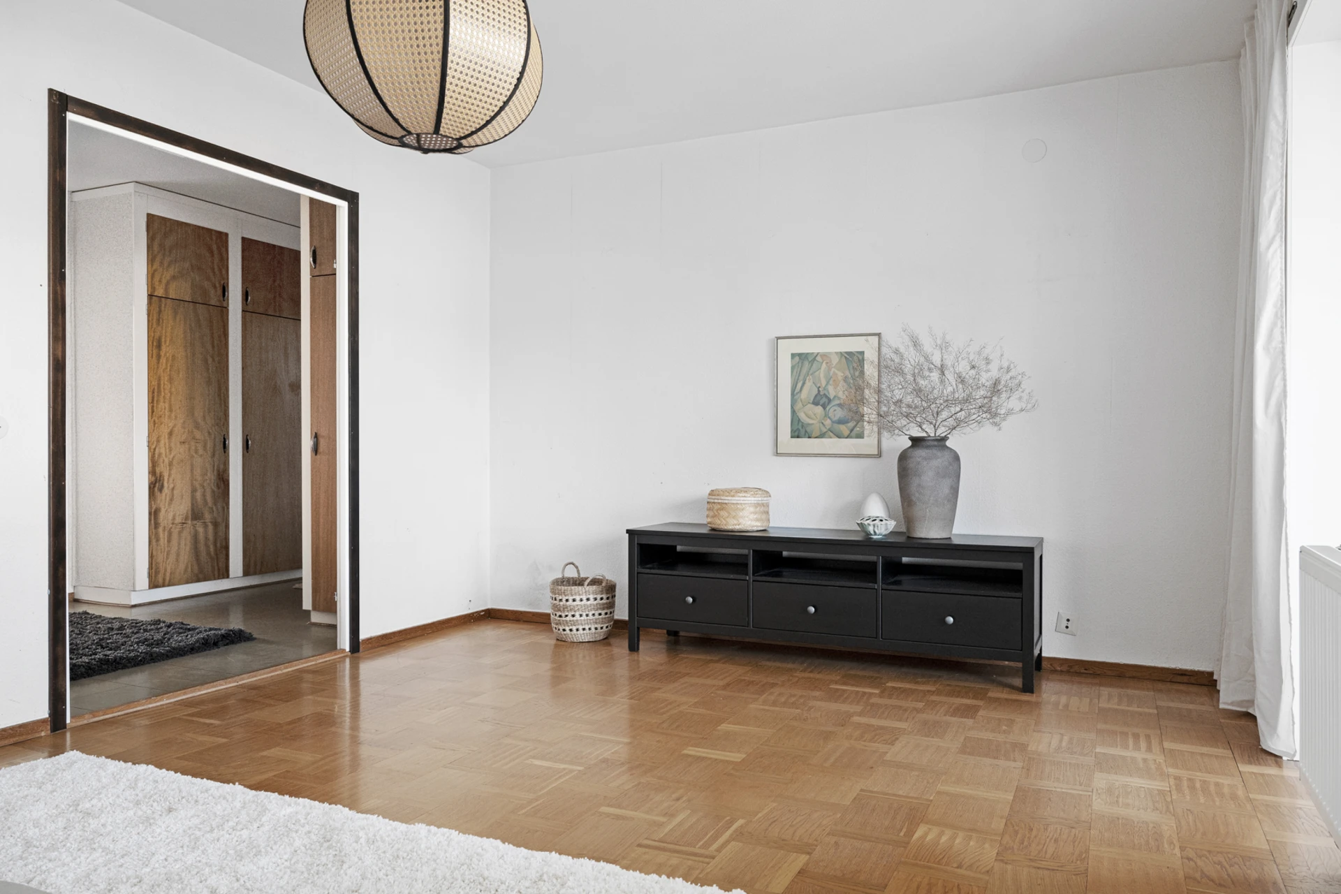 Parkettgolv och ljusa väggar. Förvaring i garderob.