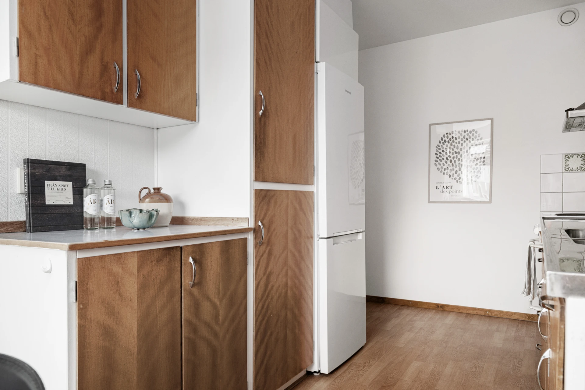 Ljust golv och ljusa väggar. Köksinredning i vitt med träfärgade luckor. Ljus bänksiva och stänkskydd. i Köket är utrustat med kyl/frys, spis med ugn och fläkt. Förvaring i skafferi.