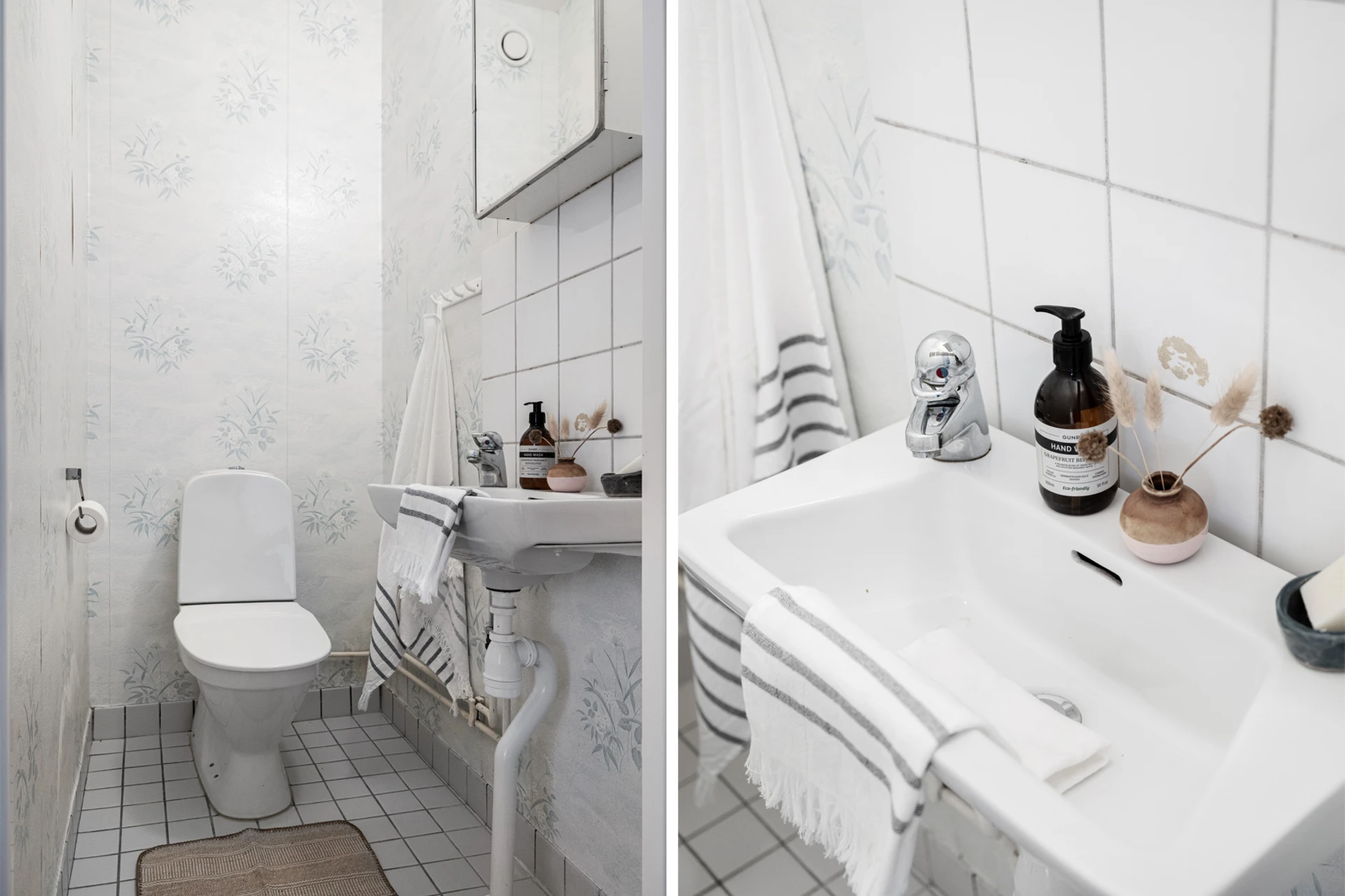 Ljust klinker och ljus, mönstrad våtrumstapet på väggar. Badrummet är utrustat med WC, handfat och spegelskåp.