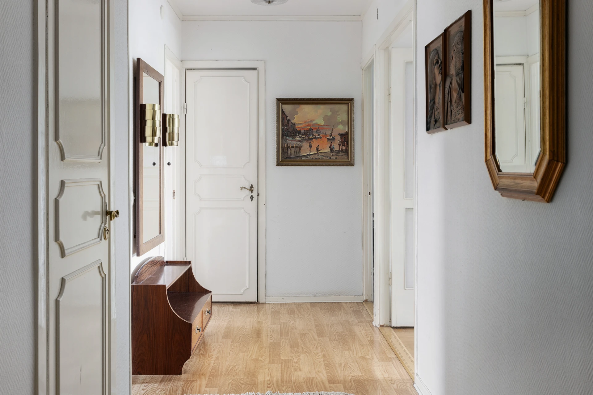 Laminatgolv och ljusa väggar. Garderober och klädkammare.