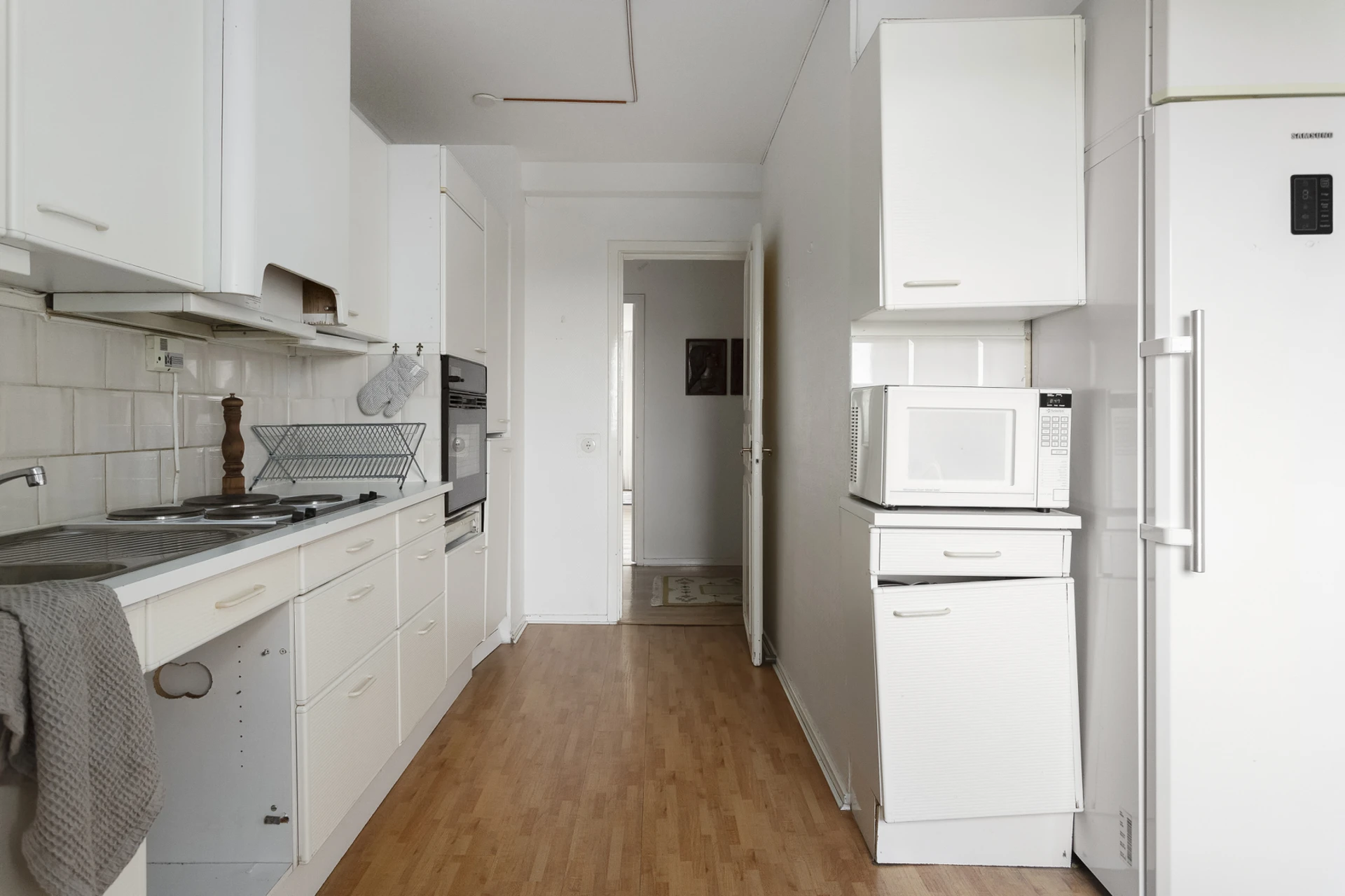 Laminatgolv och ljusa väggar. Vit köksinredning (italienskt) och vitt kakel ovan arbetsbänk i laminat. Städskåp, kyl och frys, spis, inbyggd ugn, fläkt och diskmaskin.