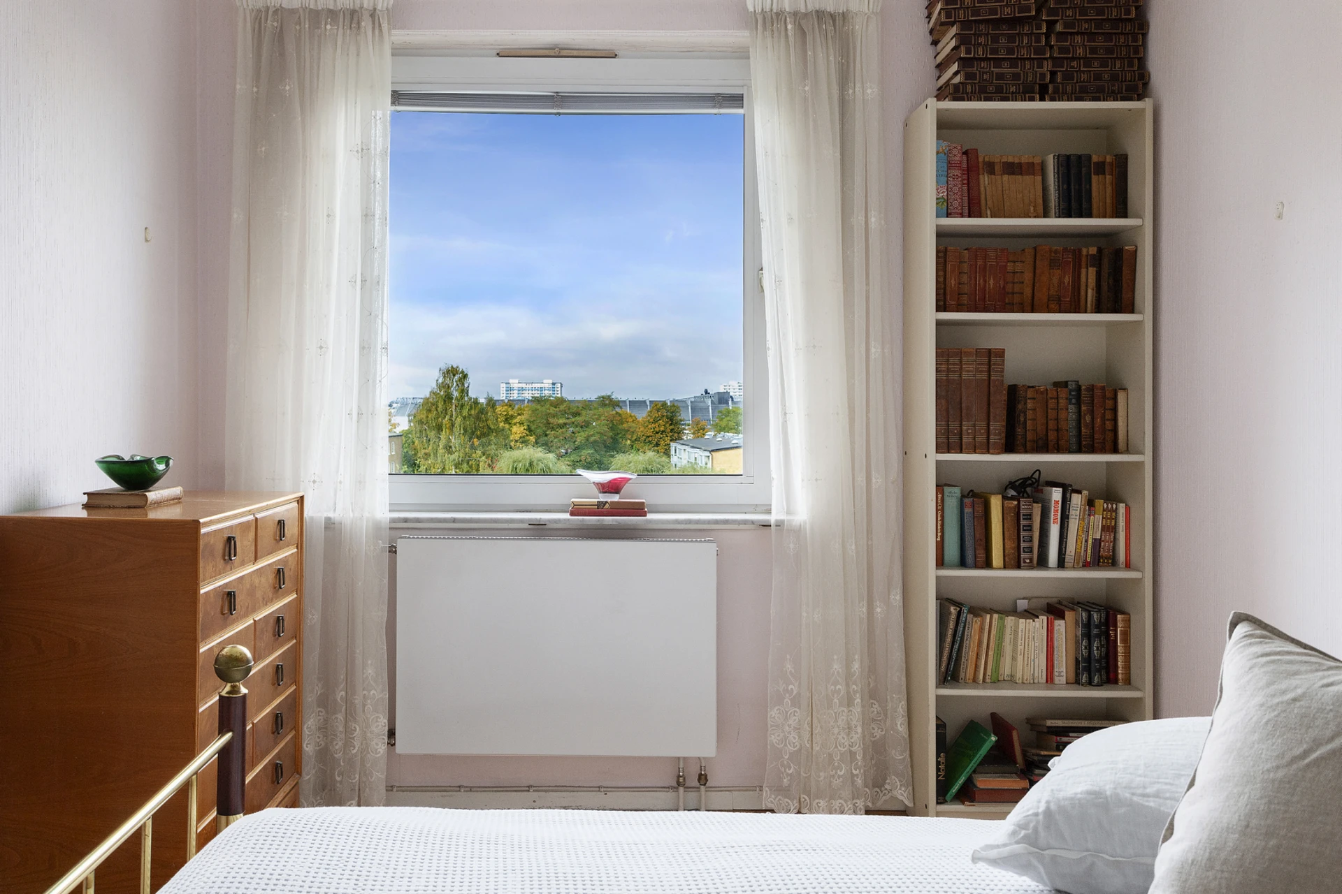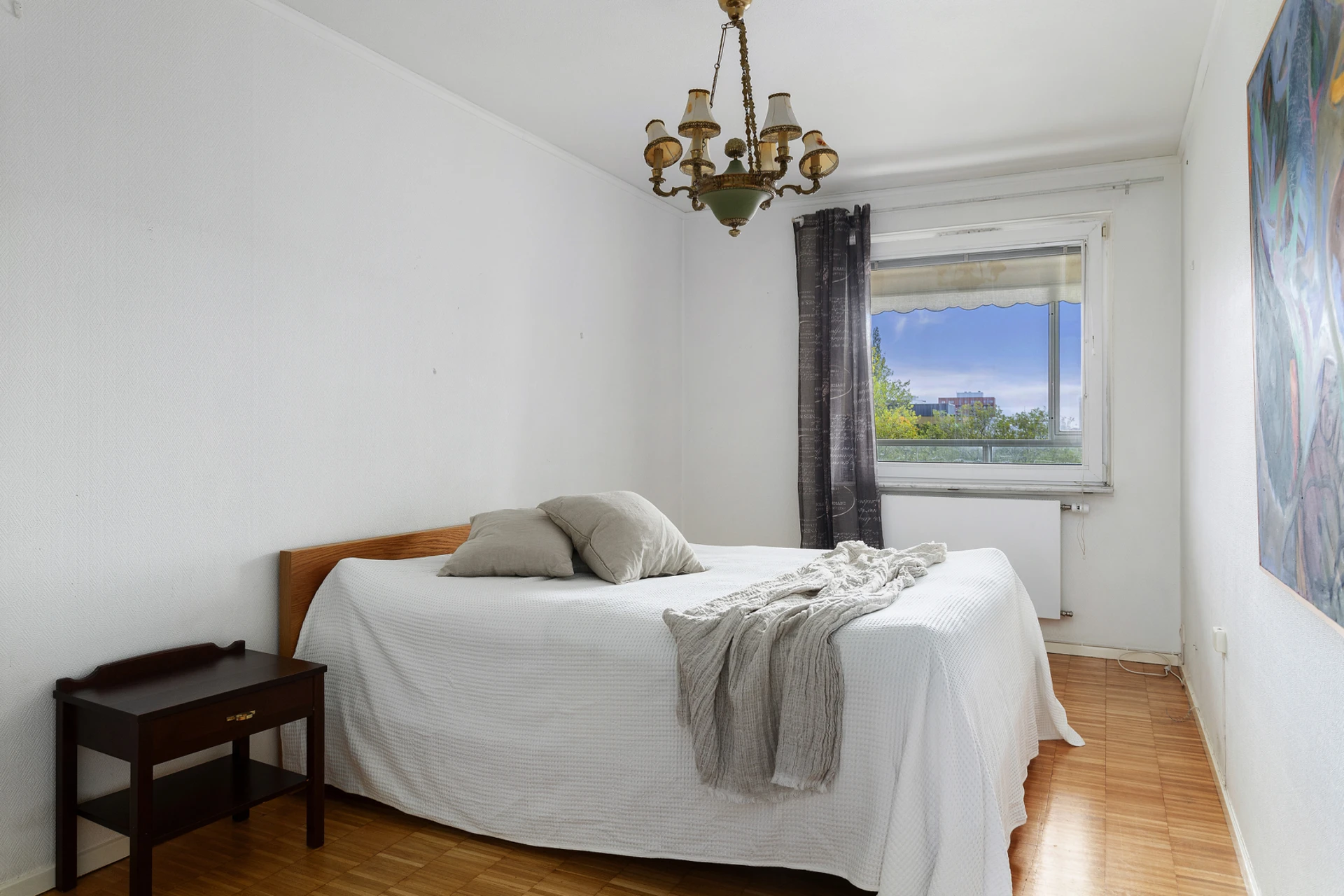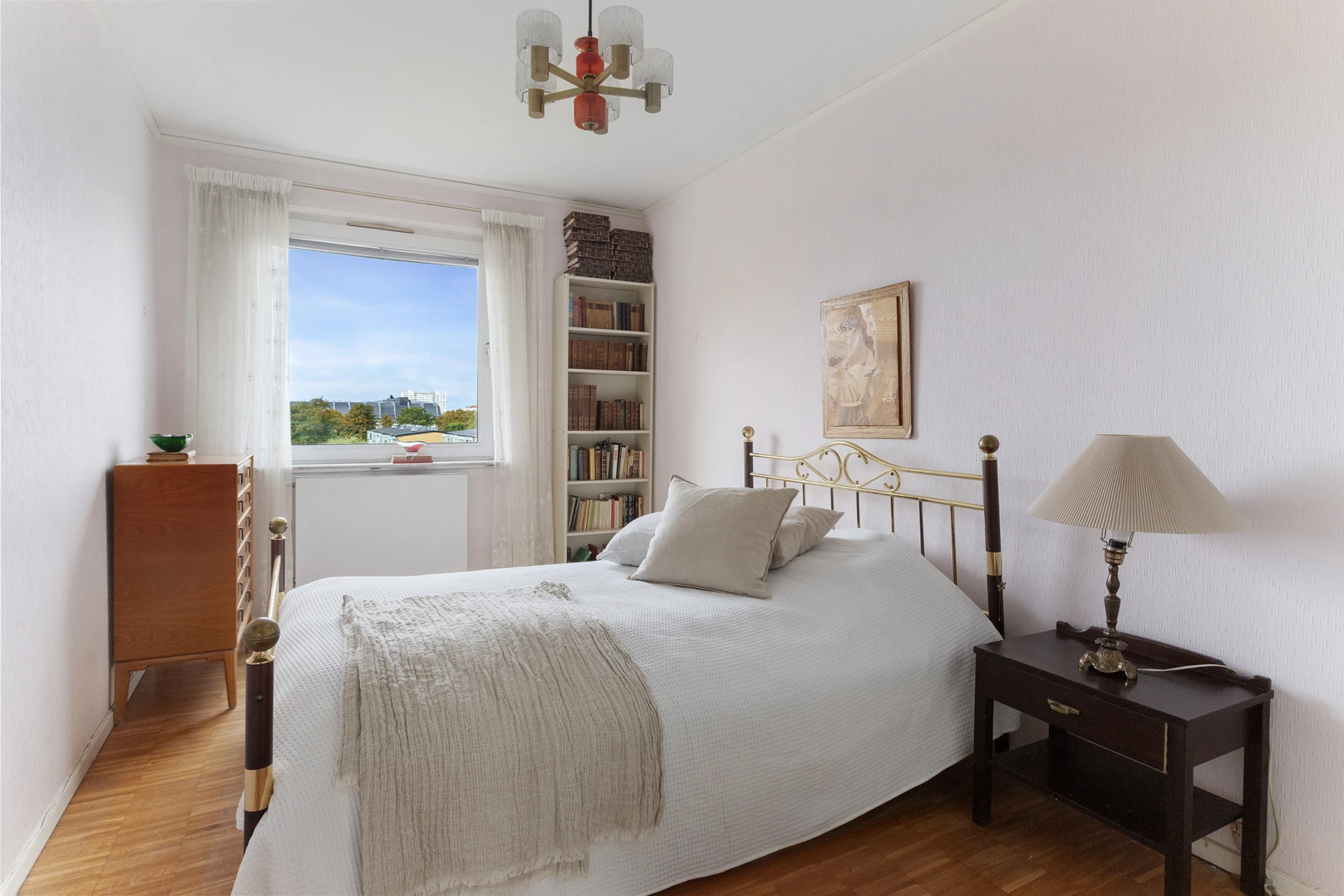 Parkettgolv i original och ljusa väggar. Utgång till balkong i öster.