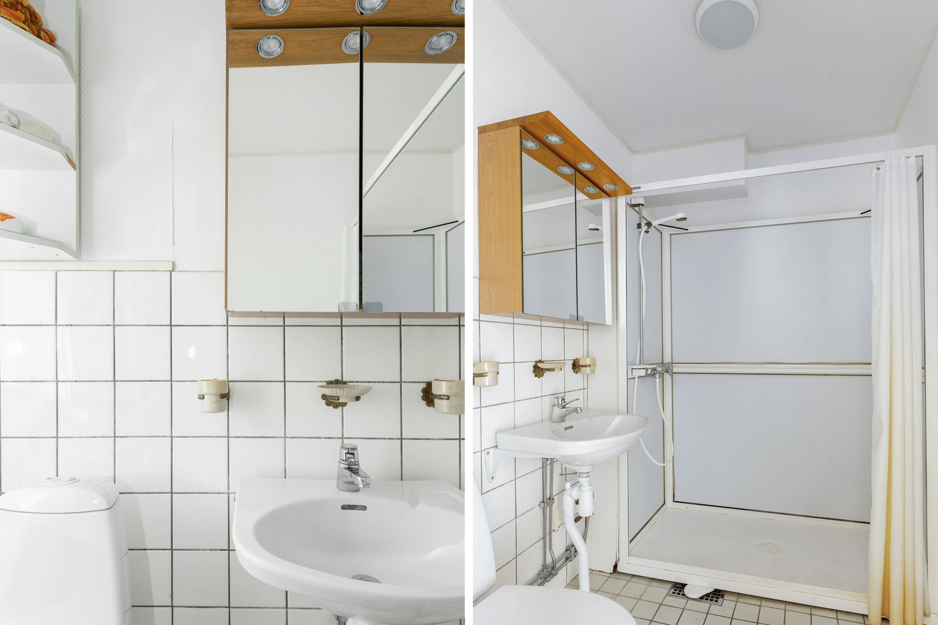 Ljus klinker och vitt kakel på halvvägg, ovan målat i vitt. Duschkabin, handfat, spegelskåp och WC.