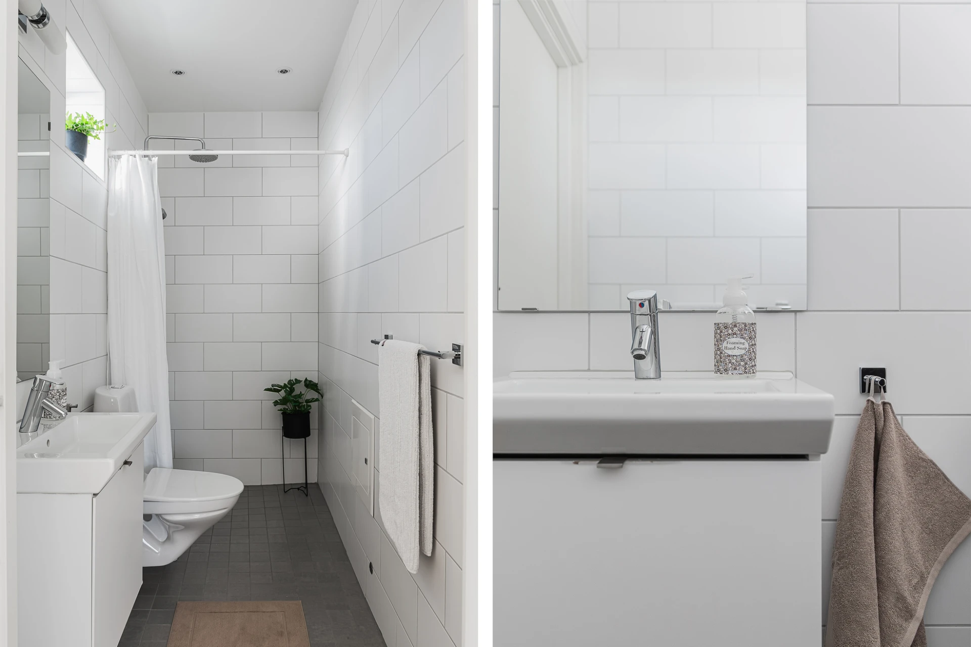 Grå klinker och vitt kakel samt spotlights i tak. Vägghängd WC, handfat med kommod, spegel och takdusch.