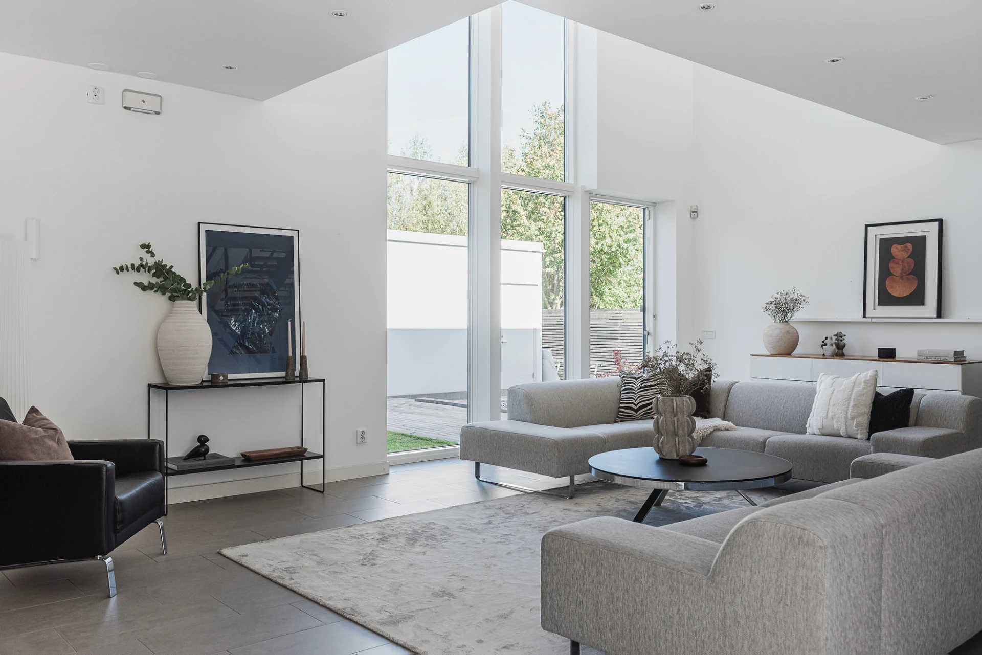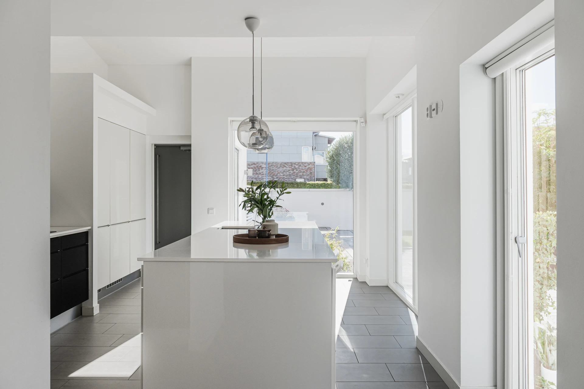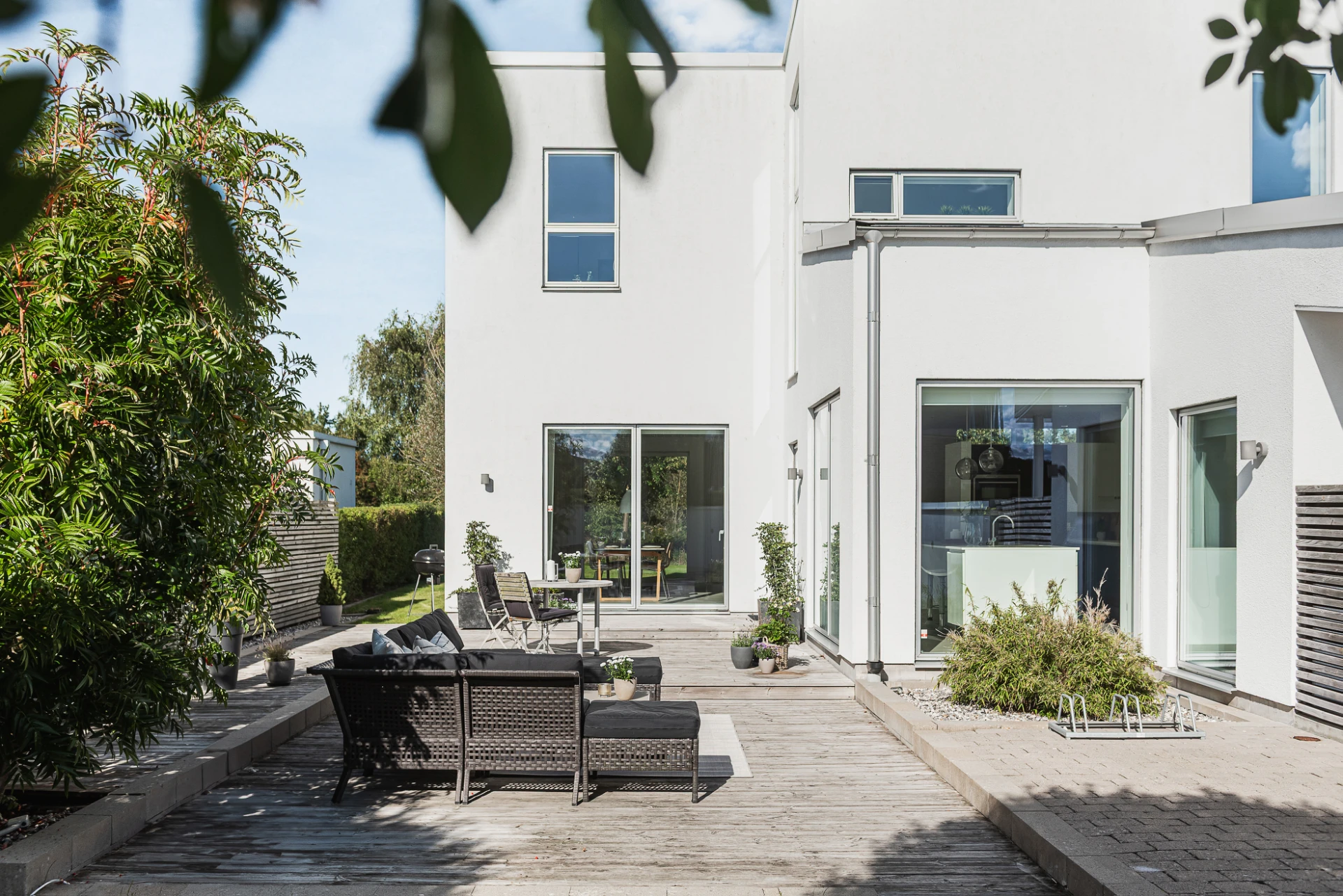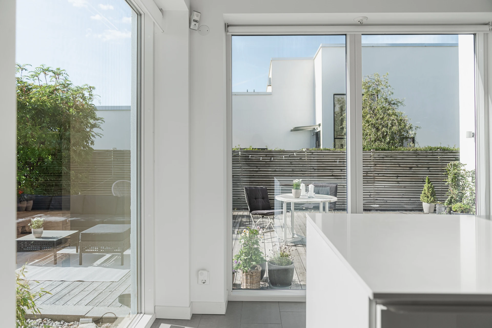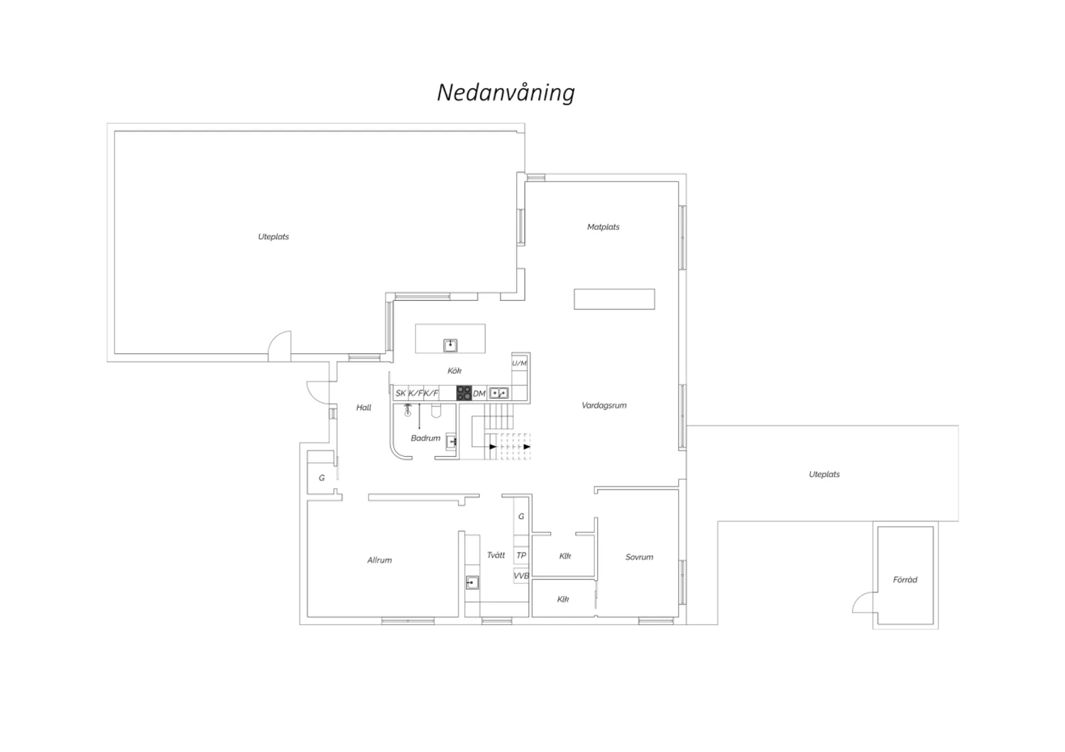 Grå klinker och vita väggar samt spotlights i tak. Höga fönsterpartier, öppet i nock och utgång till uteplats i nordväst. Möbel i mörkt trä med skåpsförvaring och plats för TV bryter av mot matplatsen. Ifrån matplatsen nås uteplatsen i sydväst. Trappa i ek med svart profil leder till ovanvåningen.