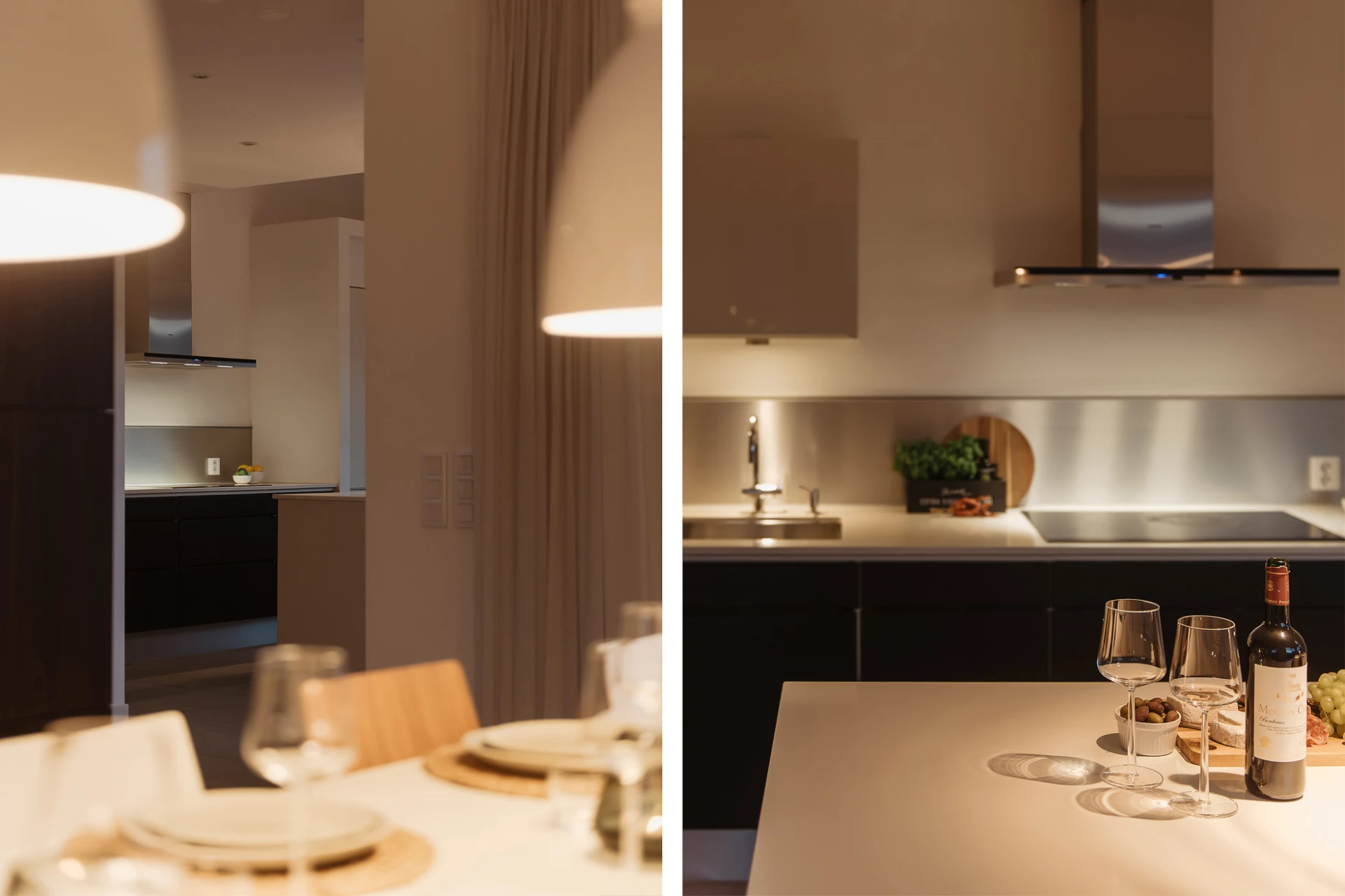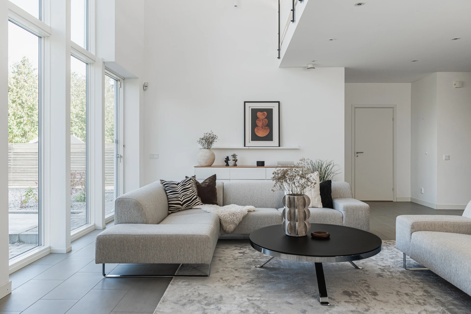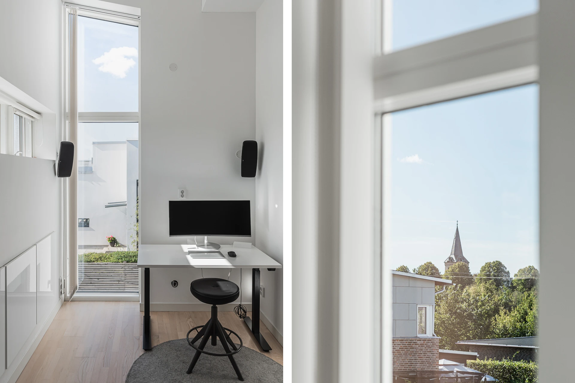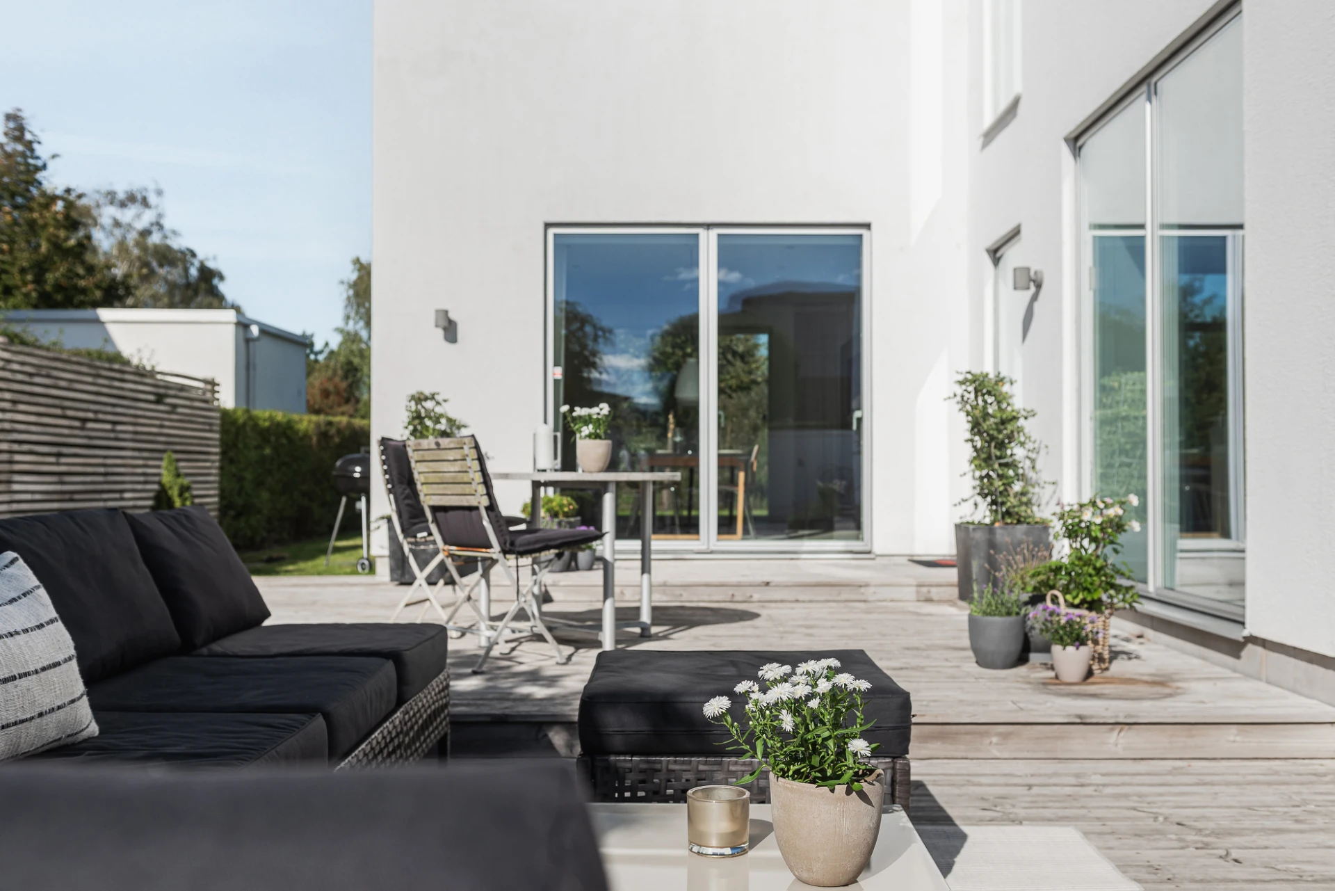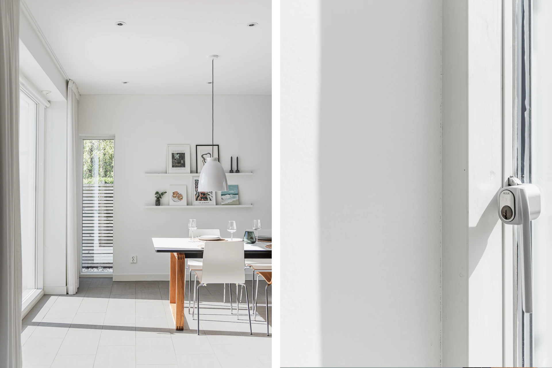 Grå klinker och vita väggar samt spotlights i tak. Höga fönsterpartier, öppet i nock och utgång till uteplats i nordväst. Möbel i mörkt trä med skåpsförvaring och plats för TV bryter av mot matplatsen. Ifrån matplatsen nås uteplatsen i sydväst. Trappa i ek med svart profil leder till ovanvåningen.