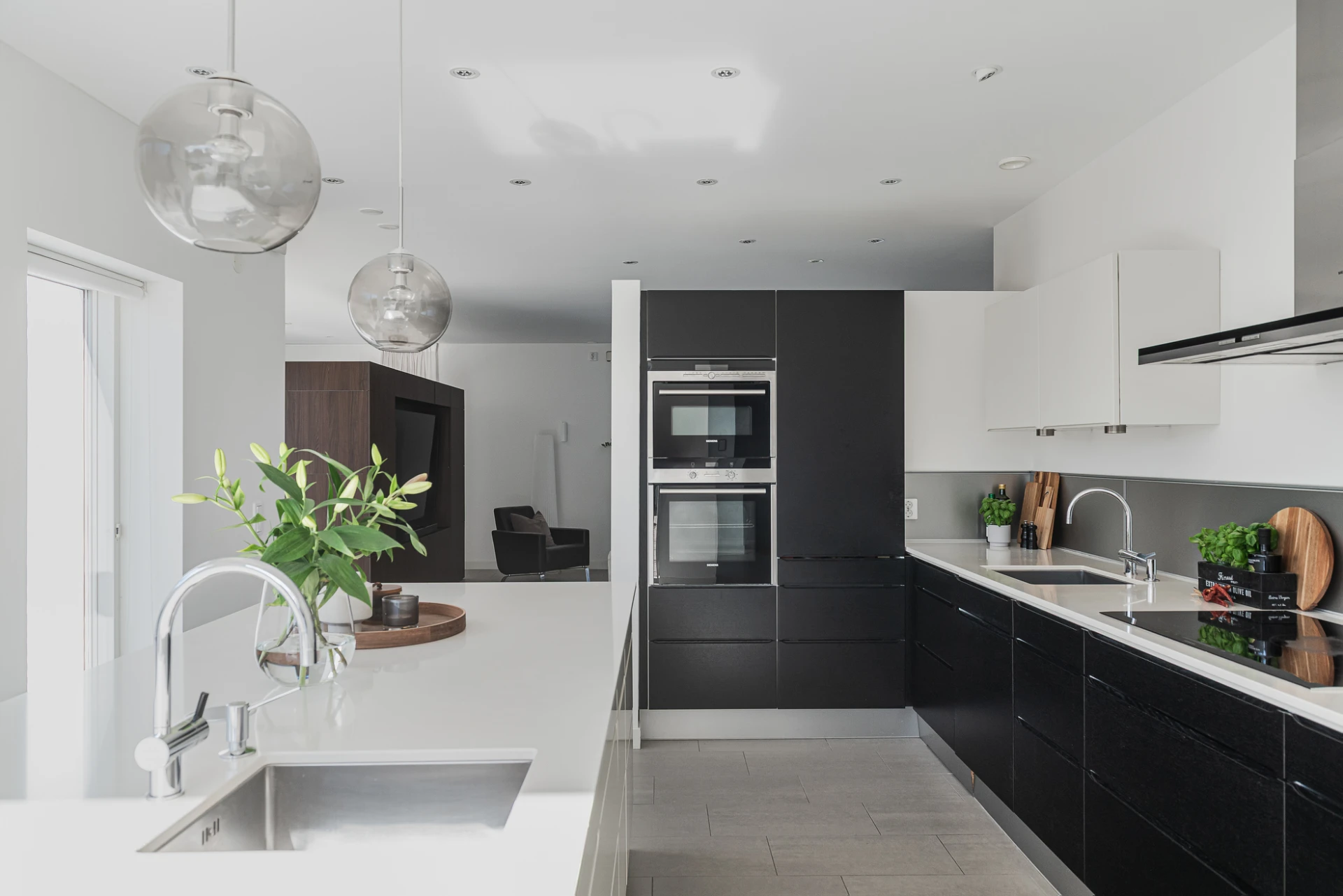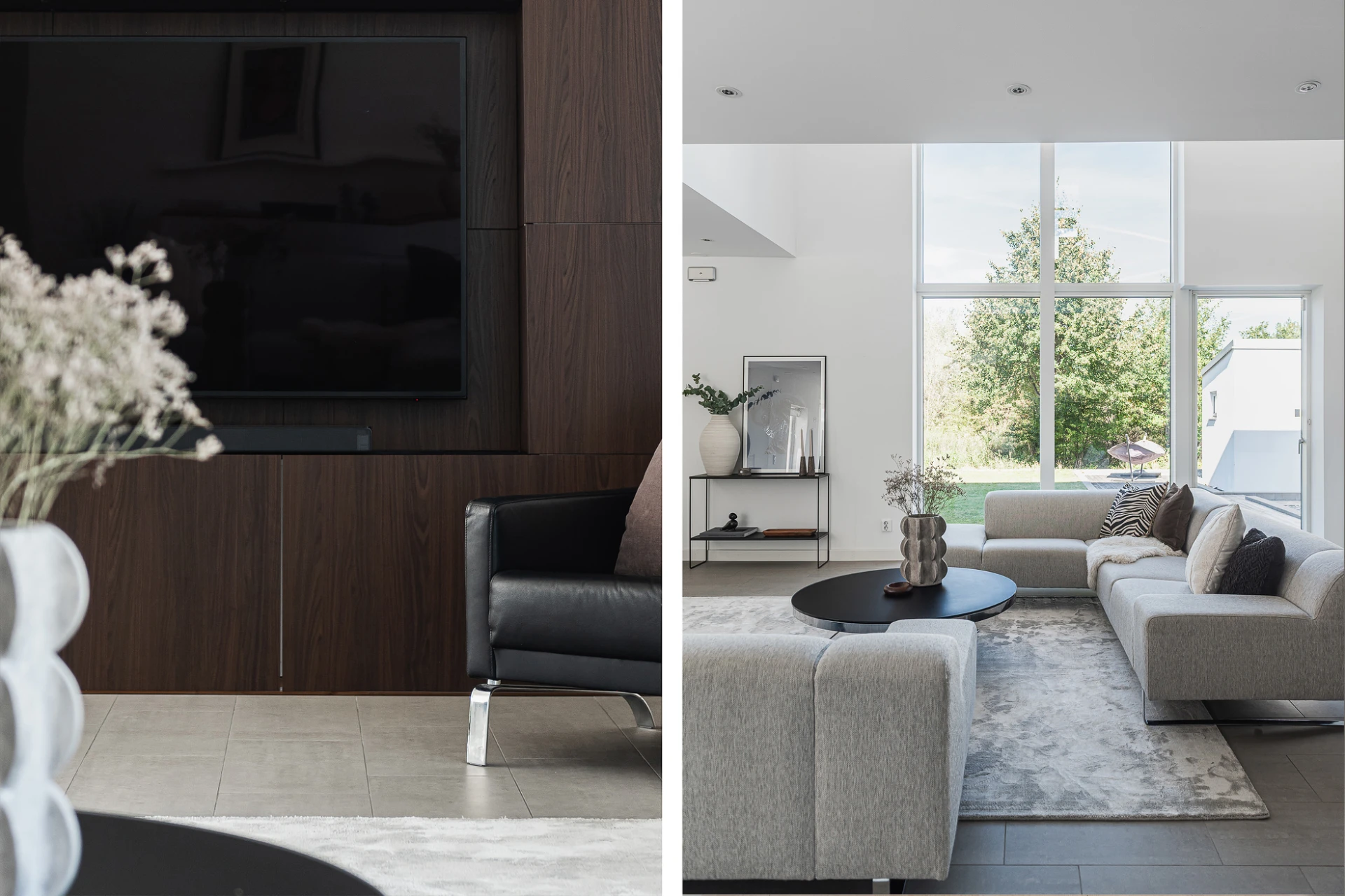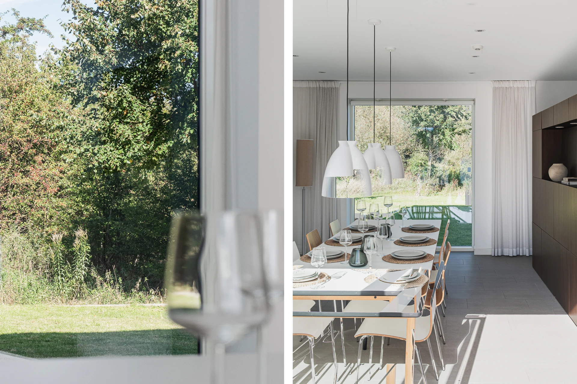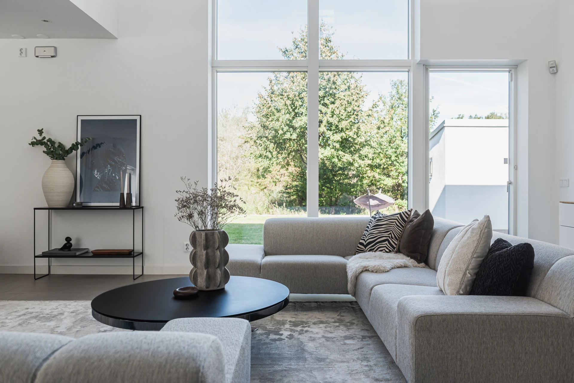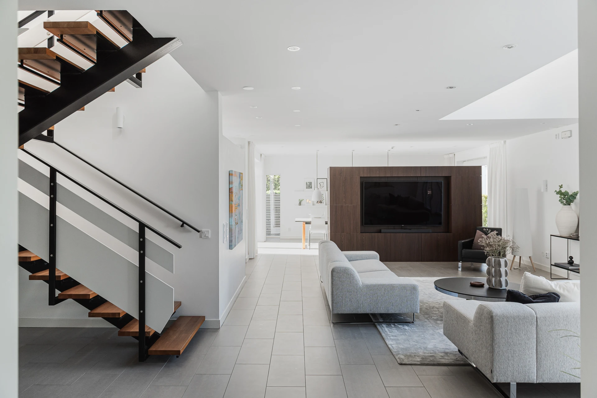 Grå klinker och vita väggar samt spotlights i tak. Höga fönsterpartier, öppet i nock och utgång till uteplats i nordväst. Möbel i mörkt trä med skåpsförvaring och plats för TV bryter av mot matplatsen. Ifrån matplatsen nås uteplatsen i sydväst. Trappa i ek med svart profil leder till ovanvåningen.