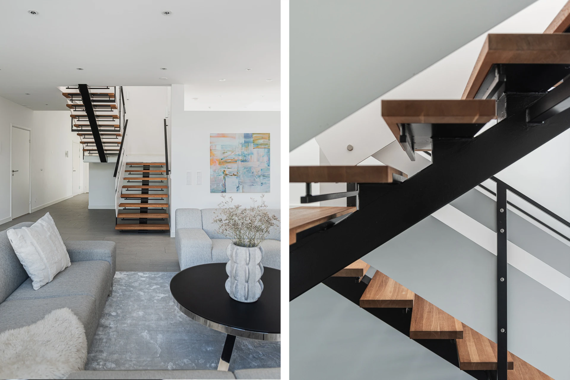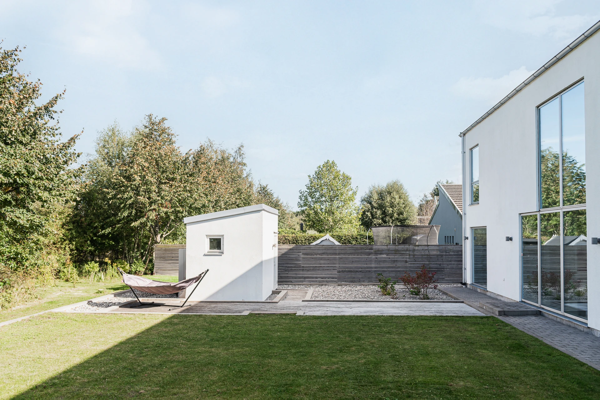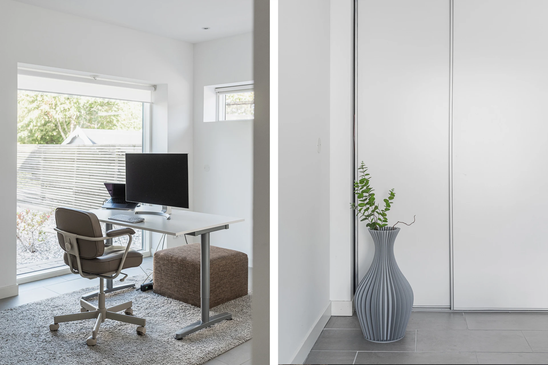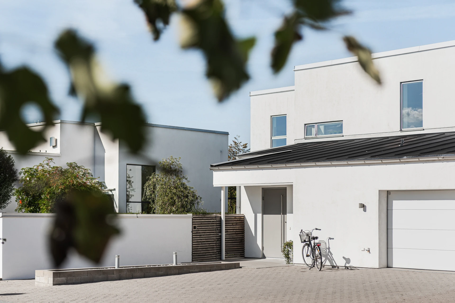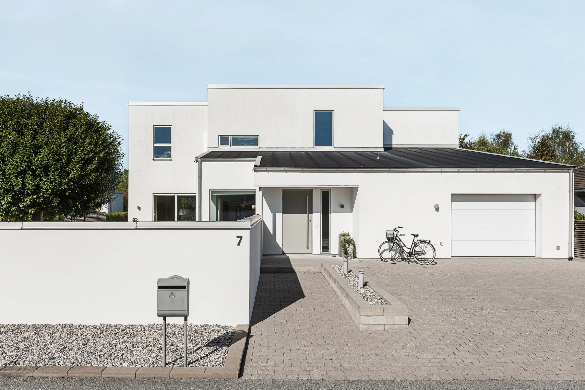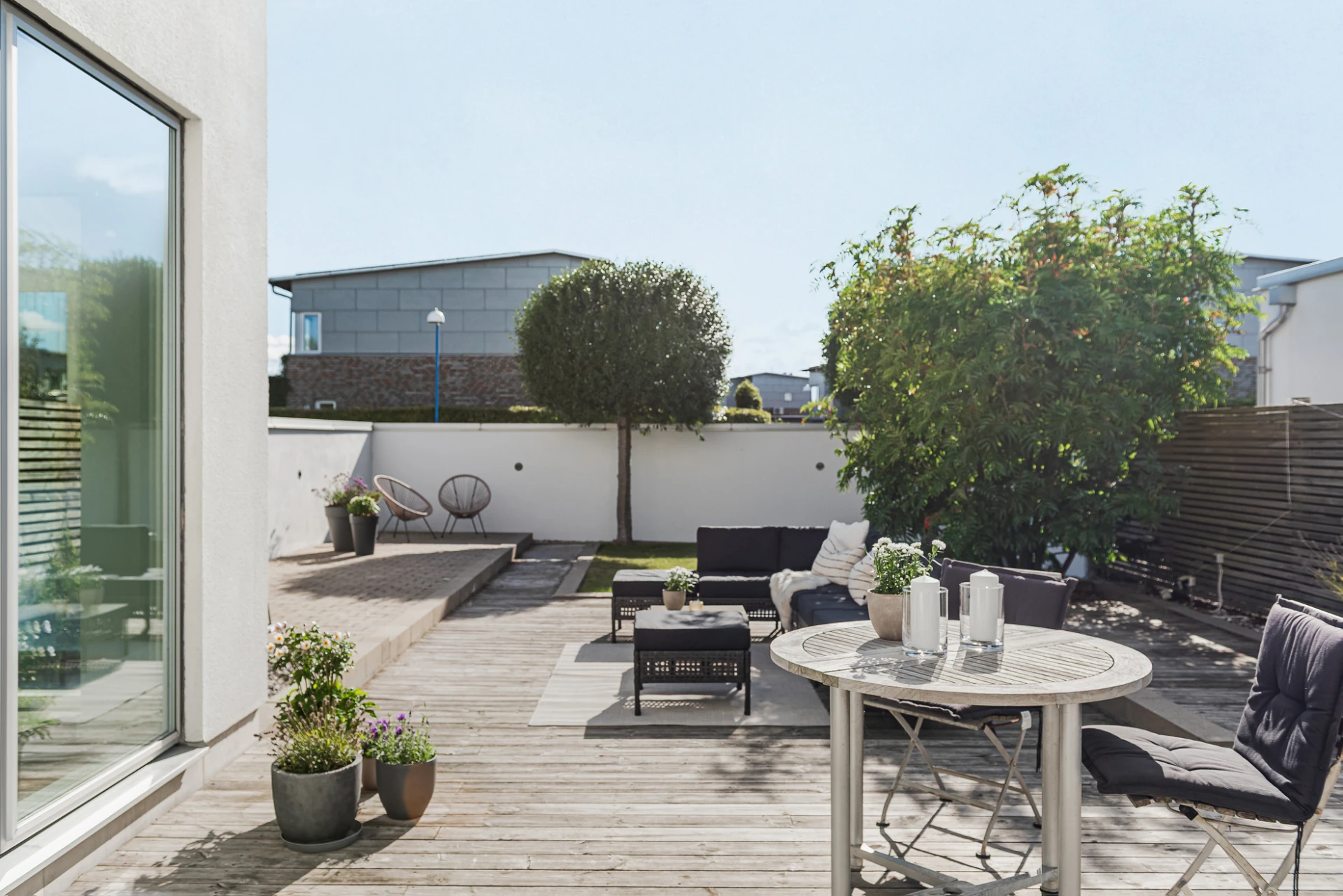 Grå klinker och vita väggar samt spotlights i tak. Höga fönsterpartier, öppet i nock och utgång till uteplats i nordväst. Möbel i mörkt trä med skåpsförvaring och plats för TV bryter av mot matplatsen. Ifrån matplatsen nås uteplatsen i sydväst. Trappa i ek med svart profil leder till ovanvåningen.