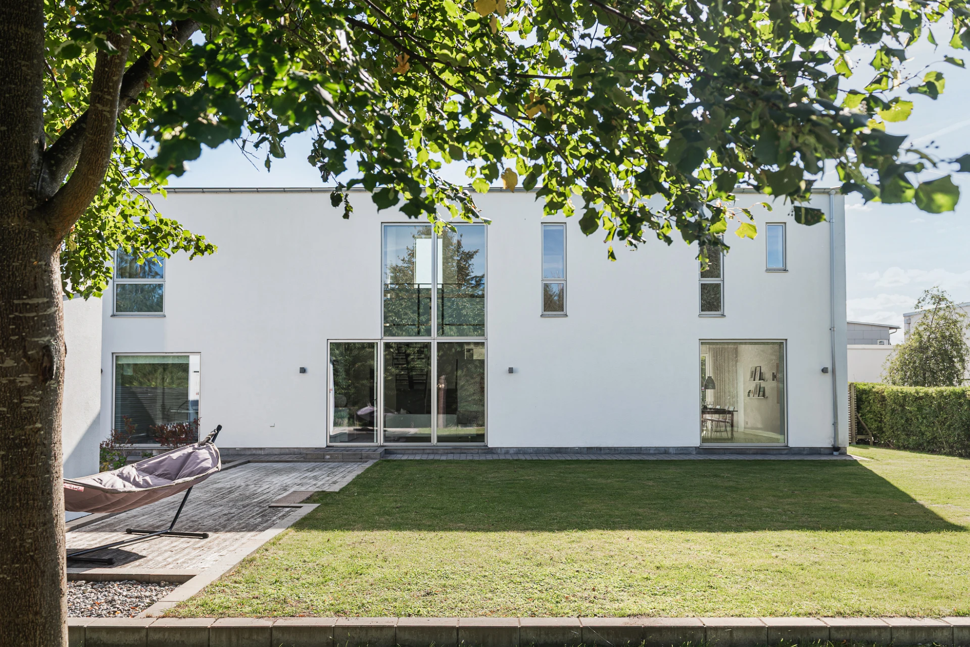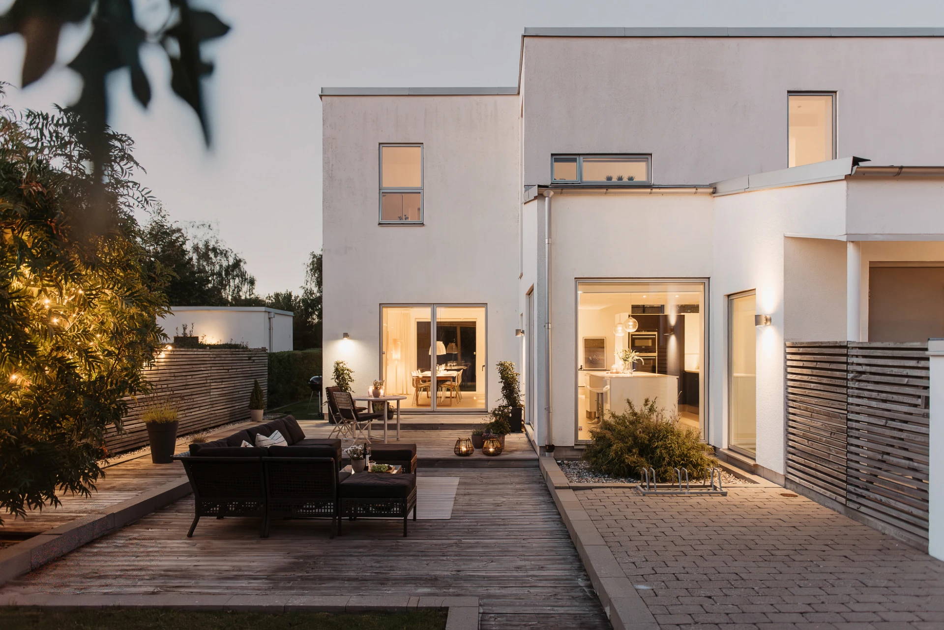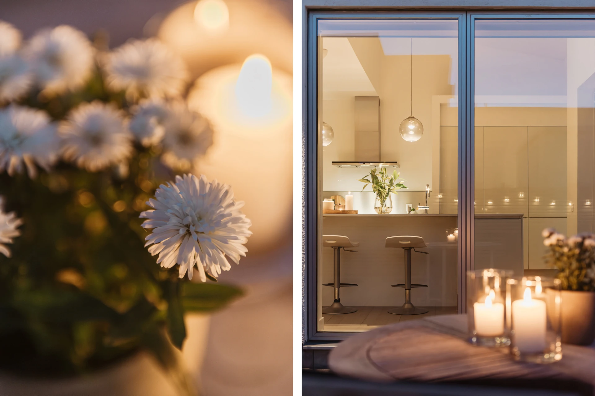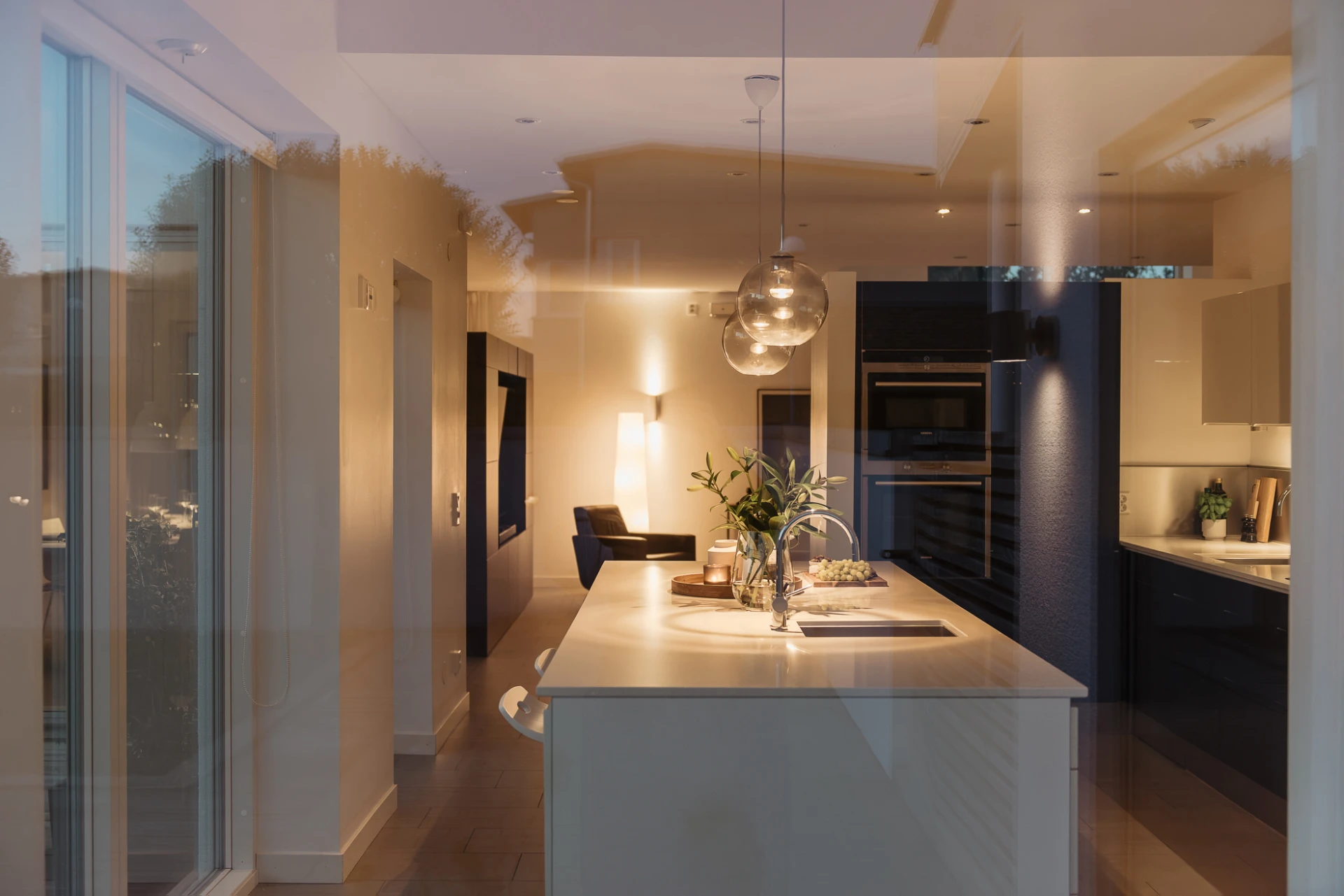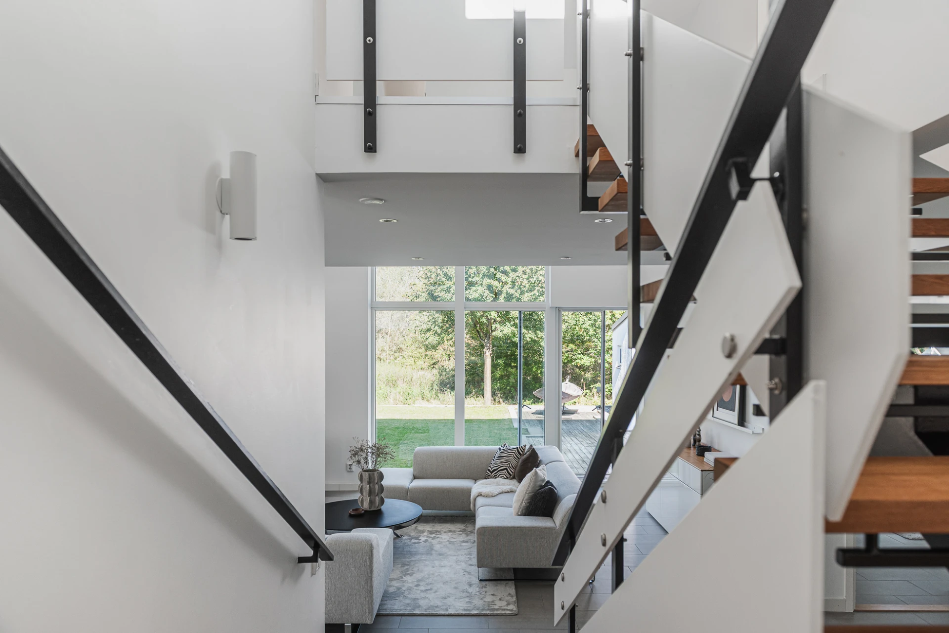 Grå klinker och vita väggar samt spotlights i tak. Höga fönsterpartier, öppet i nock och utgång till uteplats i nordväst. Möbel i mörkt trä med skåpsförvaring och plats för TV bryter av mot matplatsen. Ifrån matplatsen nås uteplatsen i sydväst. Trappa i ek med svart profil leder till ovanvåningen.