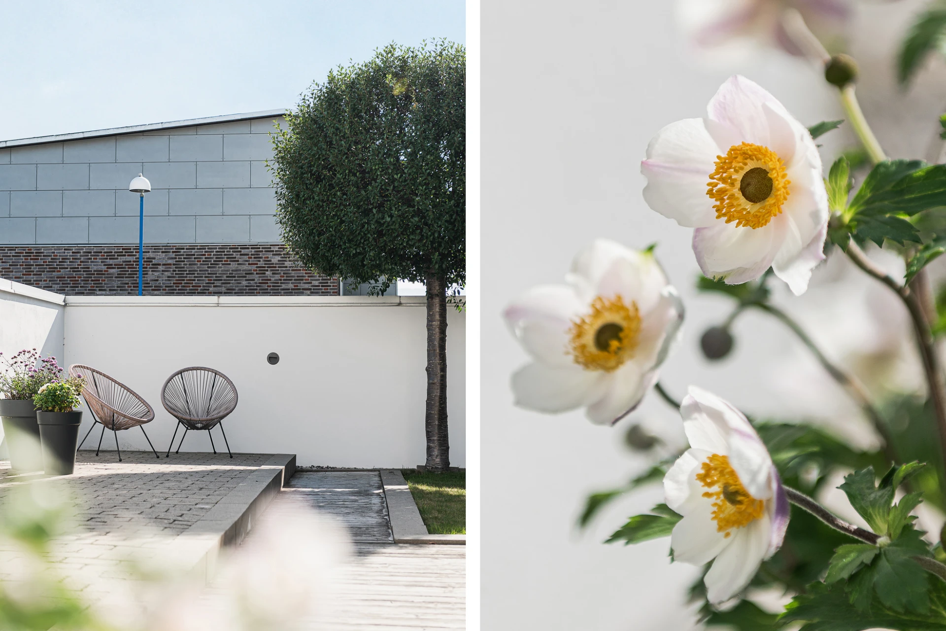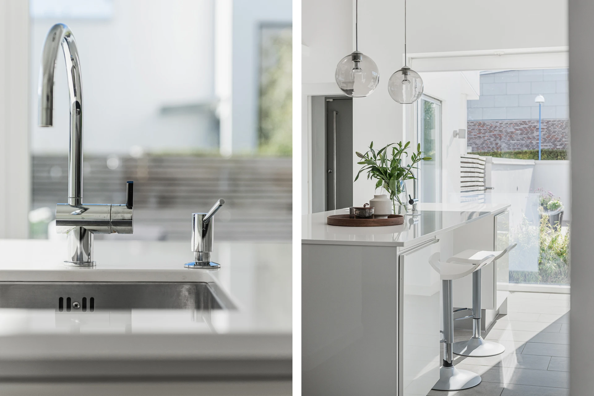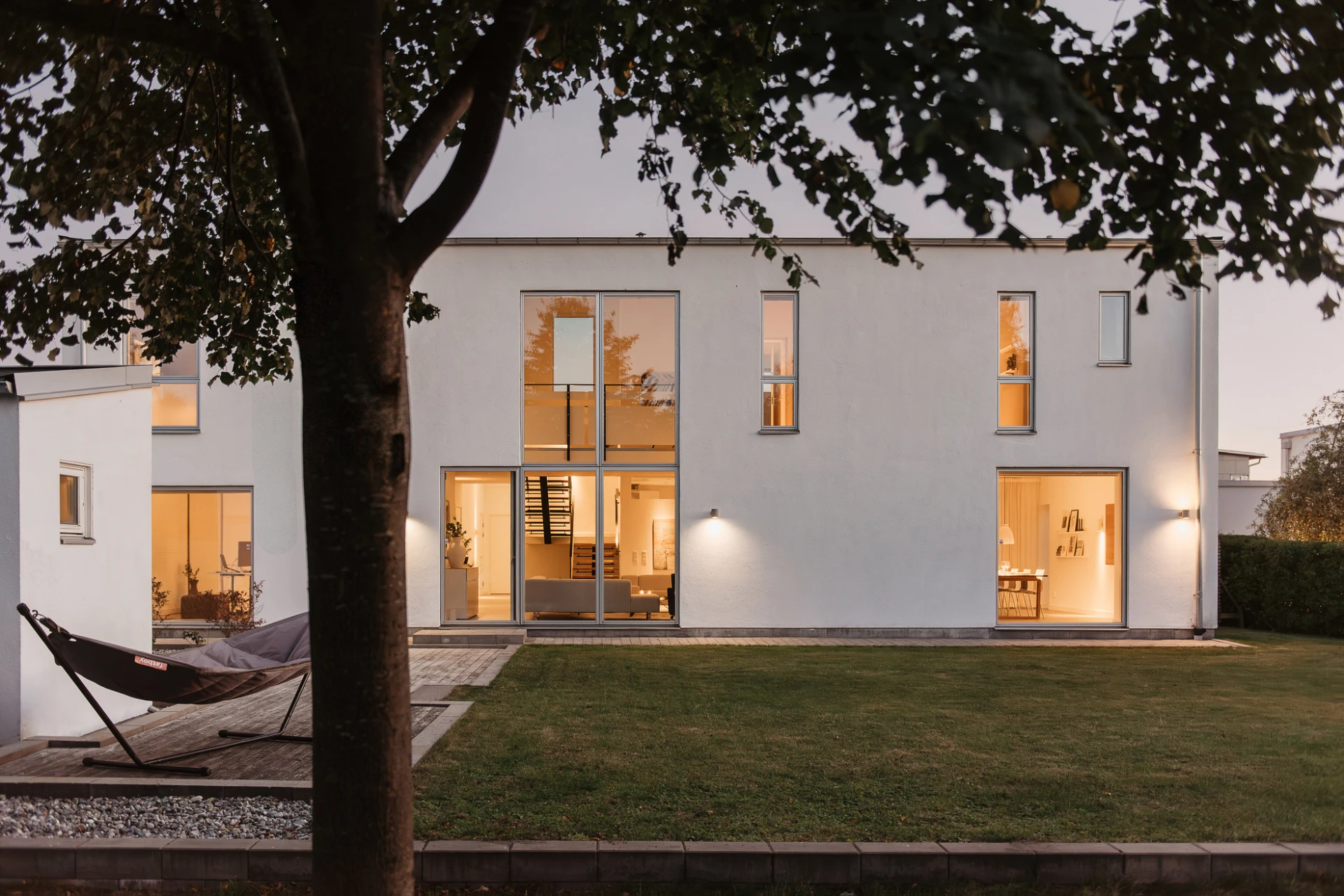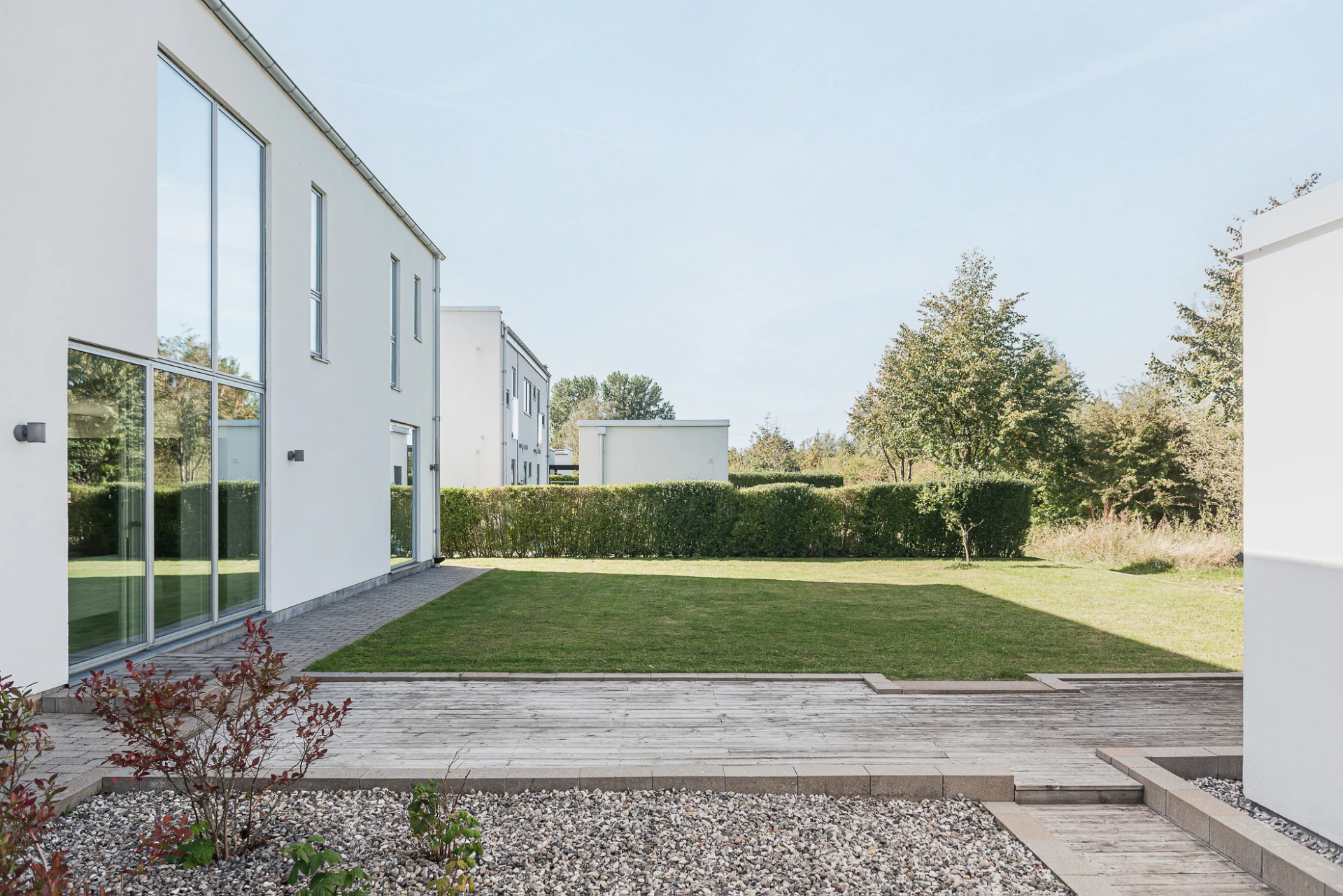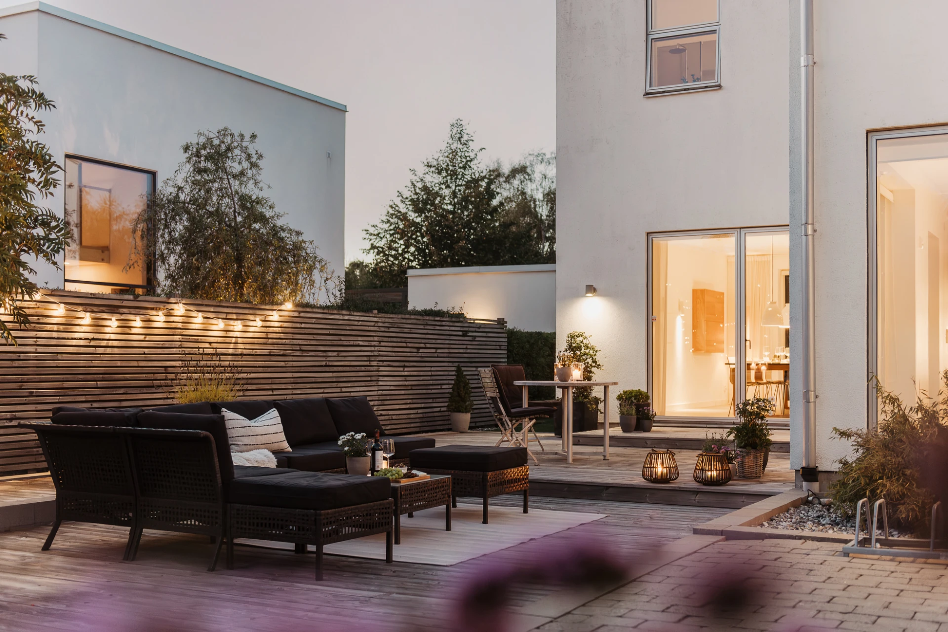 Grå klinker och vita väggar samt spotlights i tak. Höga fönsterpartier, öppet i nock och utgång till uteplats i nordväst. Möbel i mörkt trä med skåpsförvaring och plats för TV bryter av mot matplatsen. Ifrån matplatsen nås uteplatsen i sydväst. Trappa i ek med svart profil leder till ovanvåningen.