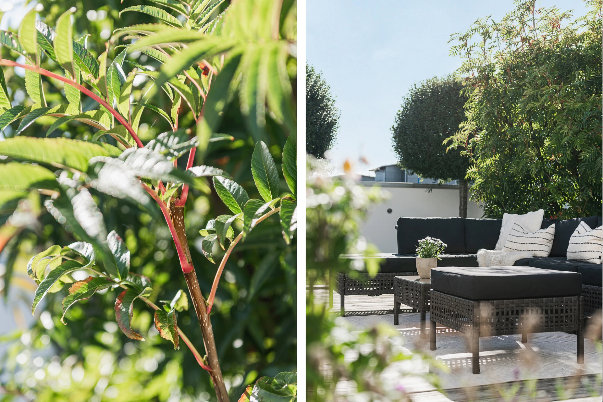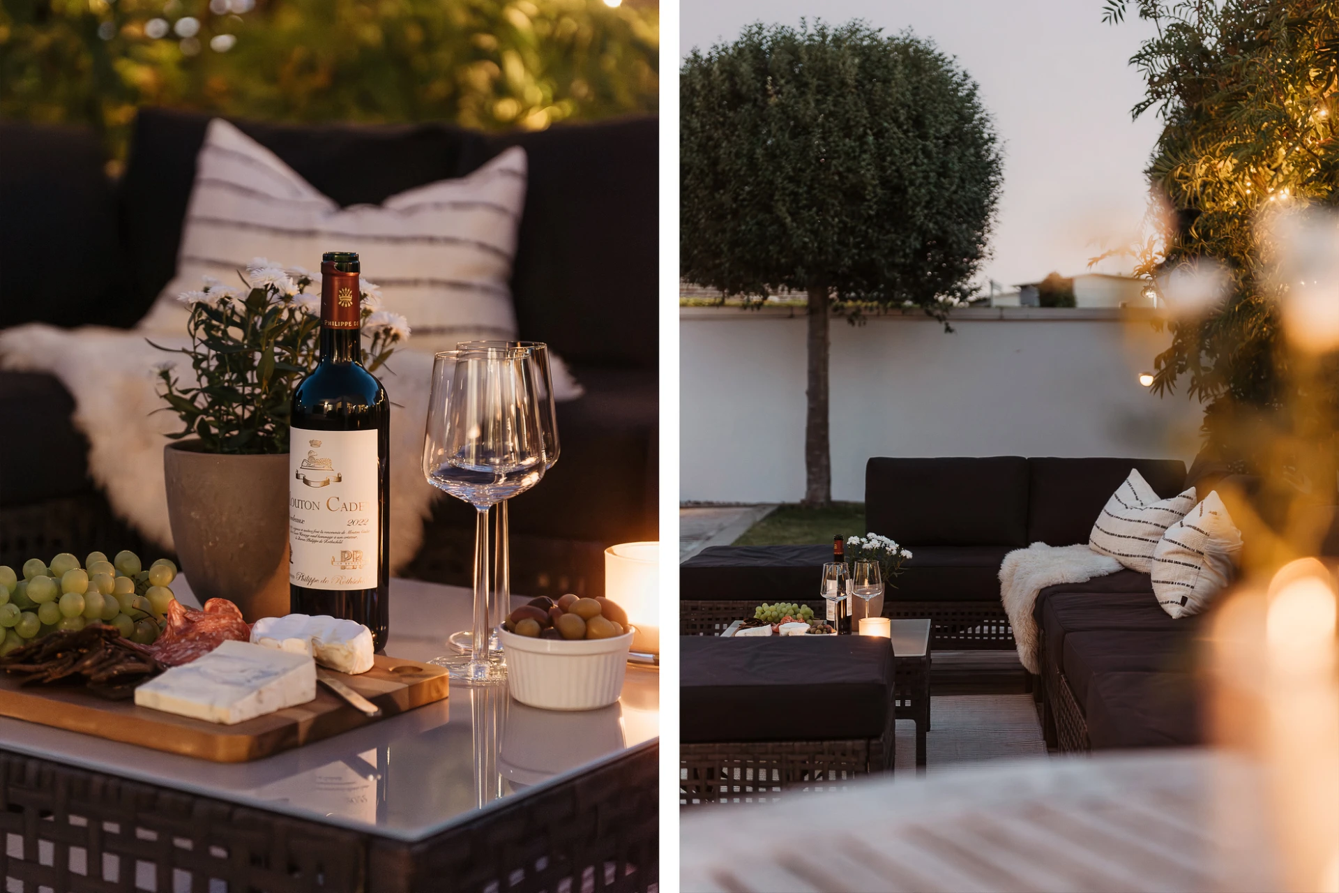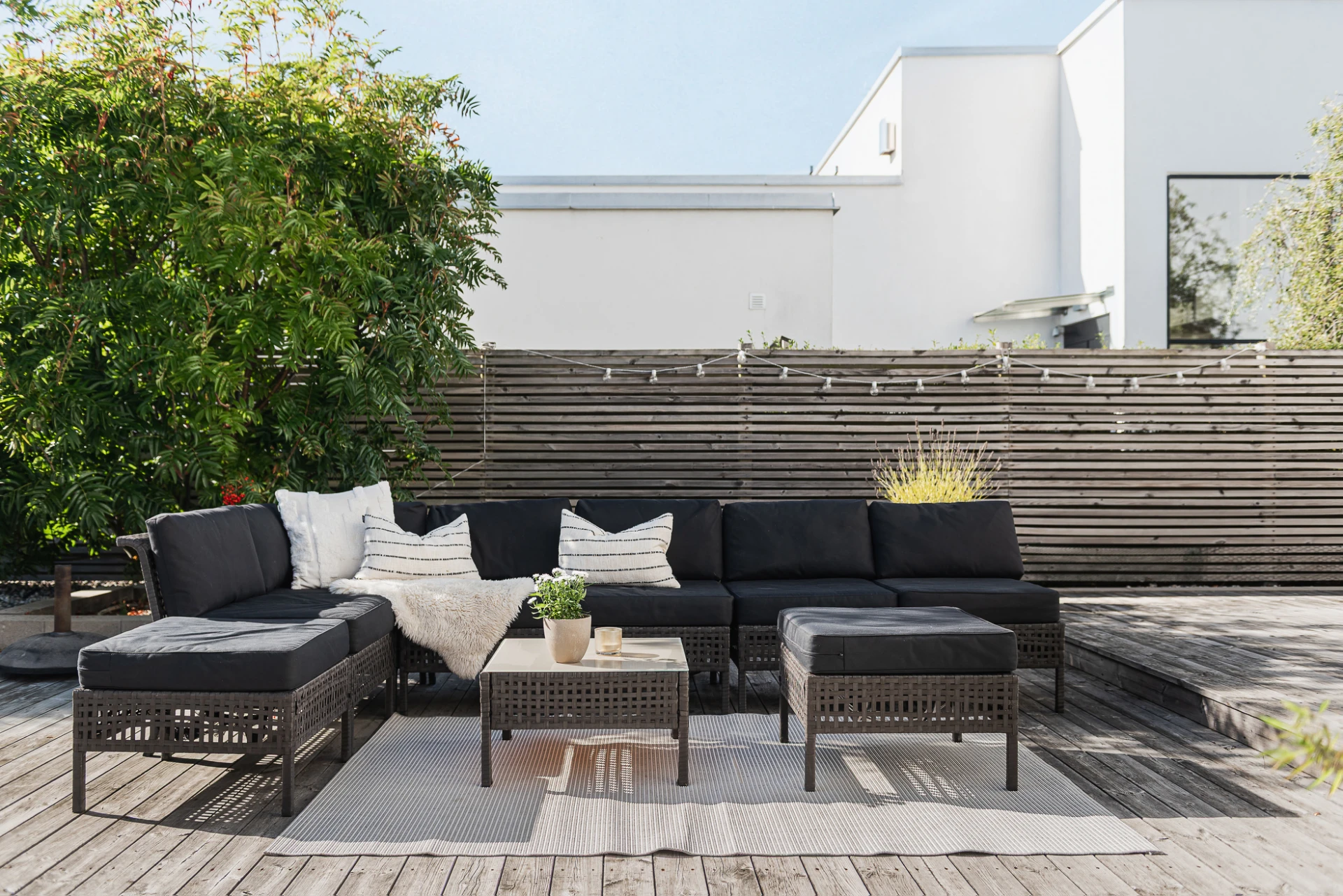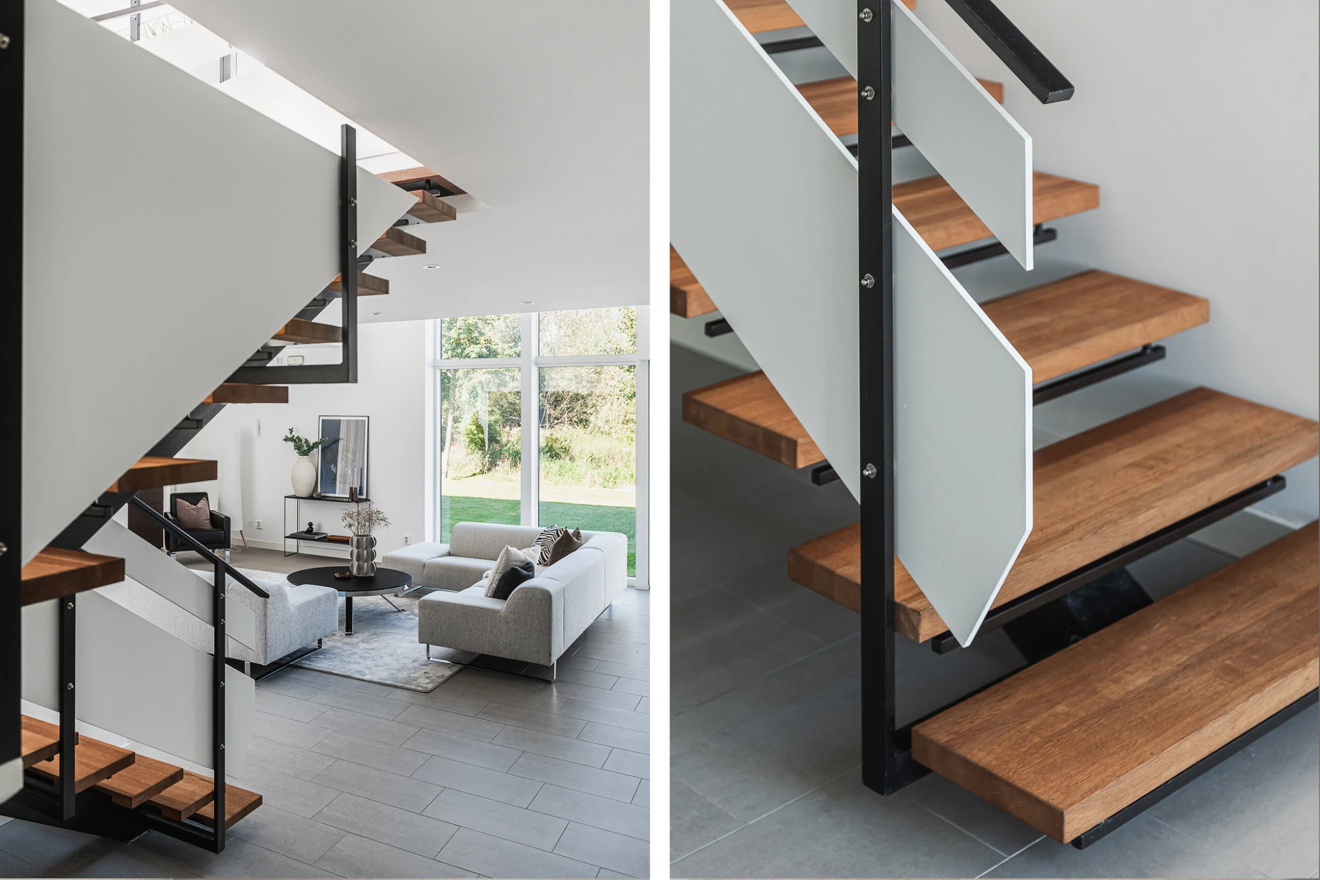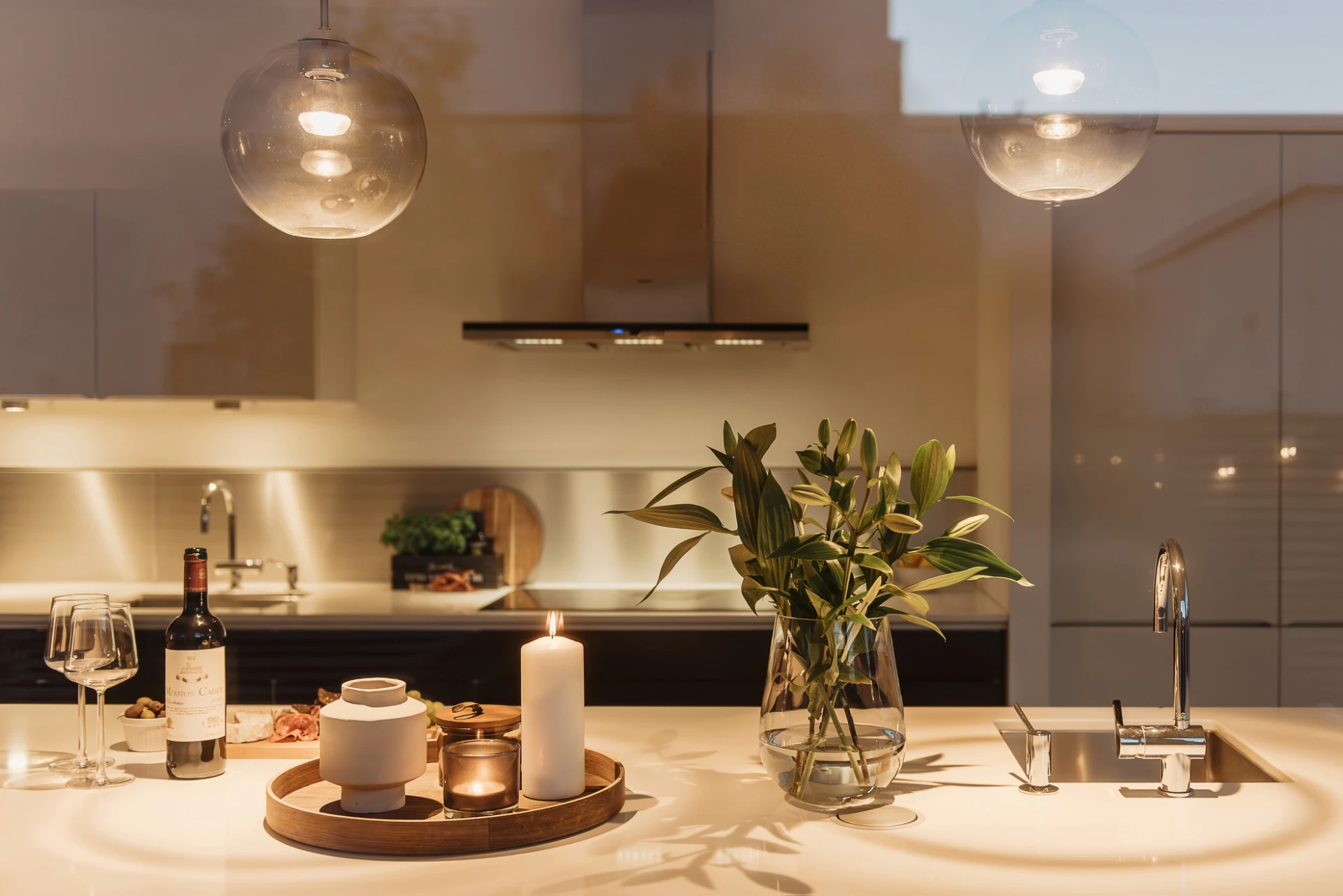 Grå klinker och vita väggar samt spotlights i tak. Höga fönsterpartier, öppet i nock och utgång till uteplats i nordväst. Möbel i mörkt trä med skåpsförvaring och plats för TV bryter av mot matplatsen. Ifrån matplatsen nås uteplatsen i sydväst. Trappa i ek med svart profil leder till ovanvåningen.