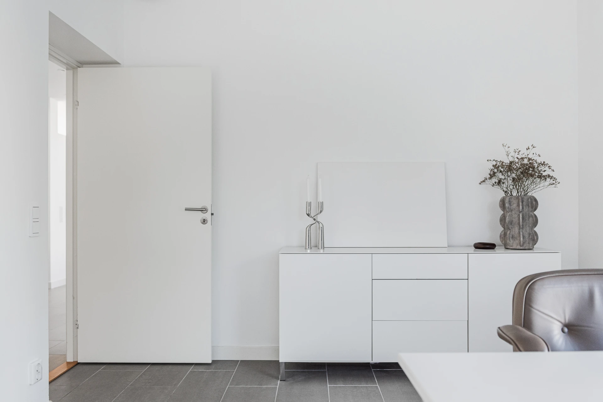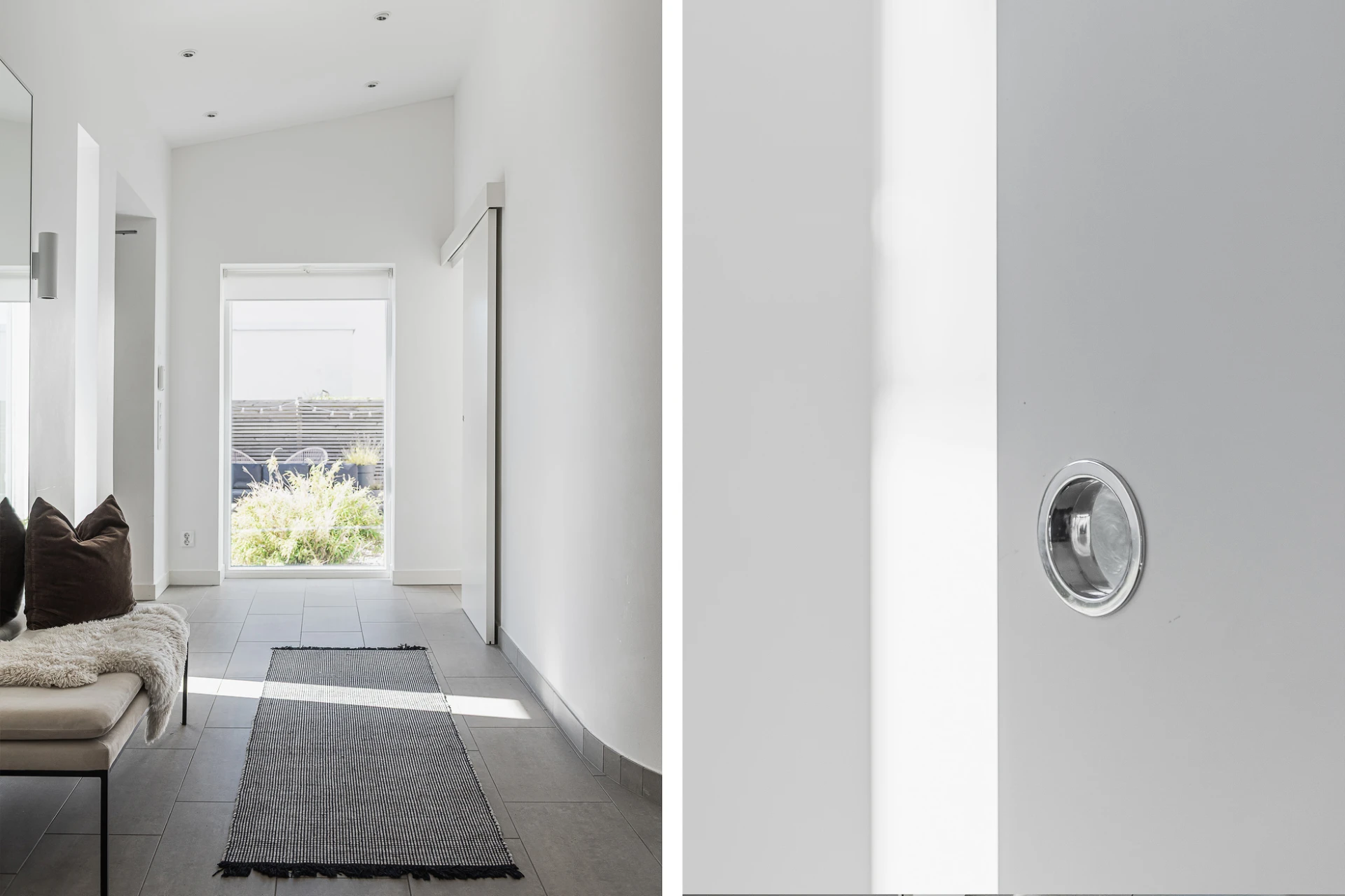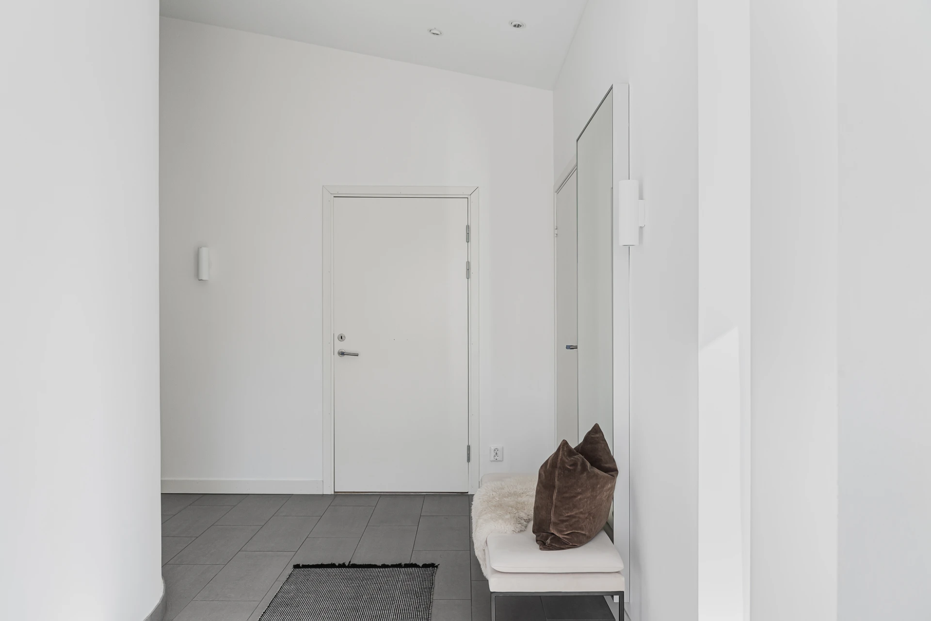 Grå klinker och vita väggar. Spotlights i tak och klädkammare bakom skjutdörrar.