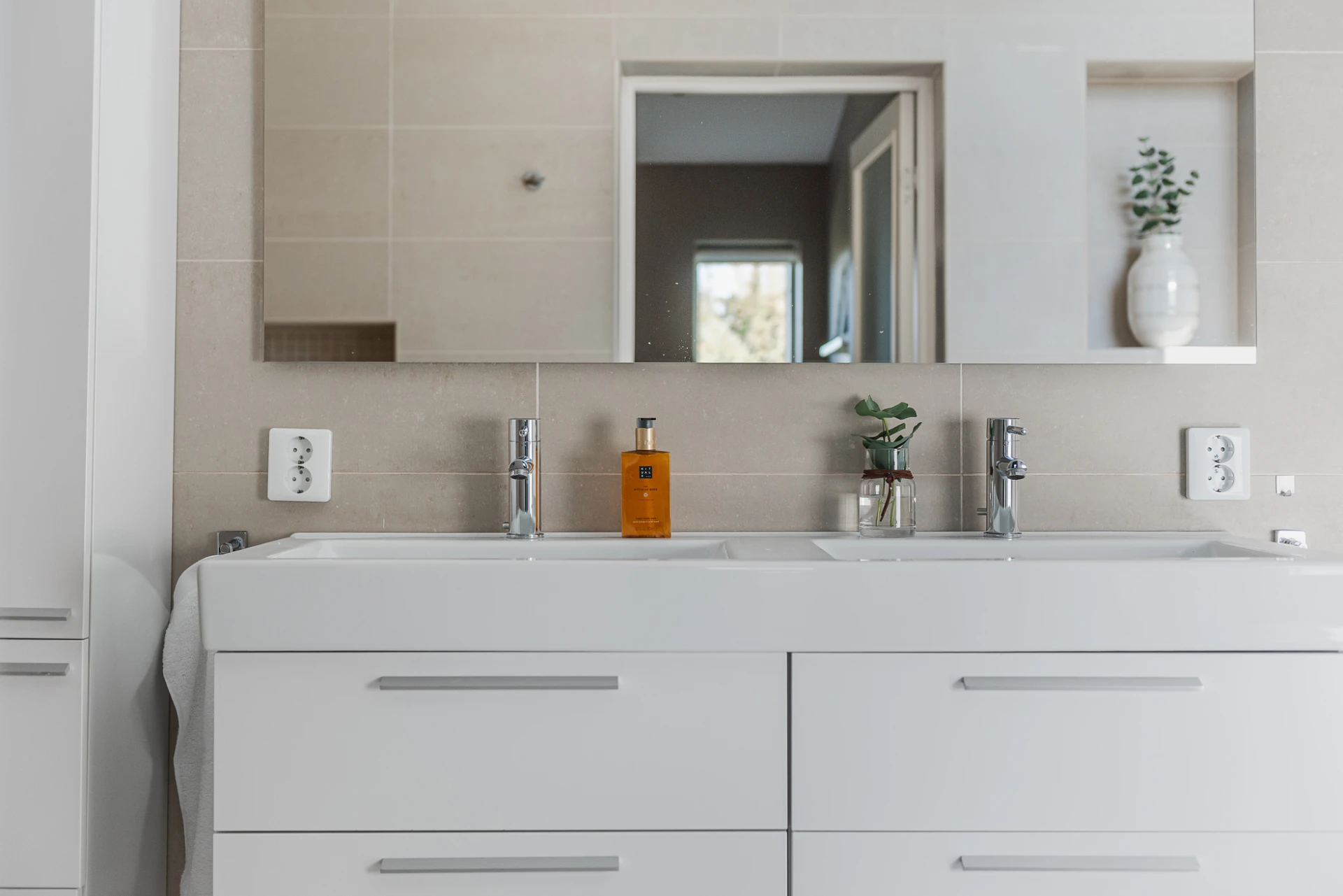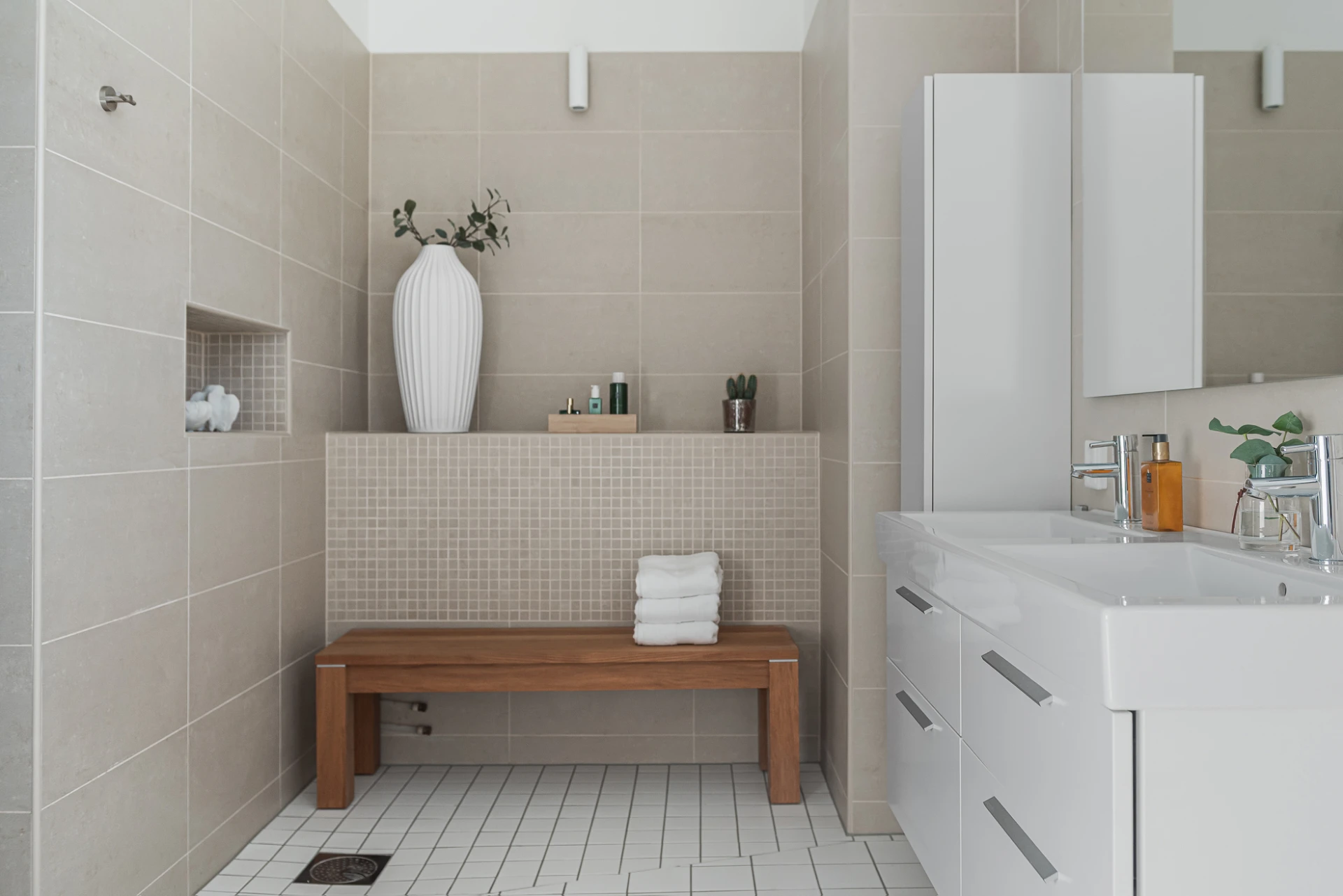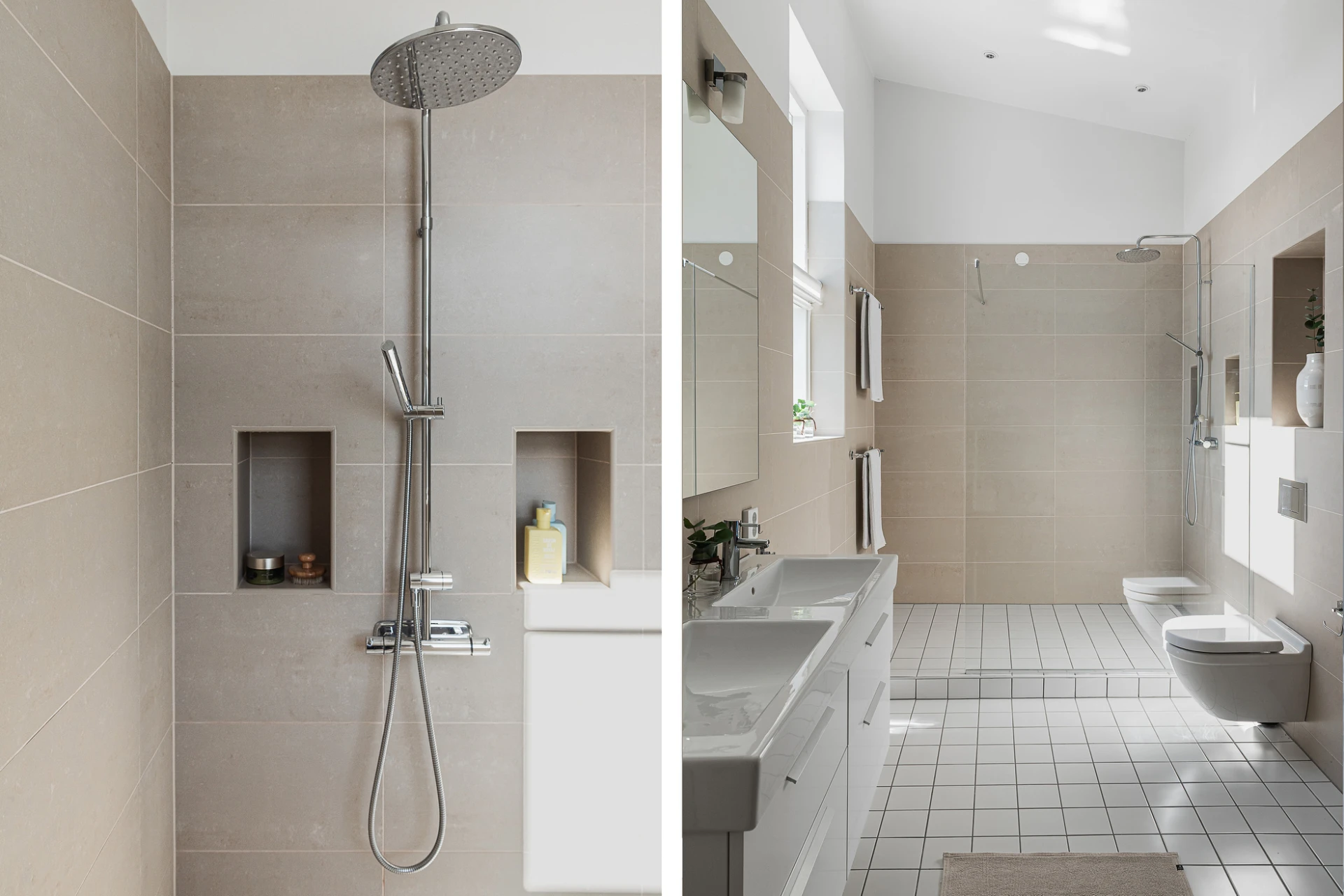Vit klinker och beige kakel samt spotlights i tak. Vägghängd WC, dubbla handfat med kommod, skåp, spegel och takdusch med duschvägg.