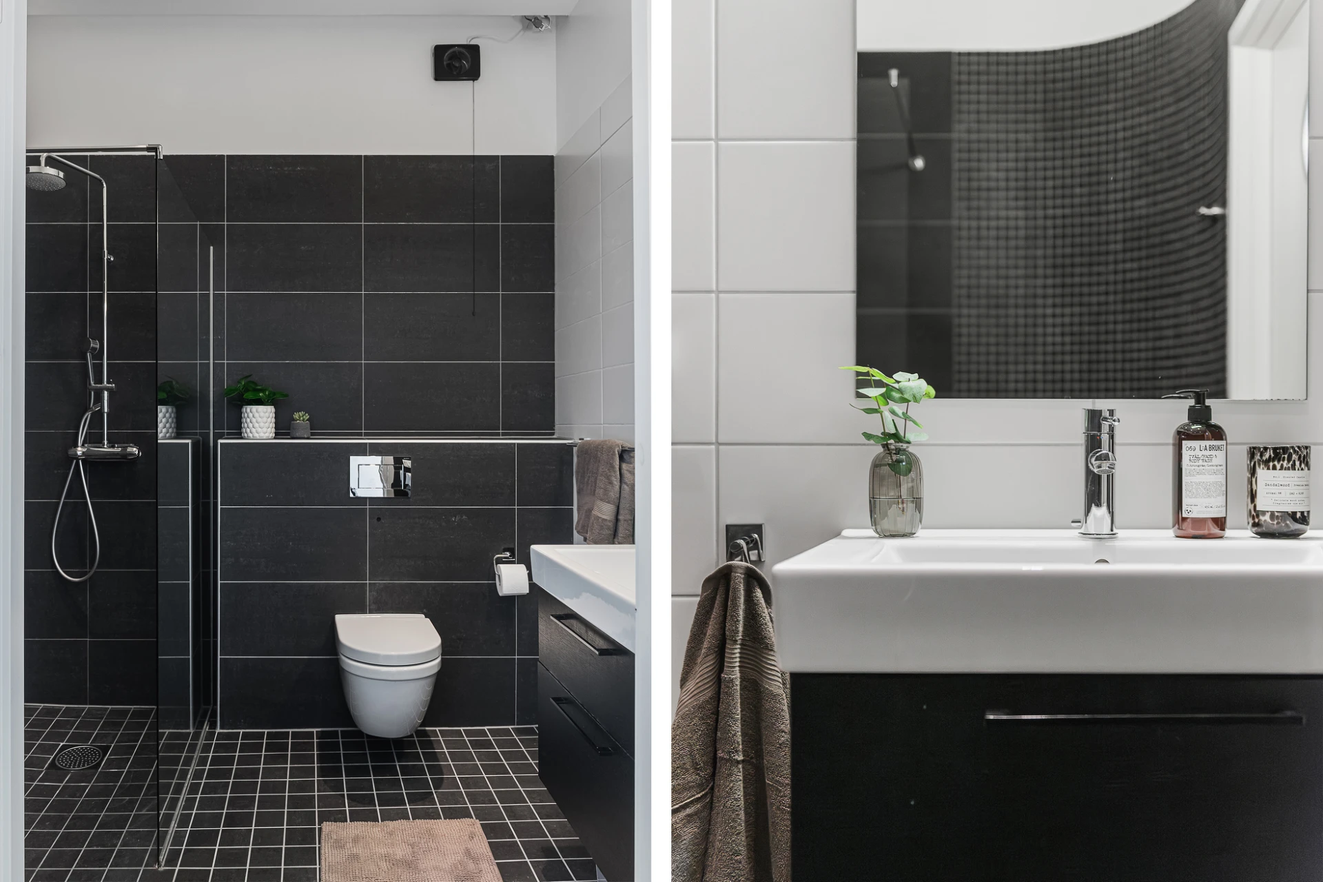 Svart klinker och svart samt vitt kakel. Spotlights i tak. vägghängd WC, handfat med kommod, spegel och takdusch med duschvägg.