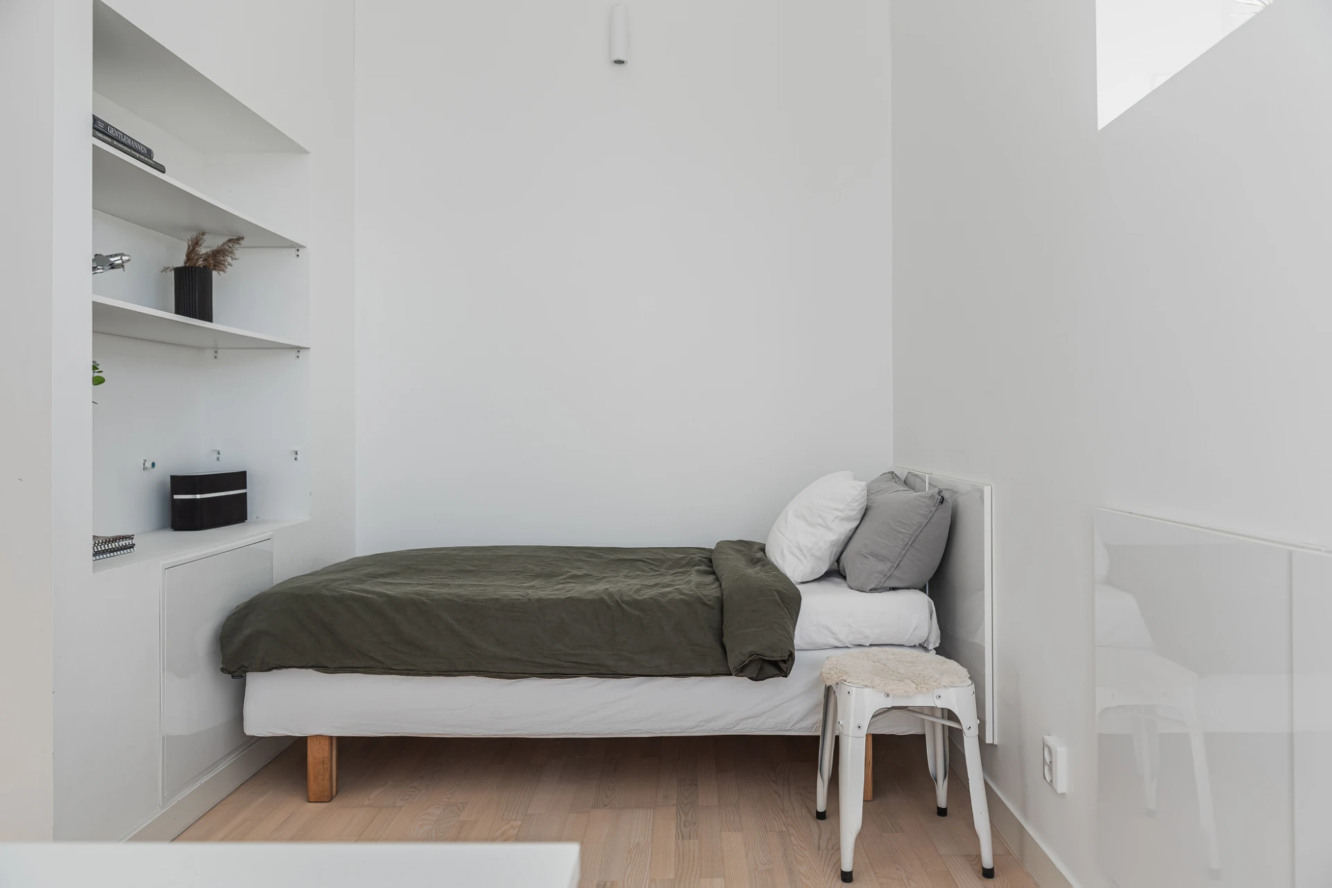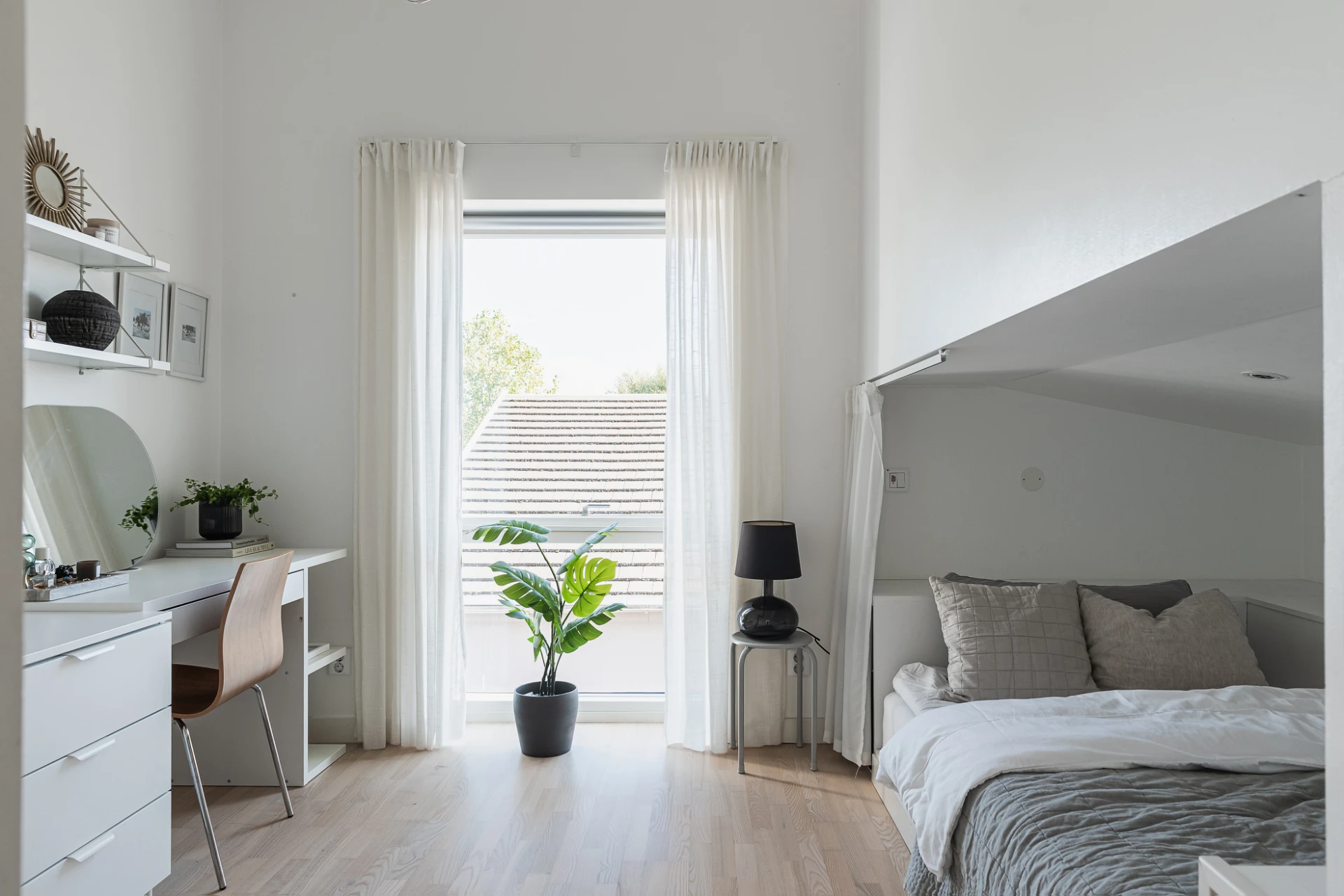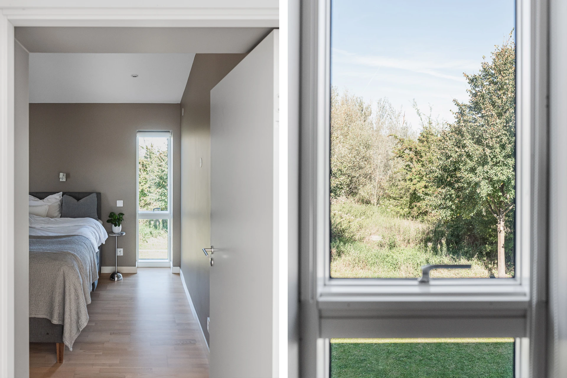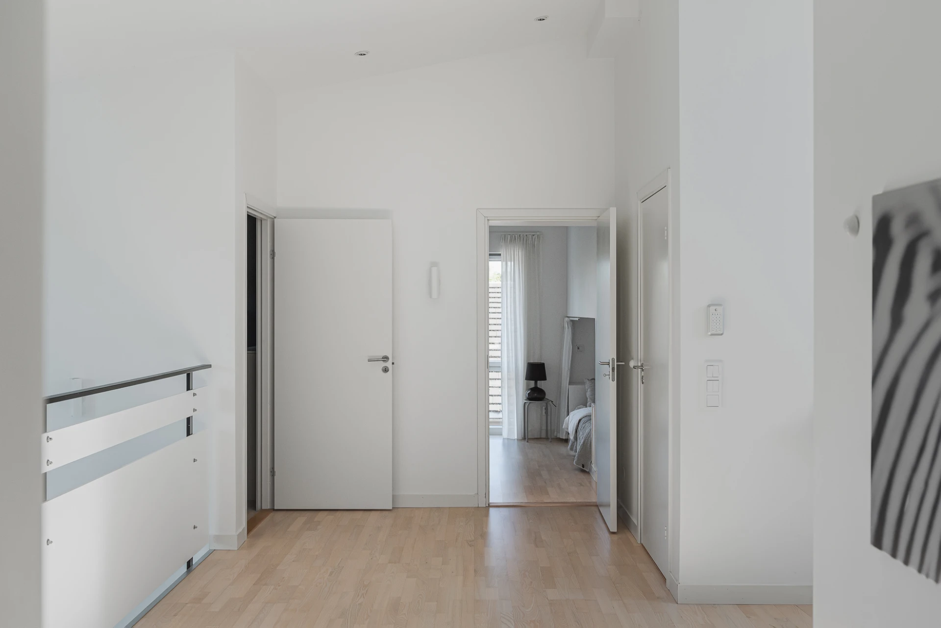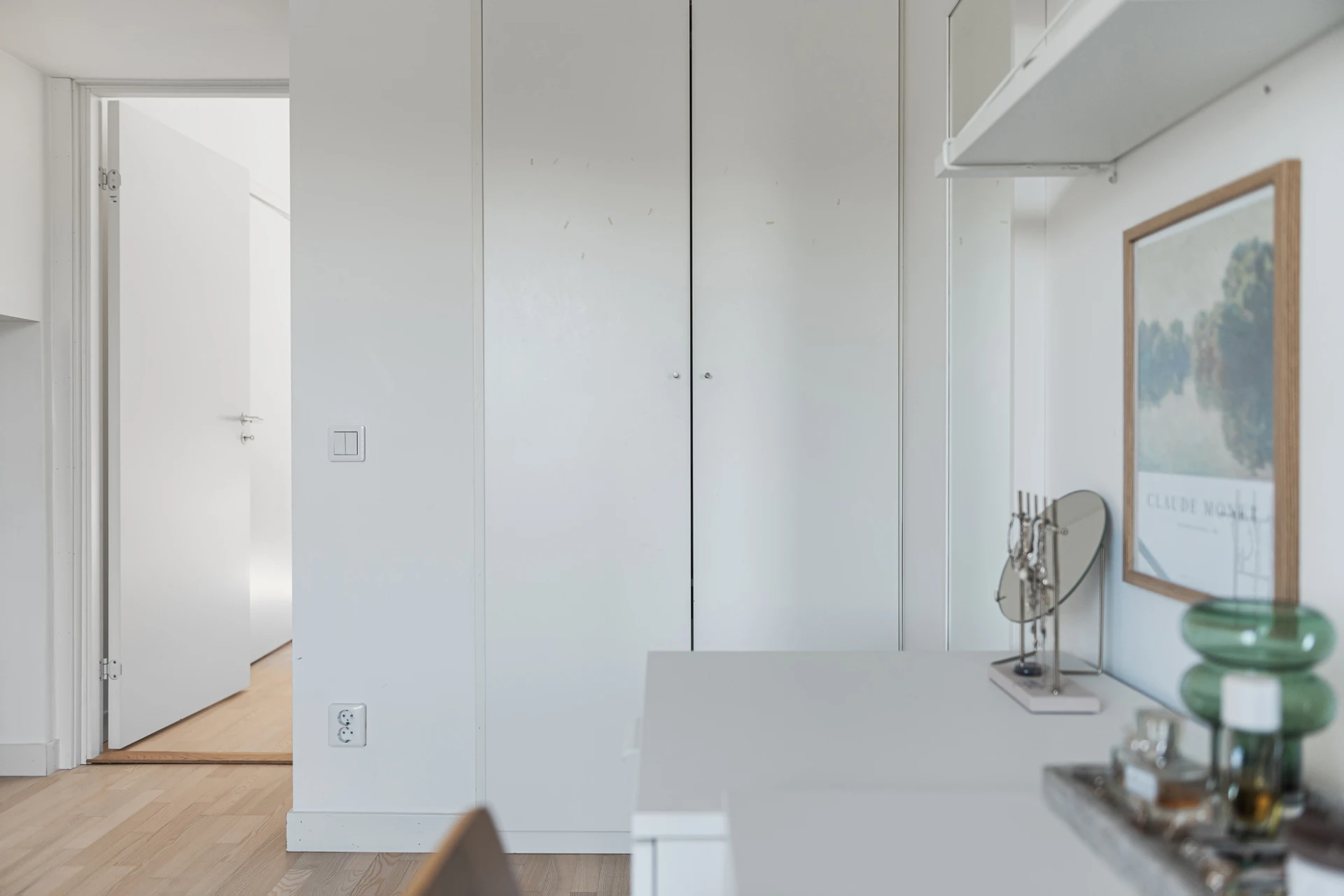 Laminatgolv och vita väggar samt spotlights i tak. Garderober och sängalkov.