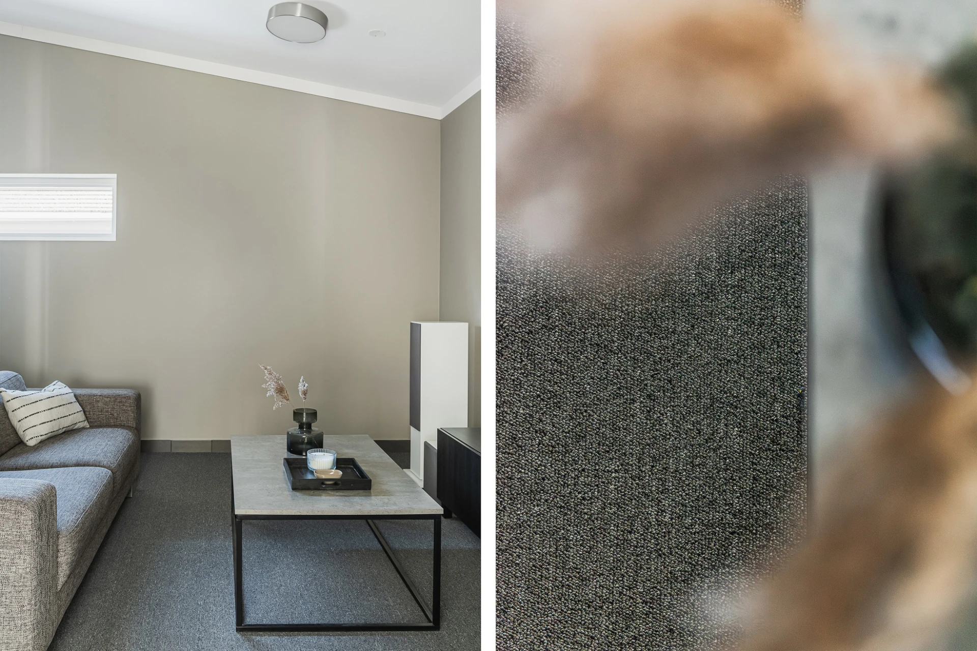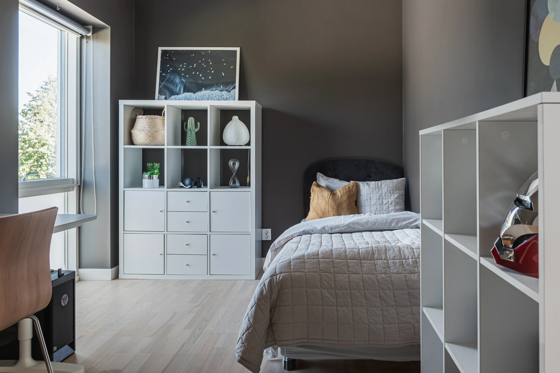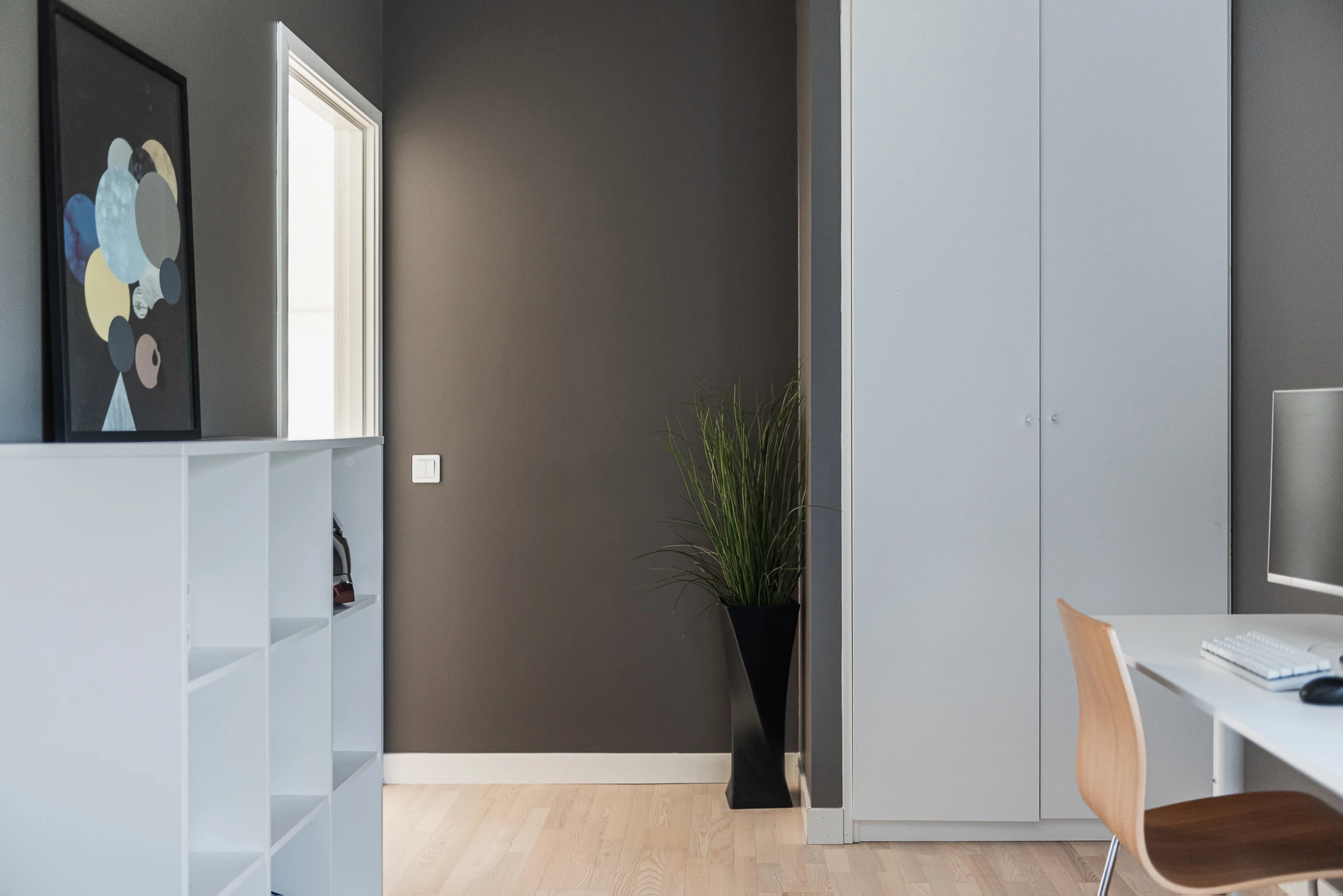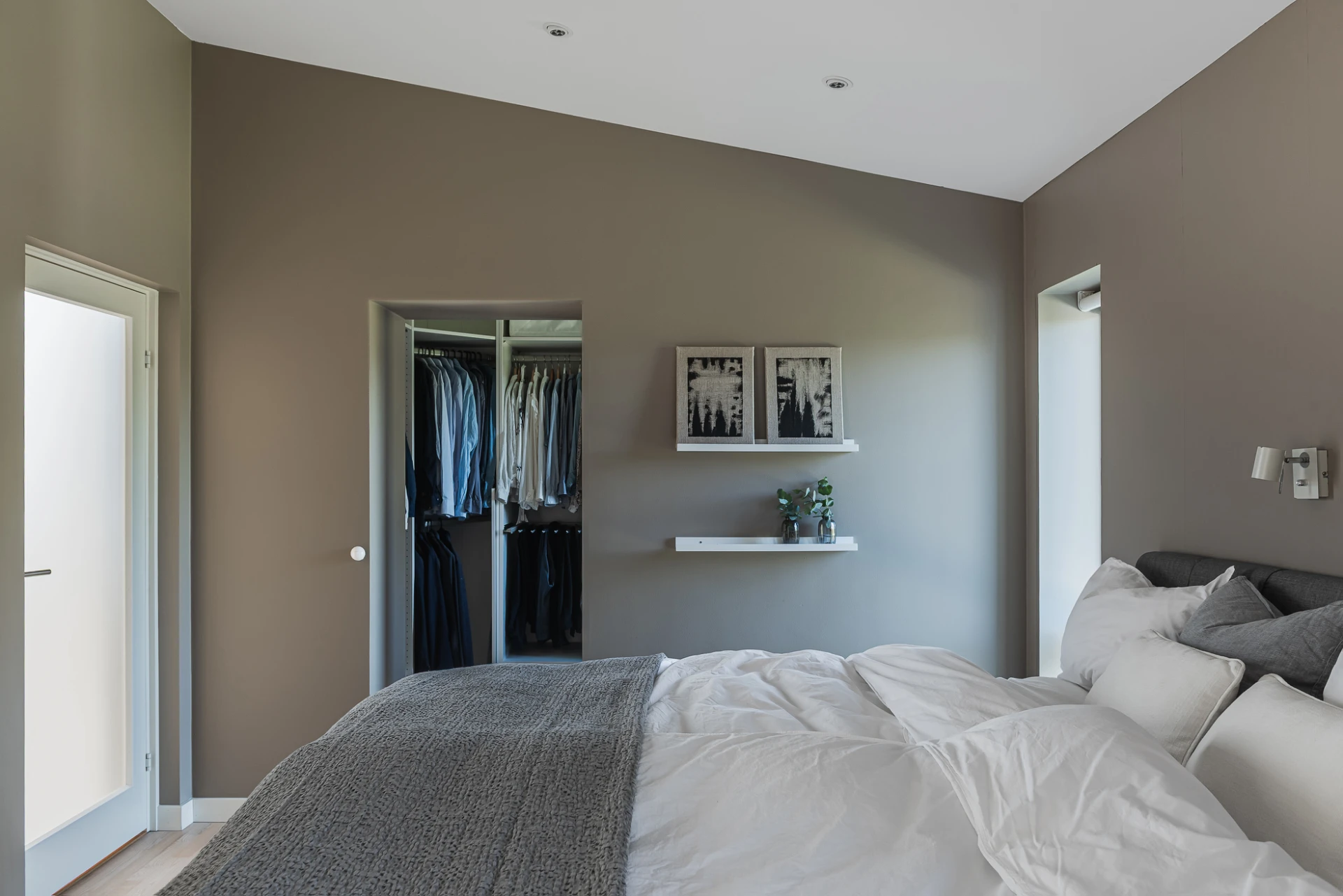 Laminatgolv och mörkgrå väggar samt spotlights i tak. Garderober.