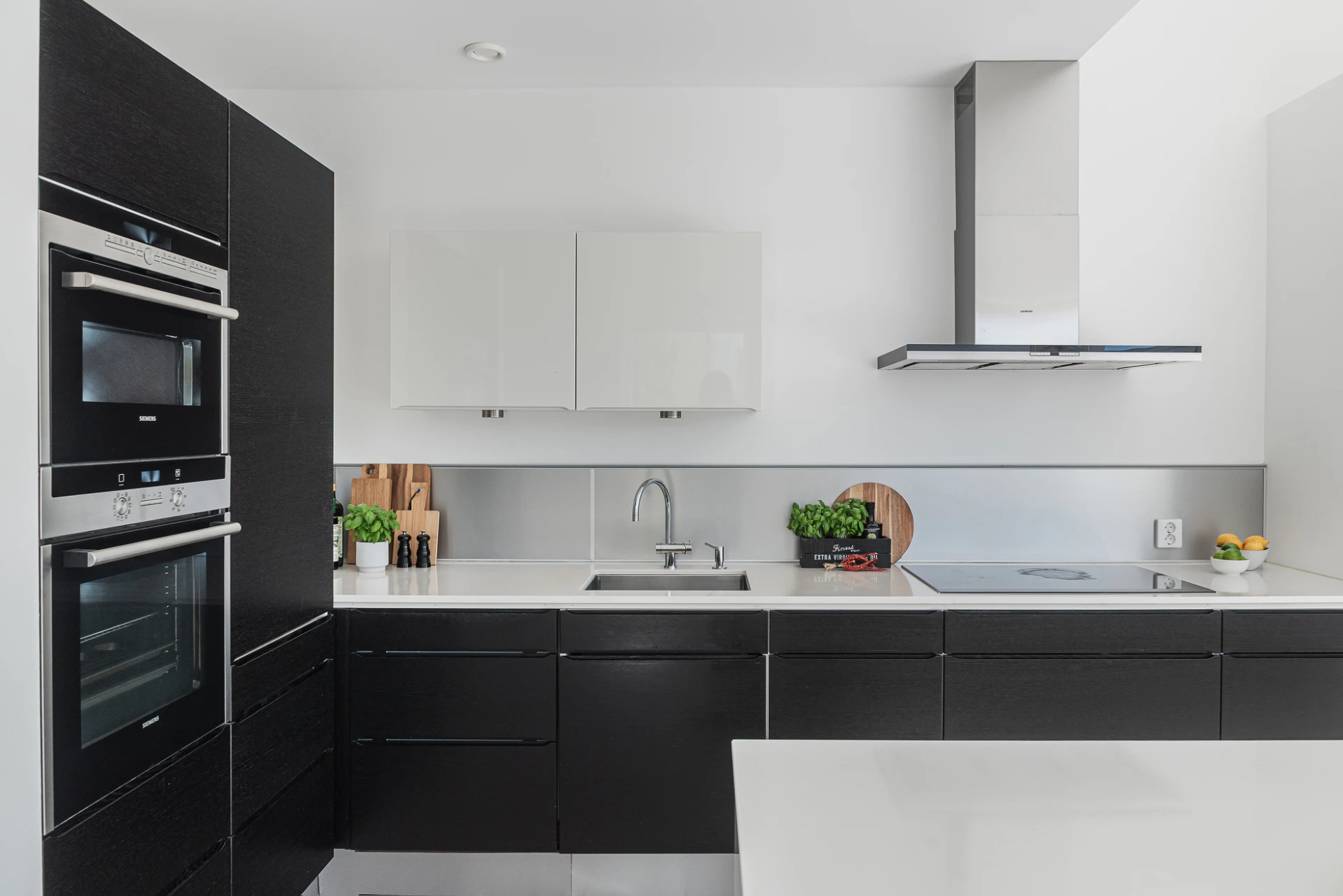 Grå klinker och vita väggar samt spotlights i tak. Köksinredning i svart och vitt samt aluminiumskiva som stänkskydd ovan ljus stenkomposit. Dubbel kyl/frys, induktionshäll, inbyggd ugn och mikrovågsugn, diskmaskin samt fläkt. Samtliga vitvaror är från Siemens 2012. Utgång till uteplats i sydväst.