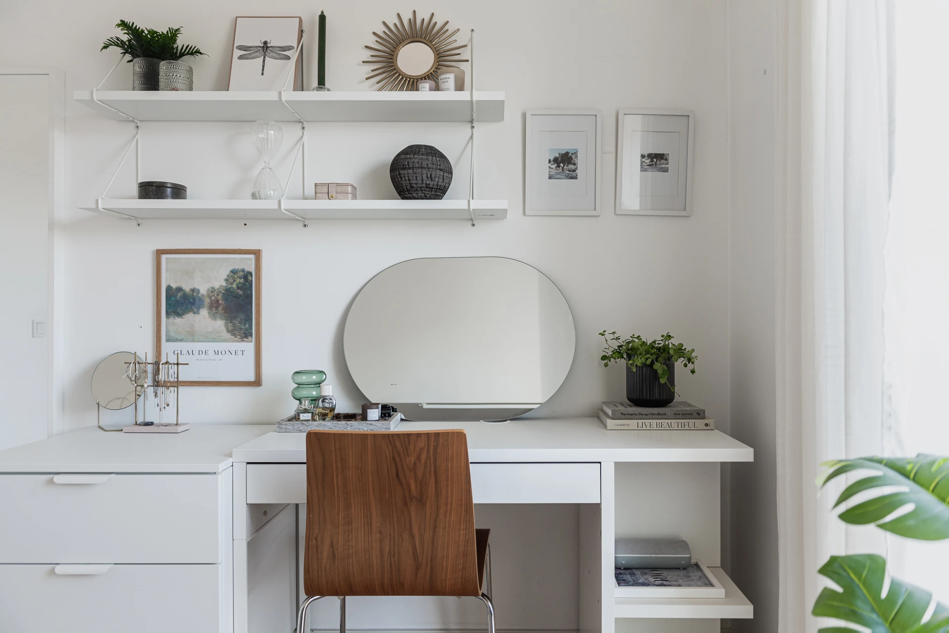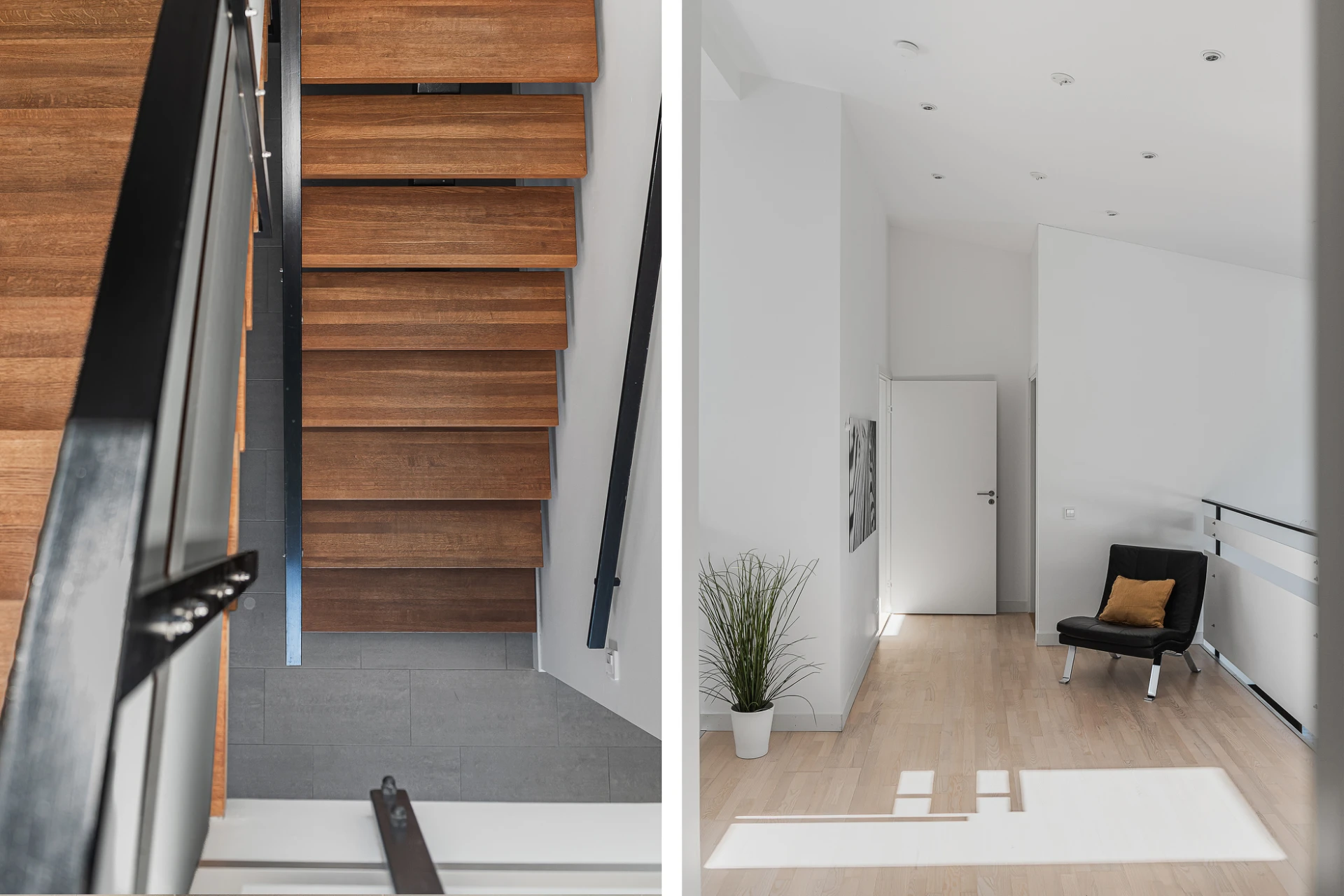 Laminatgolv och vita väggar. Spotlights i tak och öppet ner.