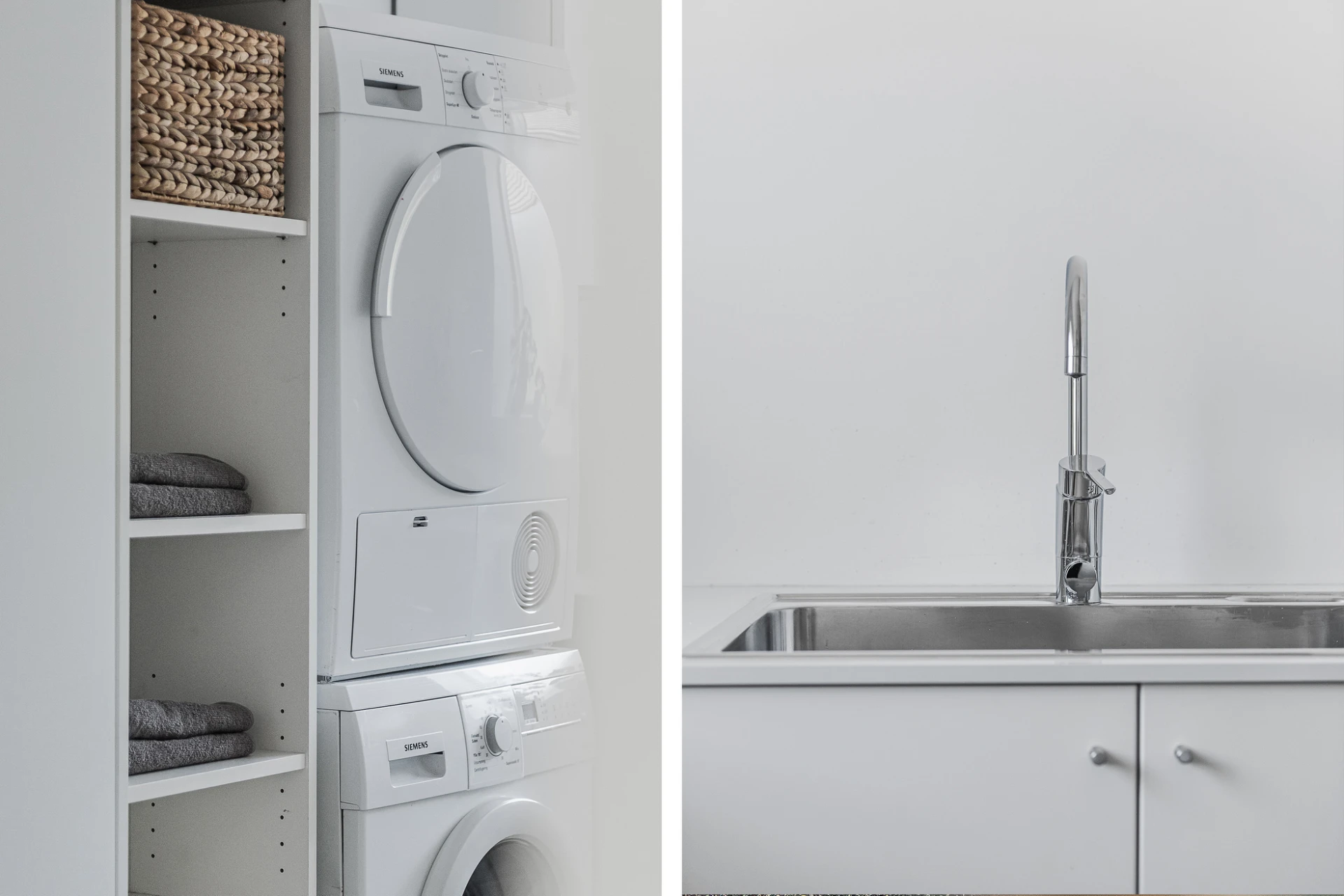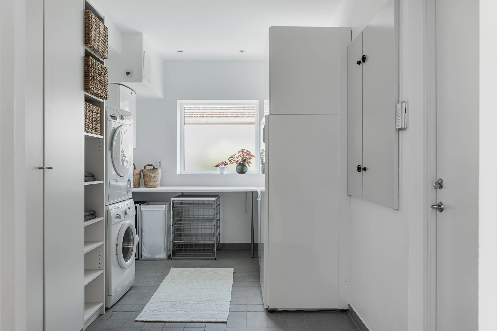 Grå klinker och vita väggar samt spotlights i tak. Skåpsförvaring, tvättpelare, varmvattenberedare, vask och avlastningsyta.