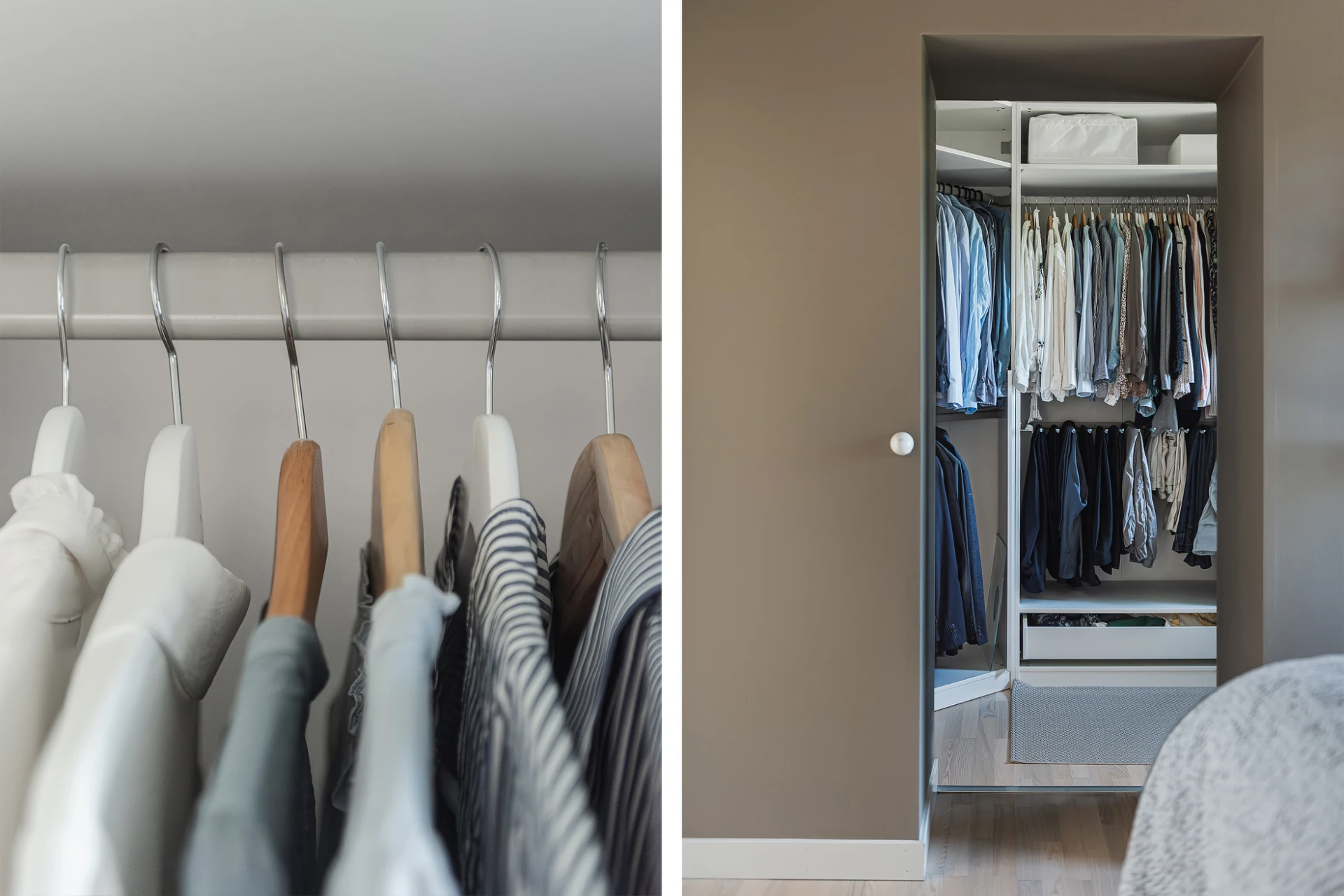 Grå klinker och vita väggar samt spotlights i tak. Klädkammare och inbyggd garderob bakom skjutdörrar.