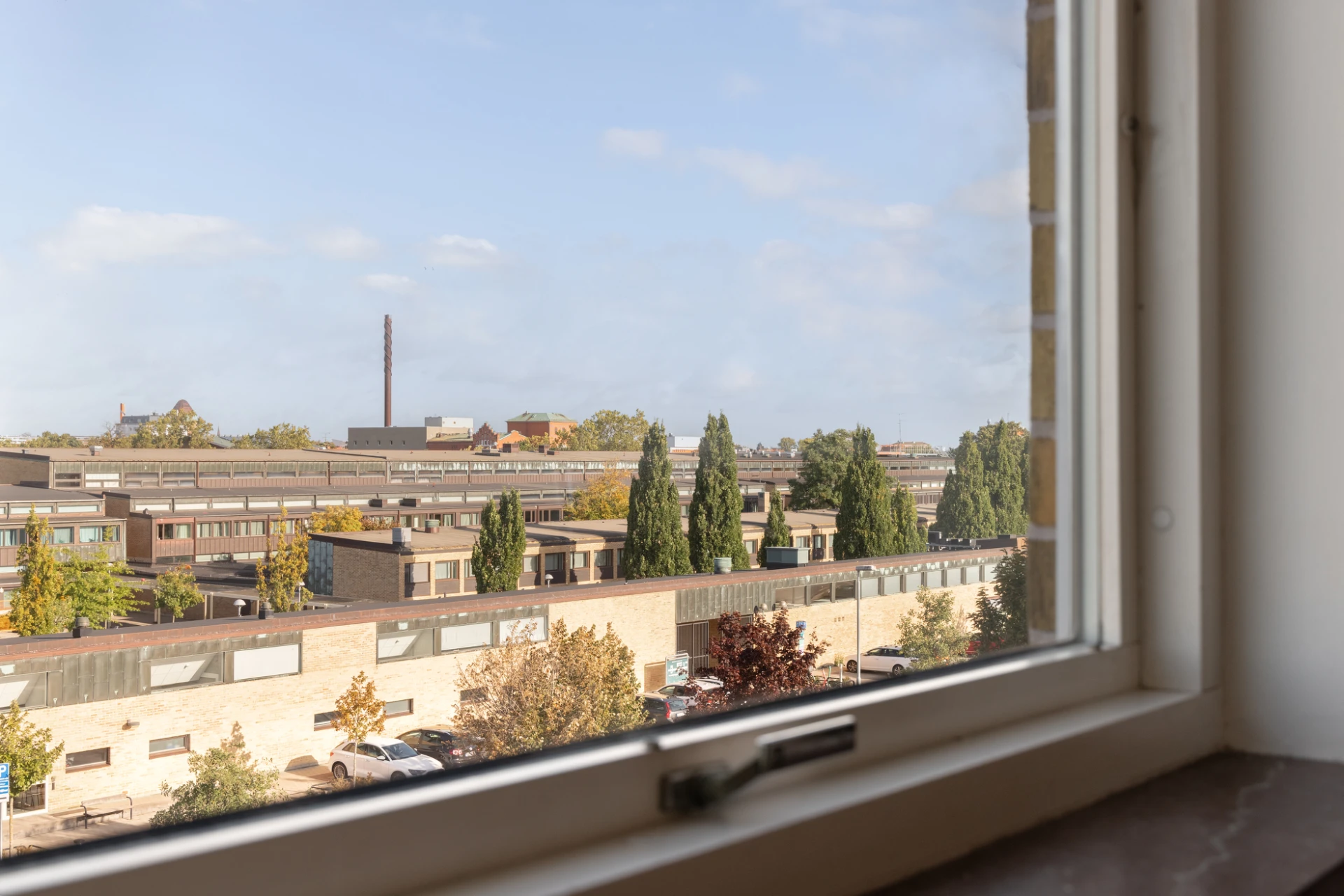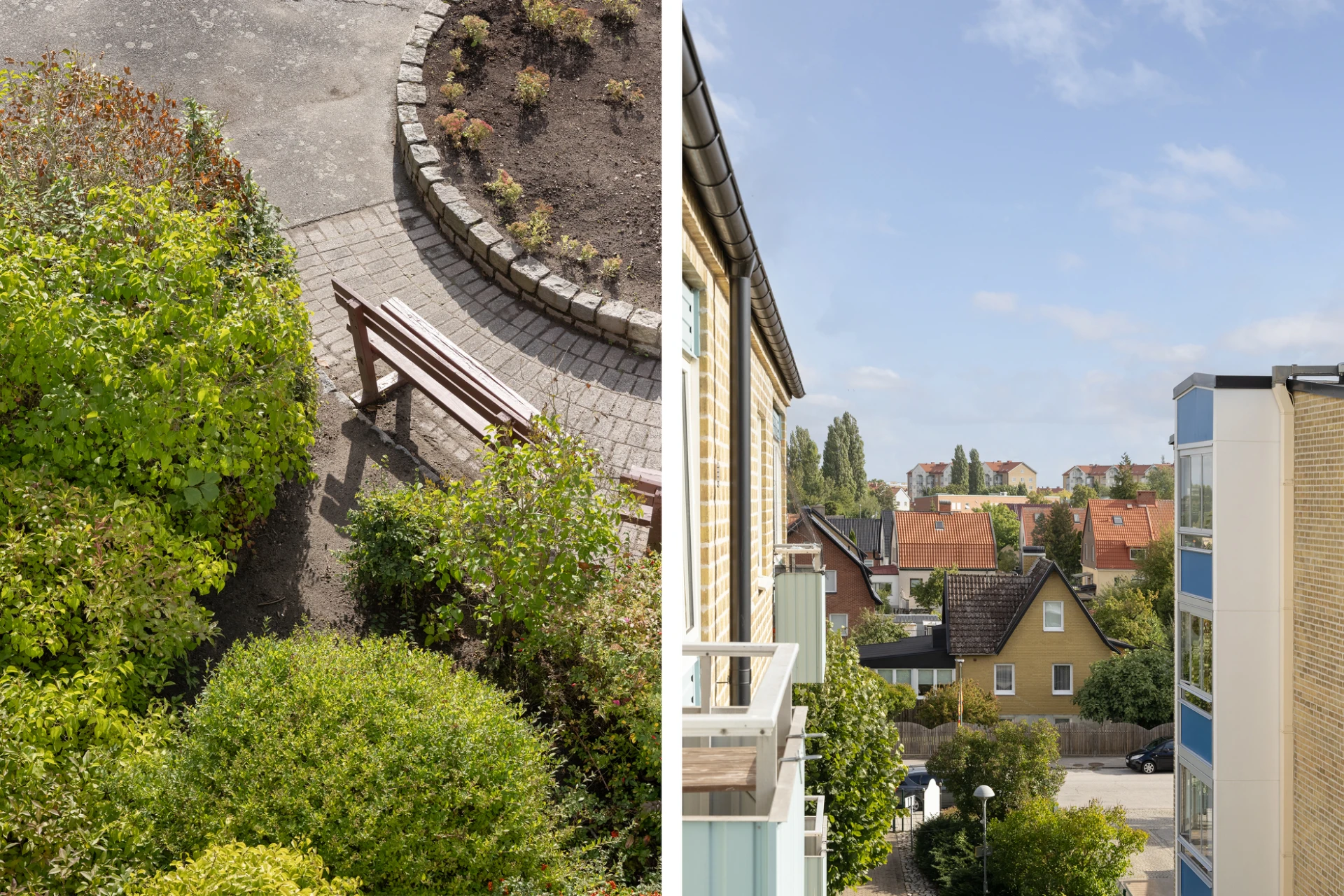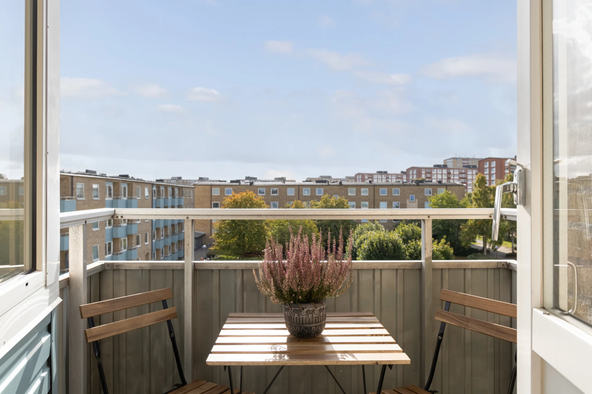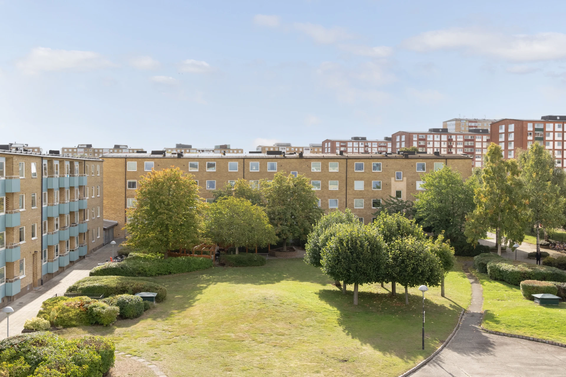 Högst upp i huset väntar denna trivsamma tvåa med en härligt luftig vy över omgivningarna! Här möts du av en välplanerad bostad med genomgående planlösning och nymålade ytskikt från 2025 som skapar en fräsch och inbjudande känsla. Vardagsrummet utmärks av de charmiga fönstren i vinkel som låter ljuset flöda in och ger rummet en luftig karaktär. Härifrån nås även balkongen i soligt sydostläge, en underbar plats att njuta av soluppgången, dagens första kaffekopp eller avkopplande stunder mot den lugna gården. I det rymliga köket kan kvällsmiddagarna avnjutas medan solen sänker sig över horisonten. Bostadens planlösning är genomtänkt in i minsta detalj vilket gör att varje kvadratmeter nyttjas på bästa sätt och förvaringen är väl omhändertagen med praktiska förvaringslösningar i hallen som gör det enkelt att hålla ordning. Utanför porten väntar föreningens grönskande och helt inhägnade gård och på gångavstånd finns Mobilia köpcentrum med all tänkbar shopping och service. Varmt välkommen hem!