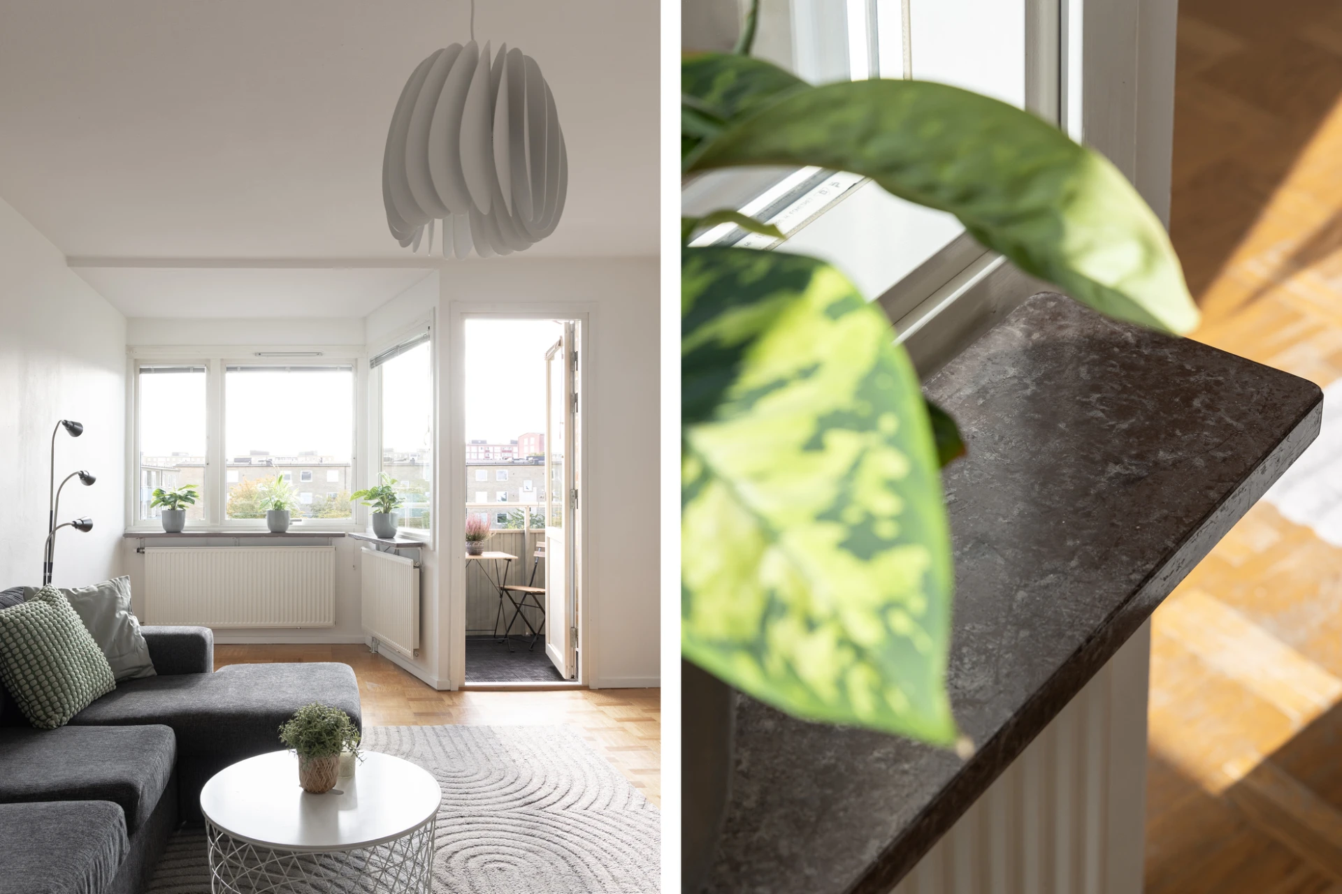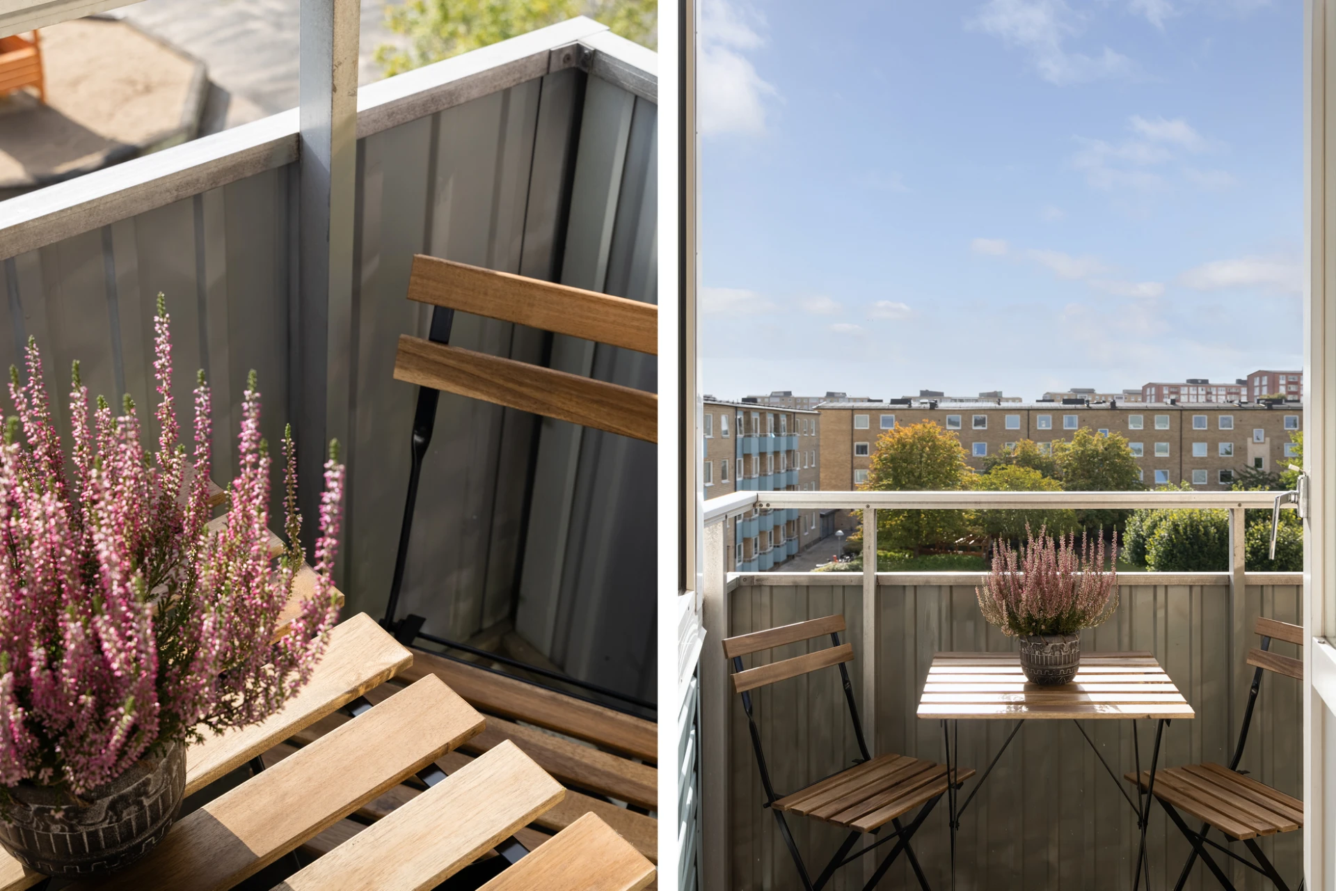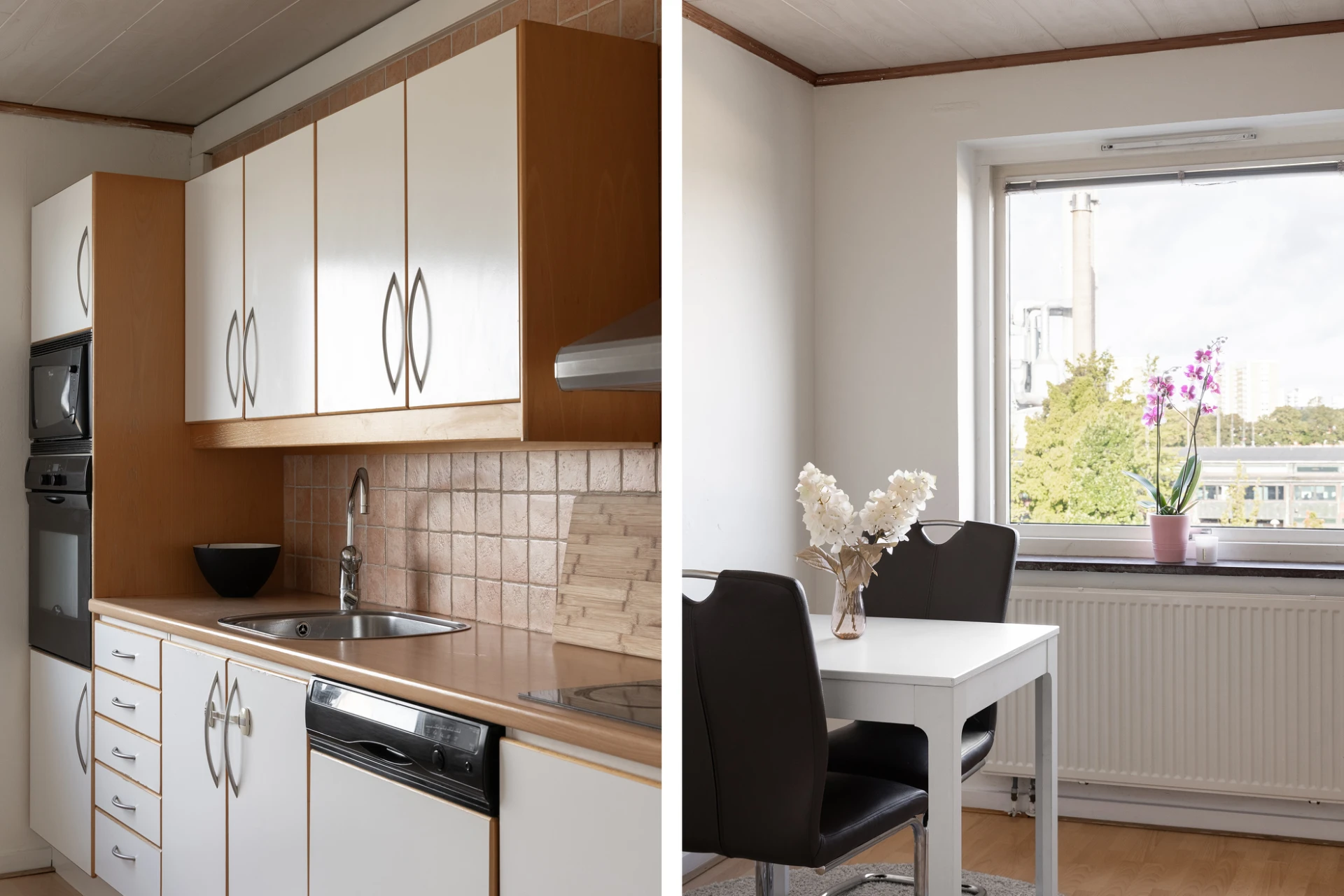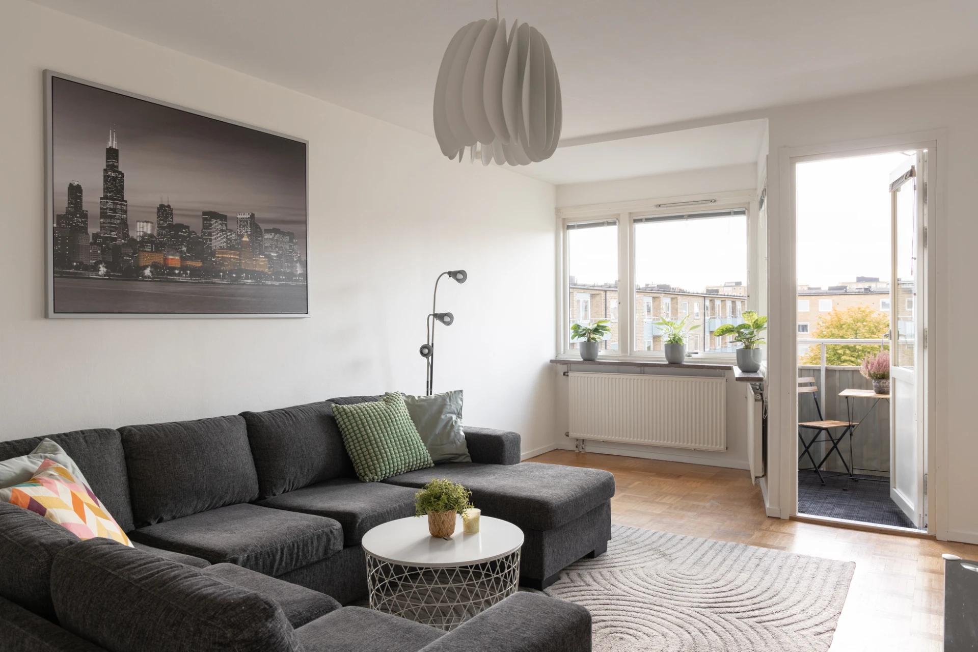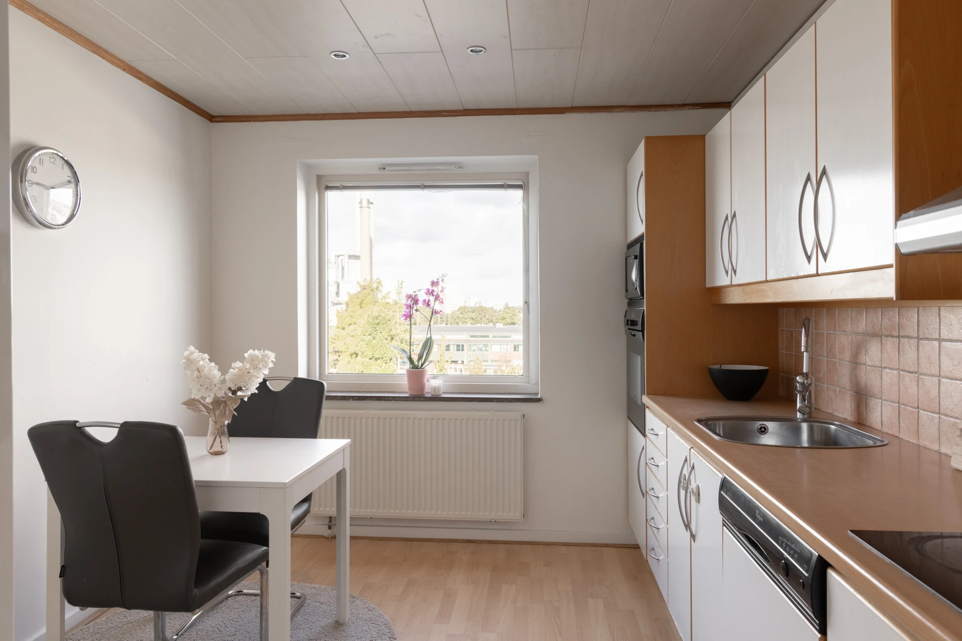 Högst upp i huset väntar denna trivsamma tvåa med en härligt luftig vy över omgivningarna! Här möts du av en välplanerad bostad med genomgående planlösning och nymålade ytskikt från 2025 som skapar en fräsch och inbjudande känsla. Vardagsrummet utmärks av de charmiga fönstren i vinkel som låter ljuset flöda in och ger rummet en luftig karaktär. Härifrån nås även balkongen i soligt sydostläge, en underbar plats att njuta av soluppgången, dagens första kaffekopp eller avkopplande stunder mot den lugna gården. I det rymliga köket kan kvällsmiddagarna avnjutas medan solen sänker sig över horisonten. Bostadens planlösning är genomtänkt in i minsta detalj vilket gör att varje kvadratmeter nyttjas på bästa sätt och förvaringen är väl omhändertagen med praktiska förvaringslösningar i hallen som gör det enkelt att hålla ordning. Utanför porten väntar föreningens grönskande och helt inhägnade gård och på gångavstånd finns Mobilia köpcentrum med all tänkbar shopping och service. Varmt välkommen hem!