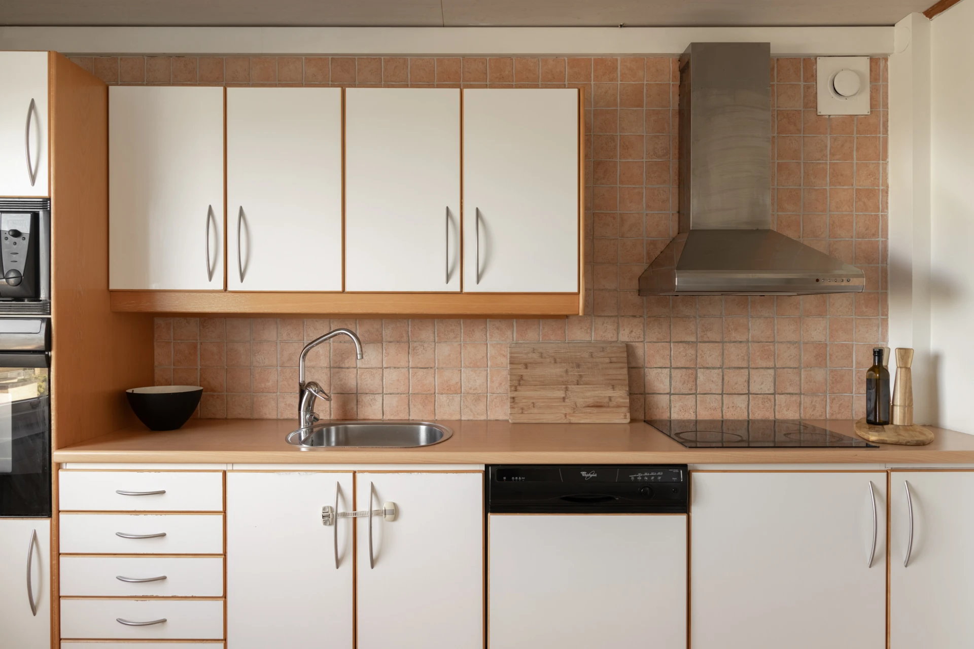 Laminatgolv och ljusa väggar samt spotlights i tak. Vit/träinspirerad köksinredning i fanér och beige kakel ovan arbetsbänk i laminat. Köket är utrustat med inbyggd ugn och mikrovågsugn, diskmaskin, keramisk spishäll, fläkt samt kyl/frys (2024,LG).