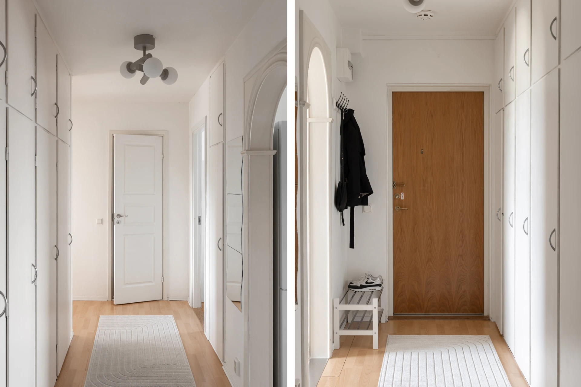 Laminatgolv och ljusa väggar. Inbyggda garderober med överskåp och städskåp.